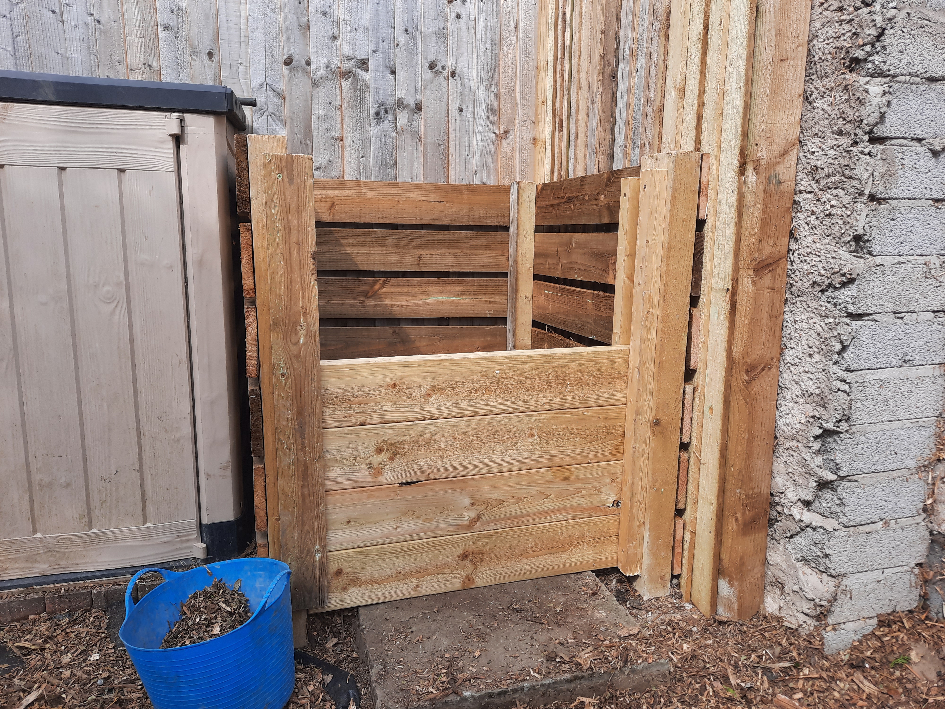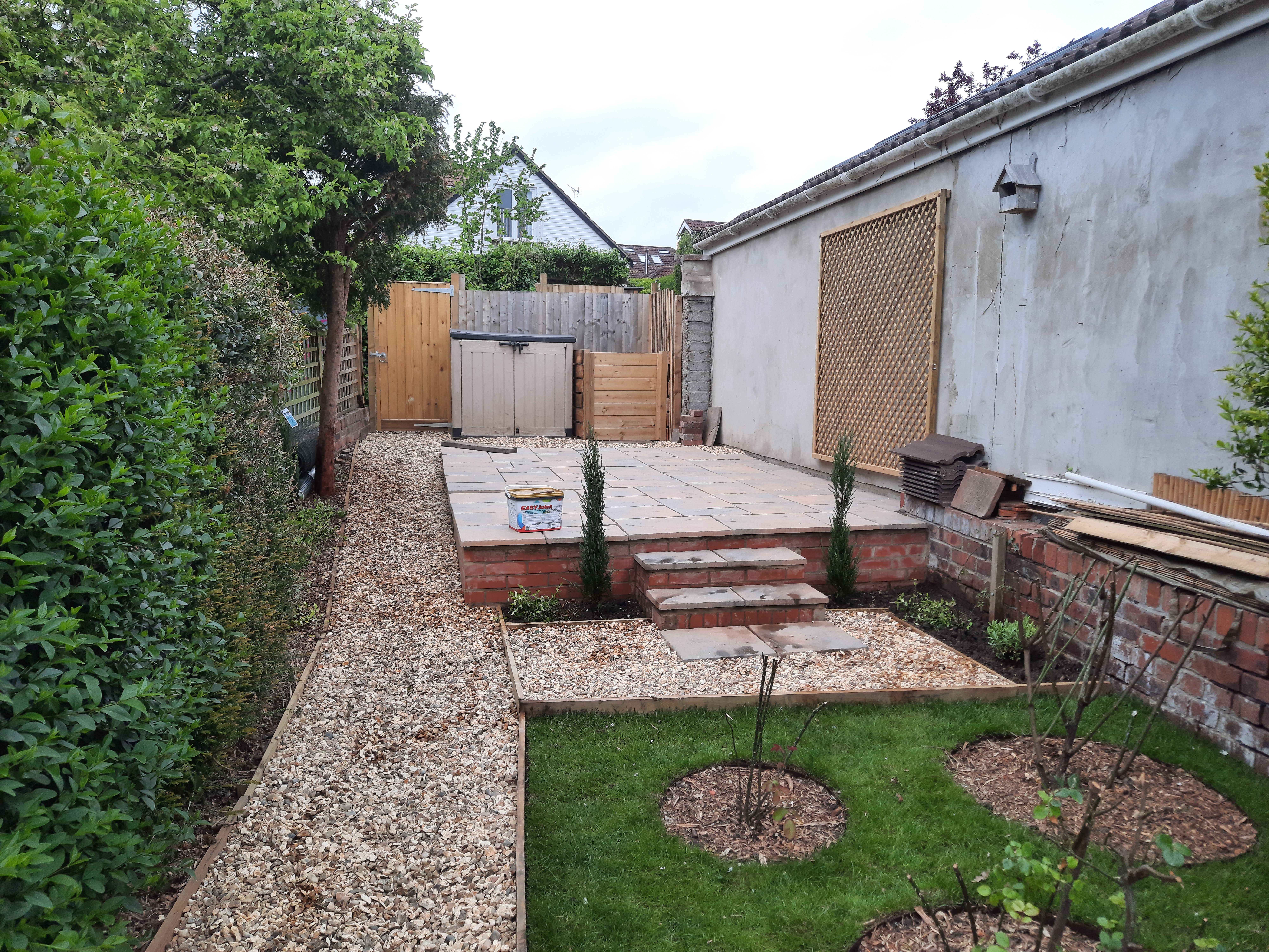 We built a patio on a old garage base, for a summer house, installed trellis and juniper screening. A custom timber compost bay was added to encourage sustainable gardening.