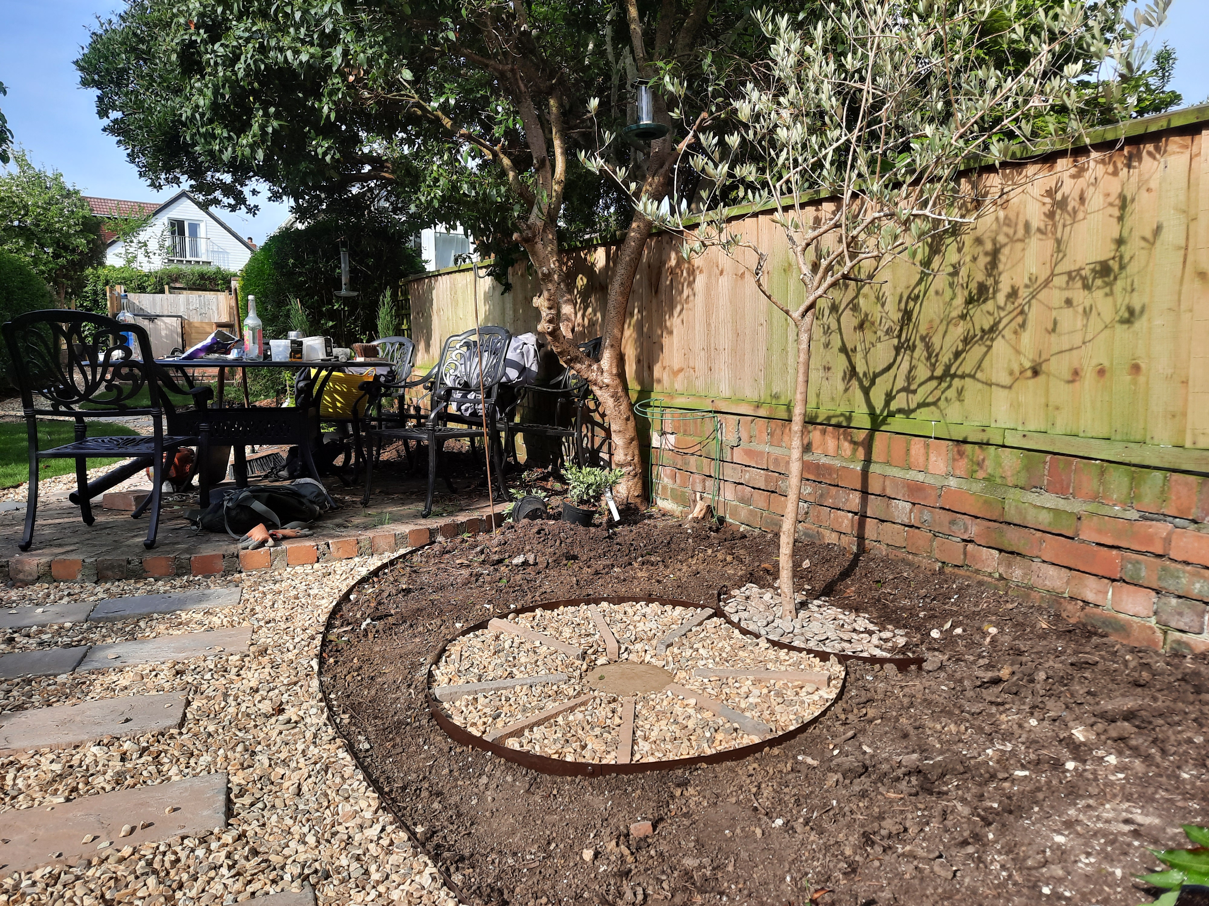 A flowing path with variable width and horizontal in bedded flagstones was conceived, along with a large border on the right, to give a wider sense of space, and immersive, wild feel of cottage garden planting. The circular patio was retained, without the surrounding box shrubs. A focal point in the same style of metal edging and gravel was created for a bird bath in the border adjacent to an olive tree, planted from a large pot.