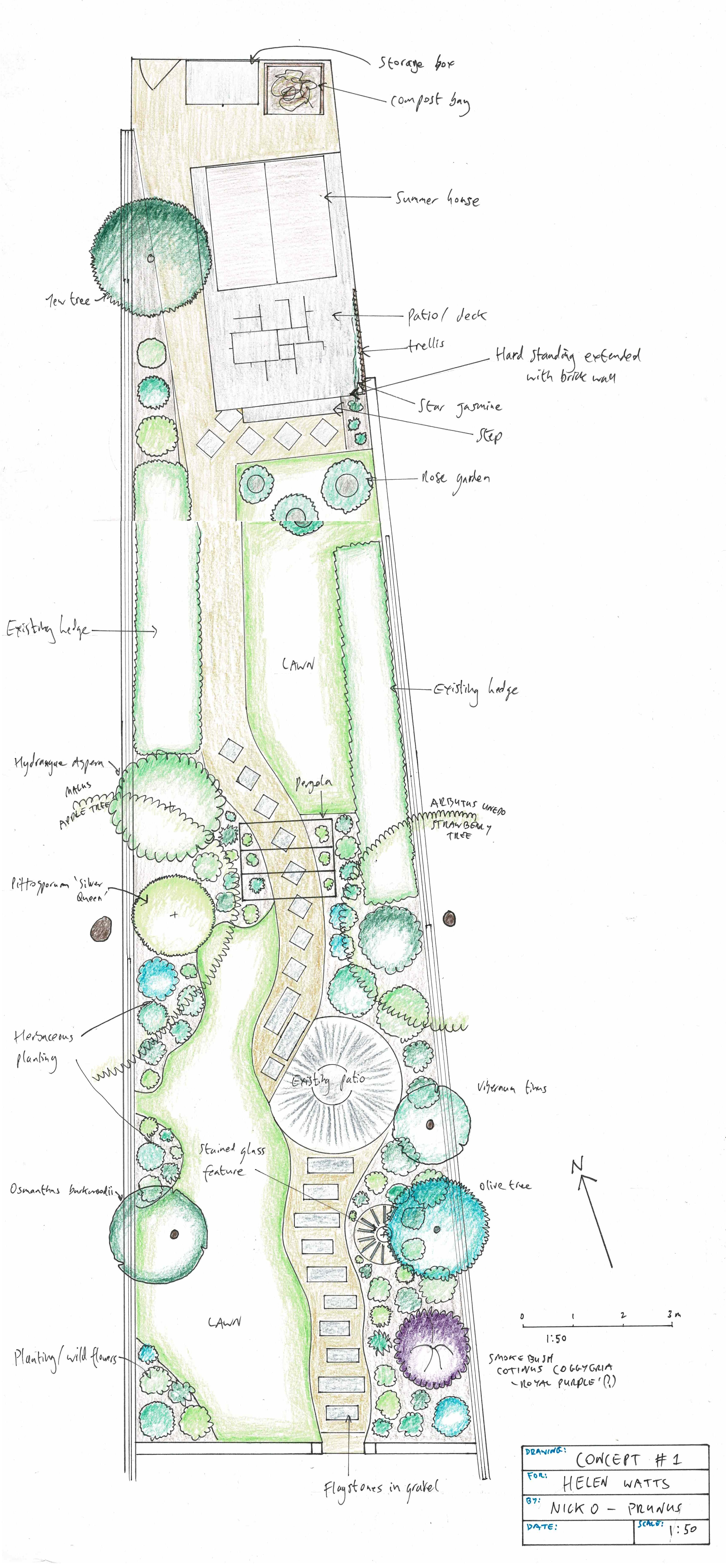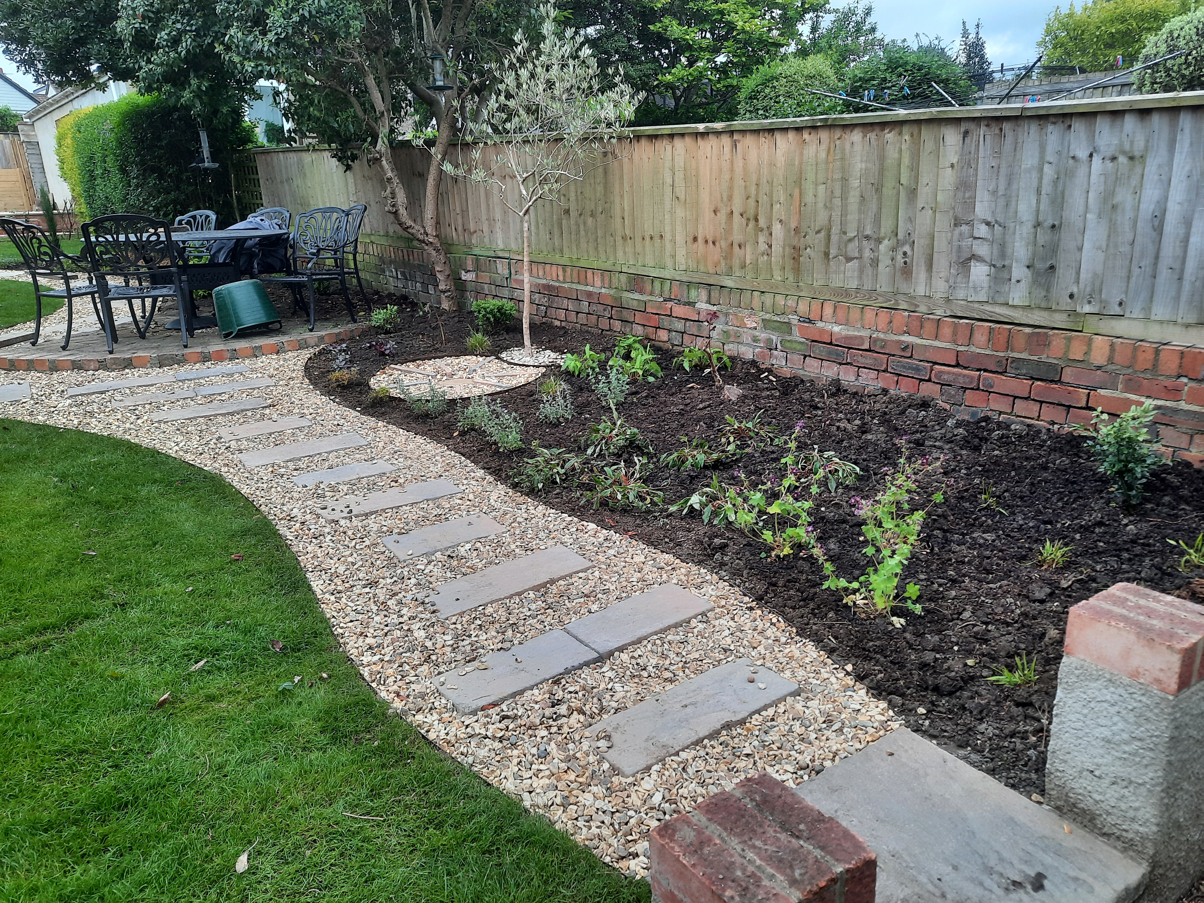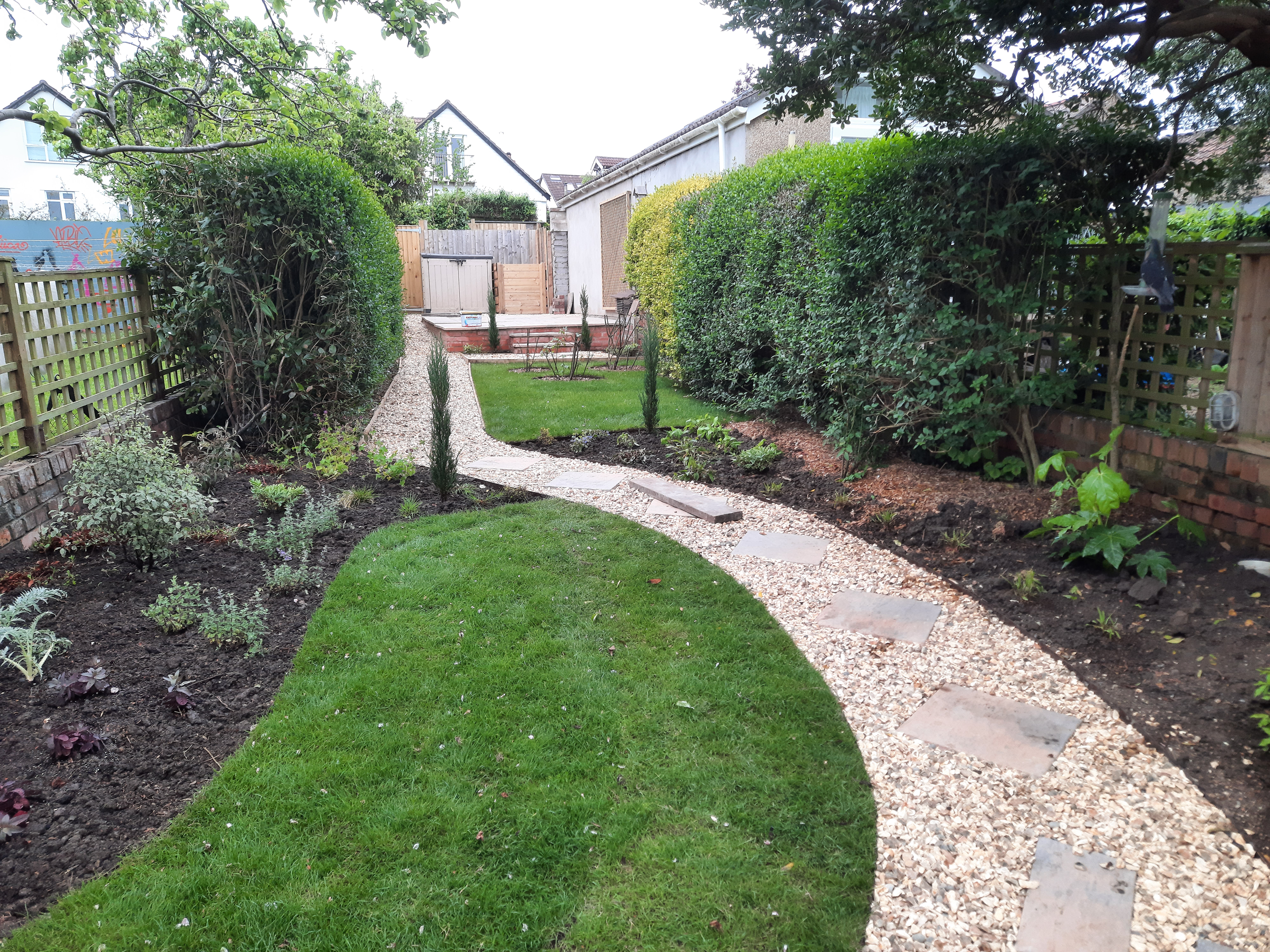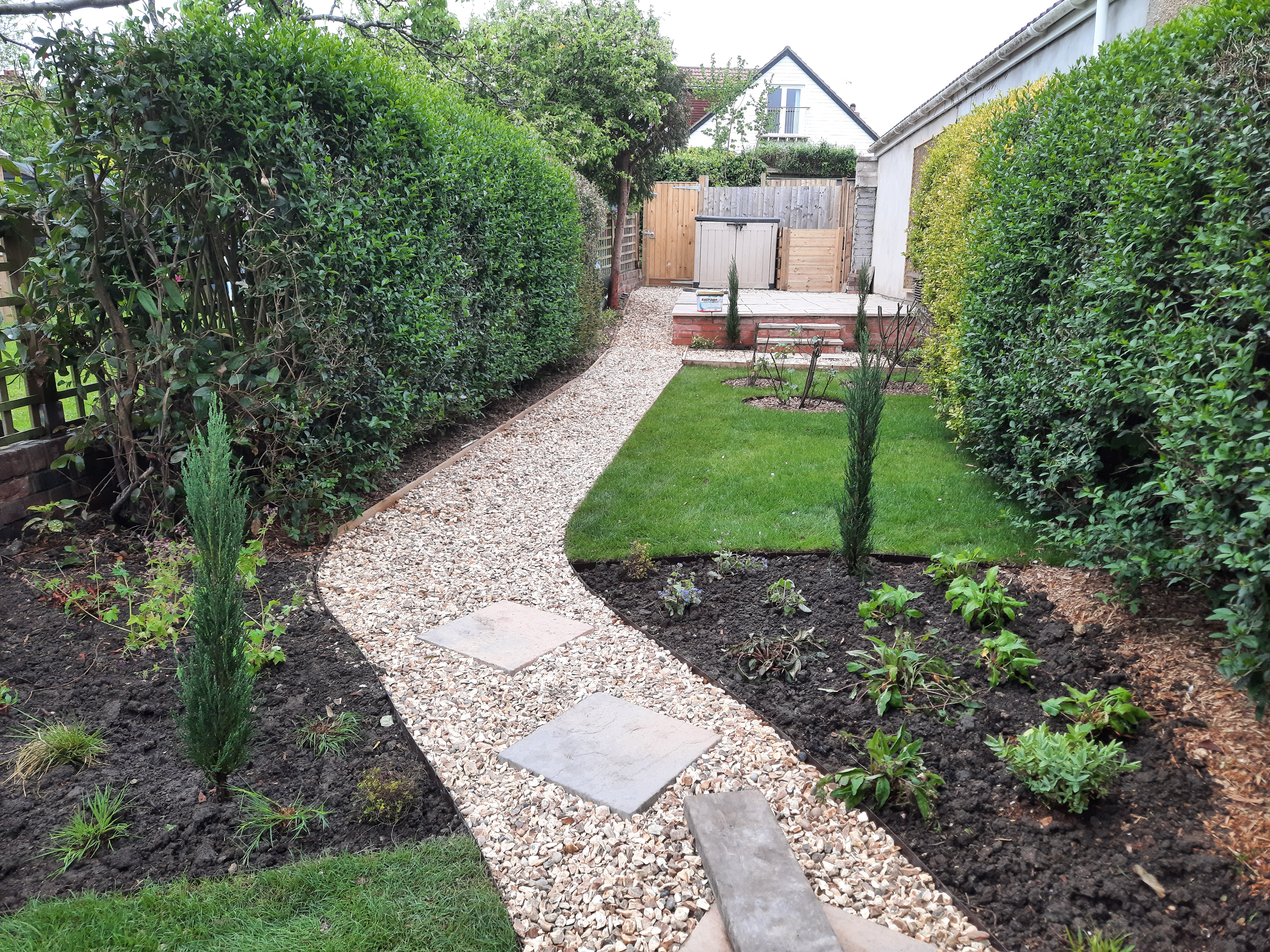 This long and thin, tapering garden called for a significant redesign, shrubs were cleared, old poorly conceived paths removed and the back garden garage base re-landscaped. Our clients wished for a wildlife friendly and a more immersive and aesthetically pleasing garden, to make more of their outdoor space.