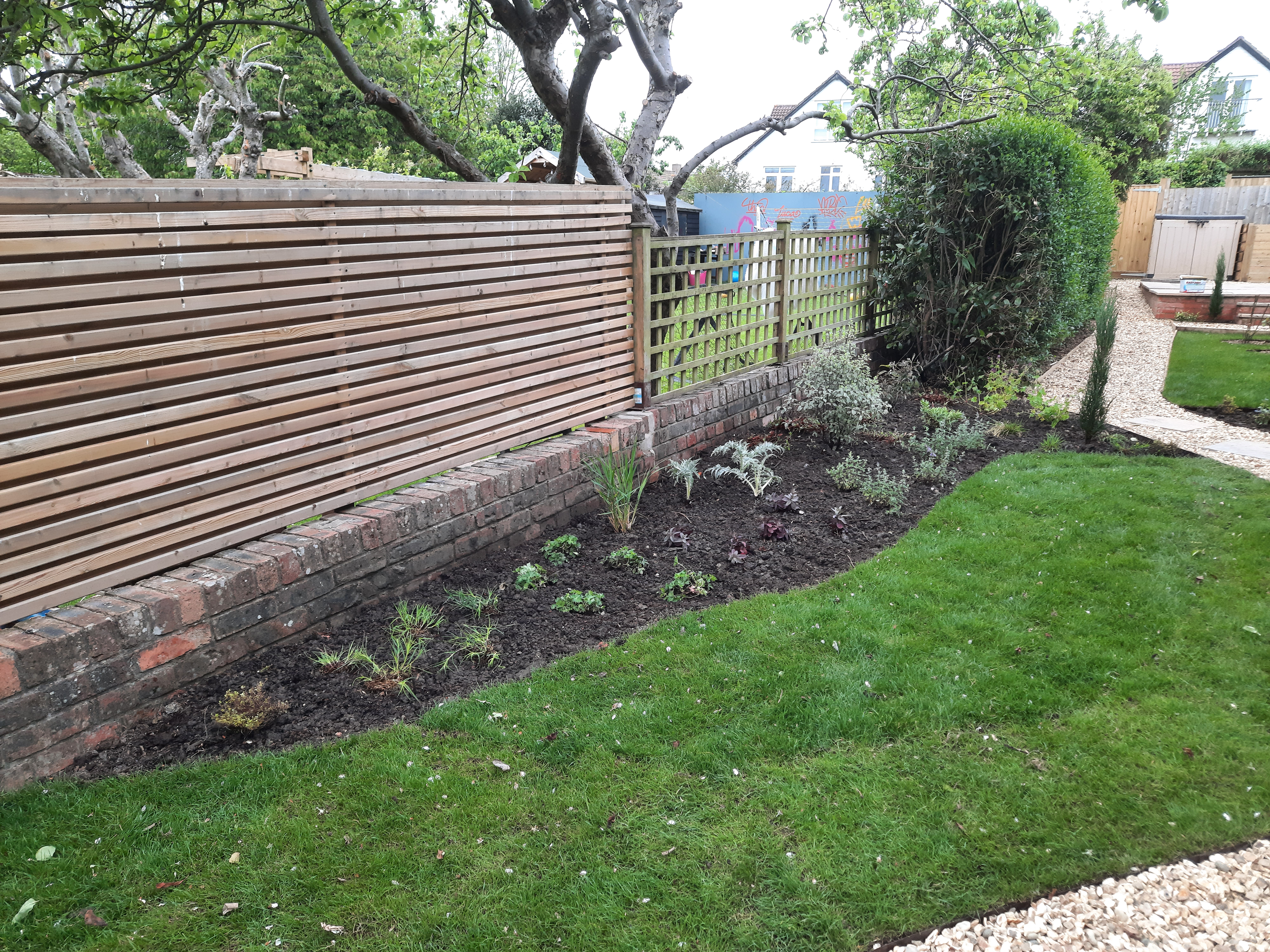 The garden was partitioned in the middle to address the long thin shape and openness, with borders, tall juniper trees and a metal pergola (to be installed at a later date).