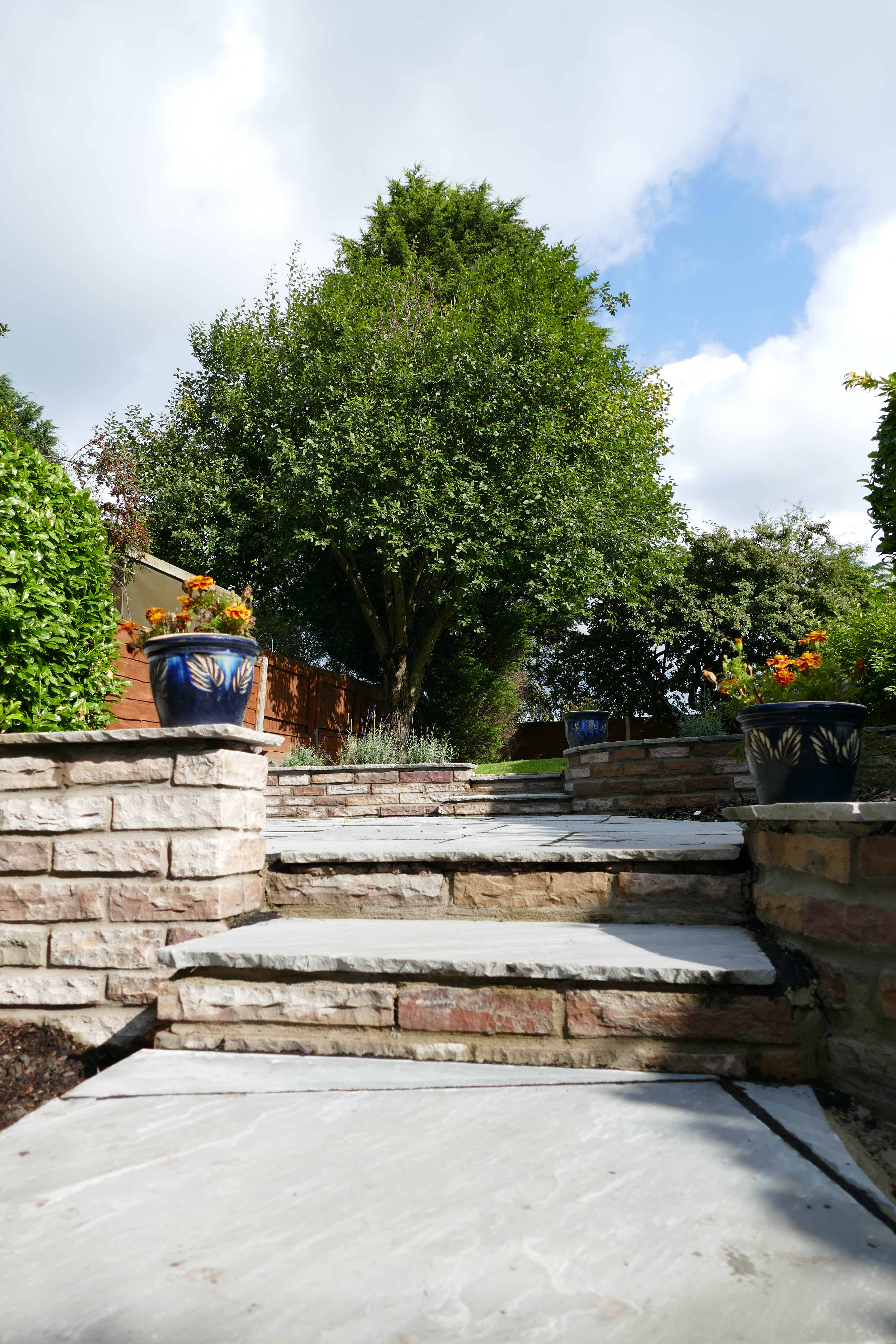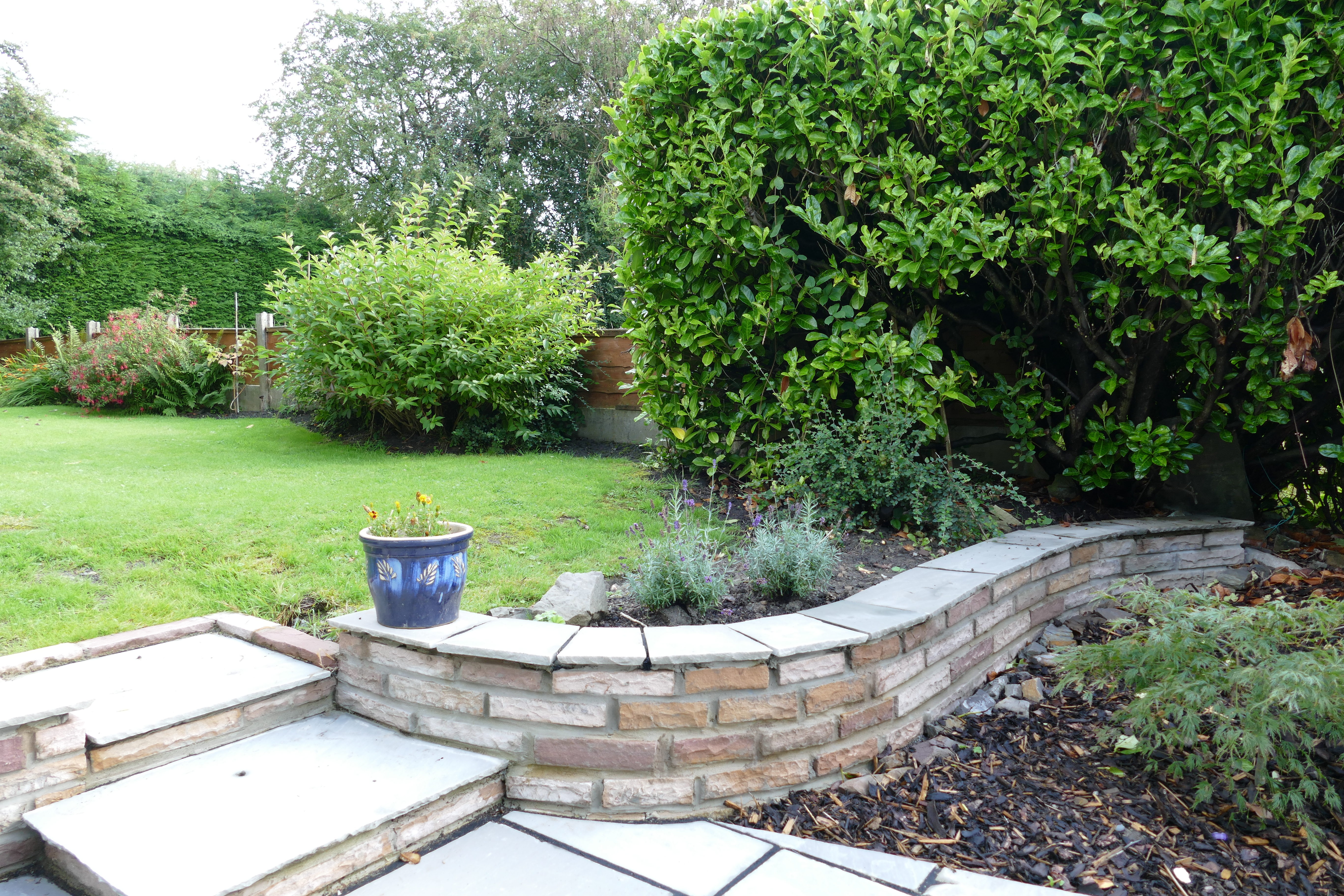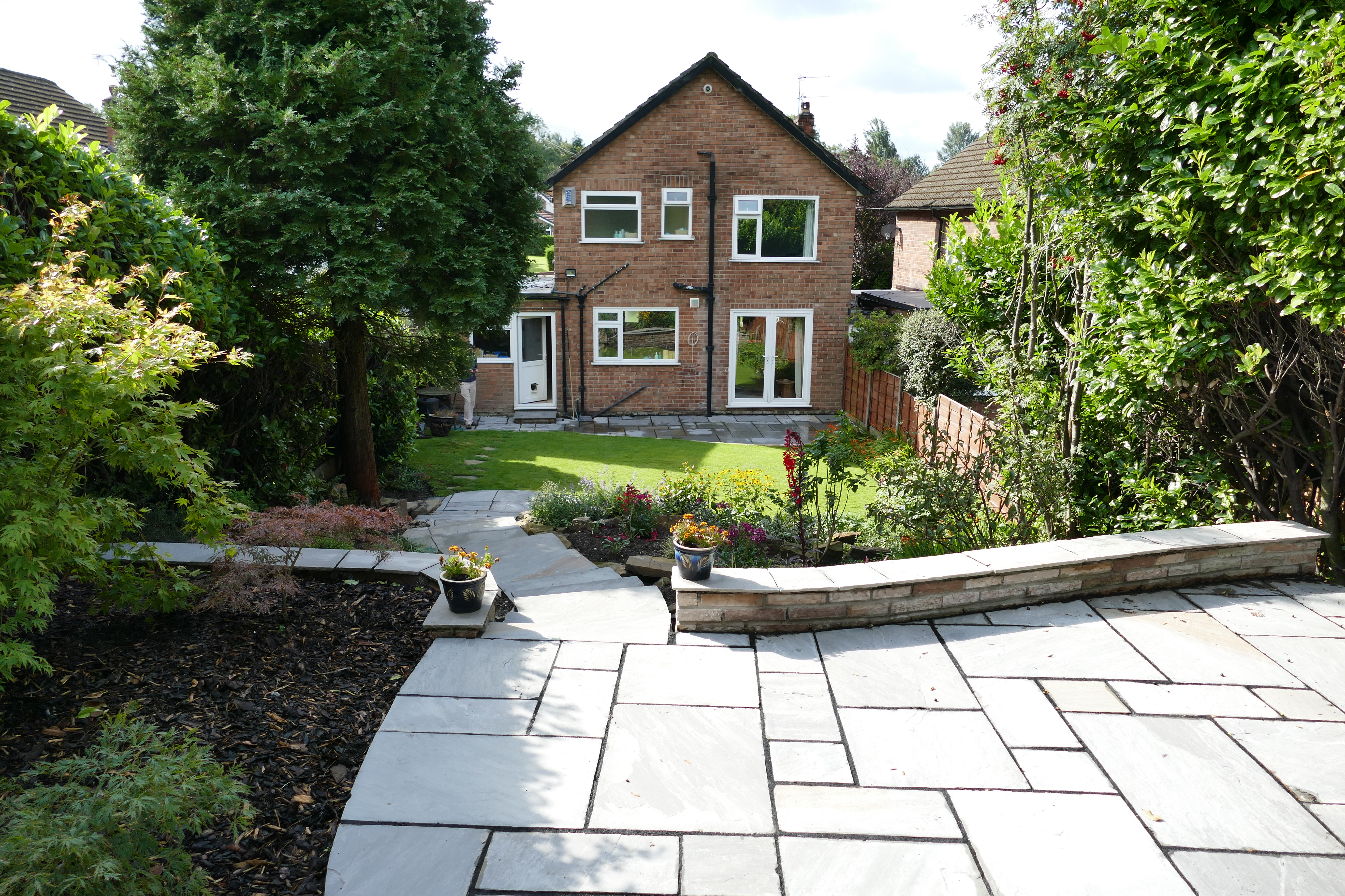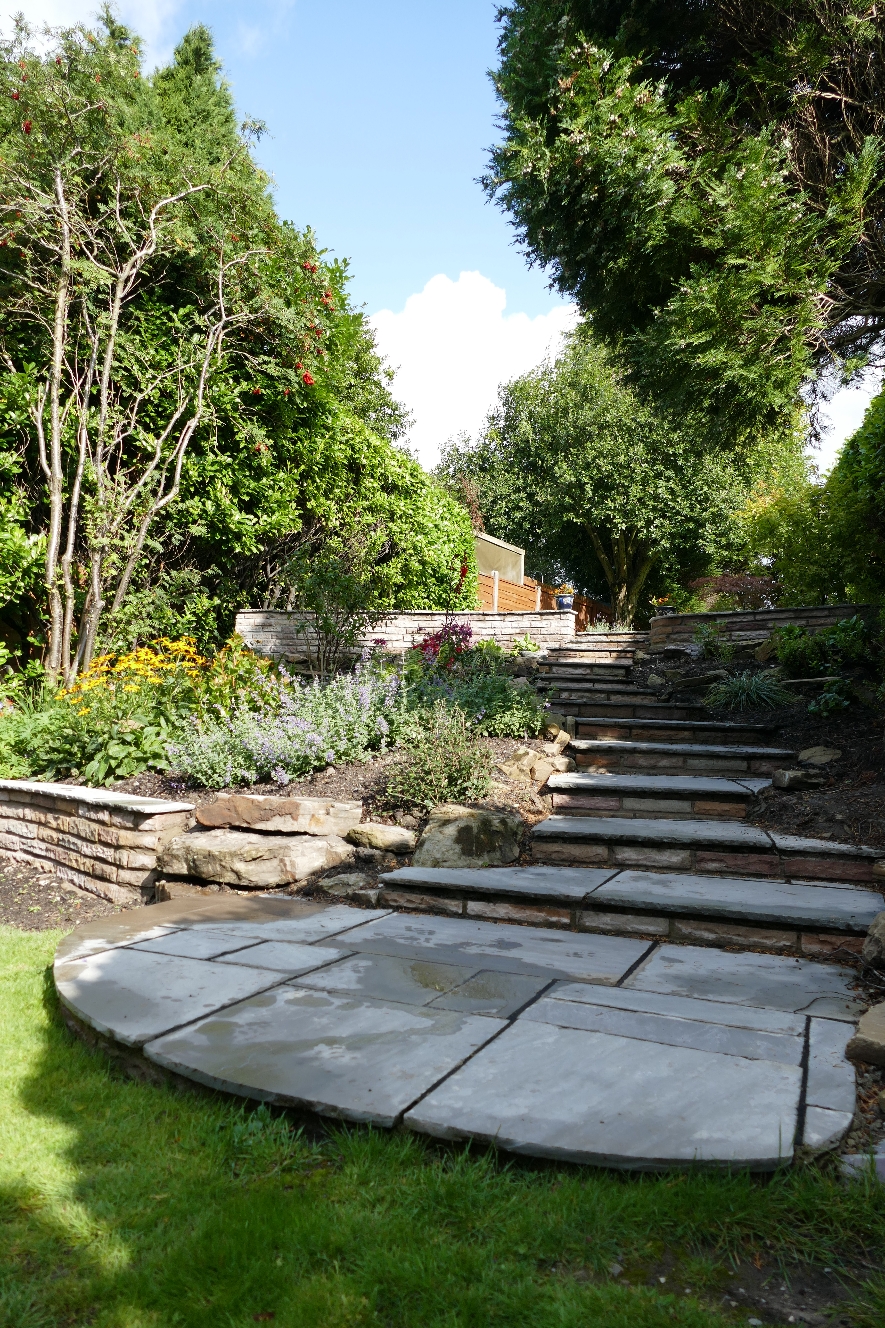This was an extensive, multilevel garden re-build. Pre-cast concrete and brick patios, steps and walls were replaced with new higher grade sandstone, using curved forms creating interesting level effects. Poorly built steps were replaced with foundations to give long lasting firm footing.