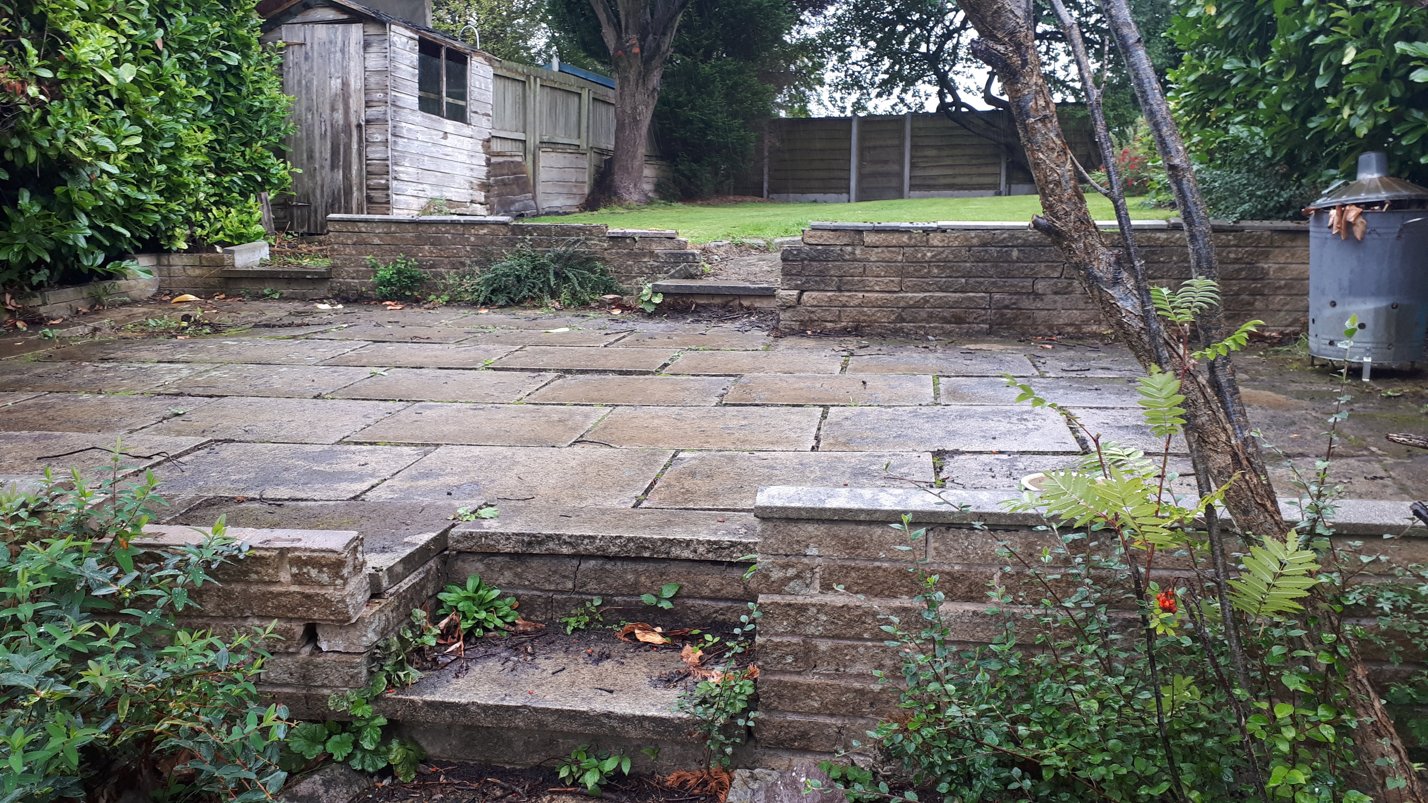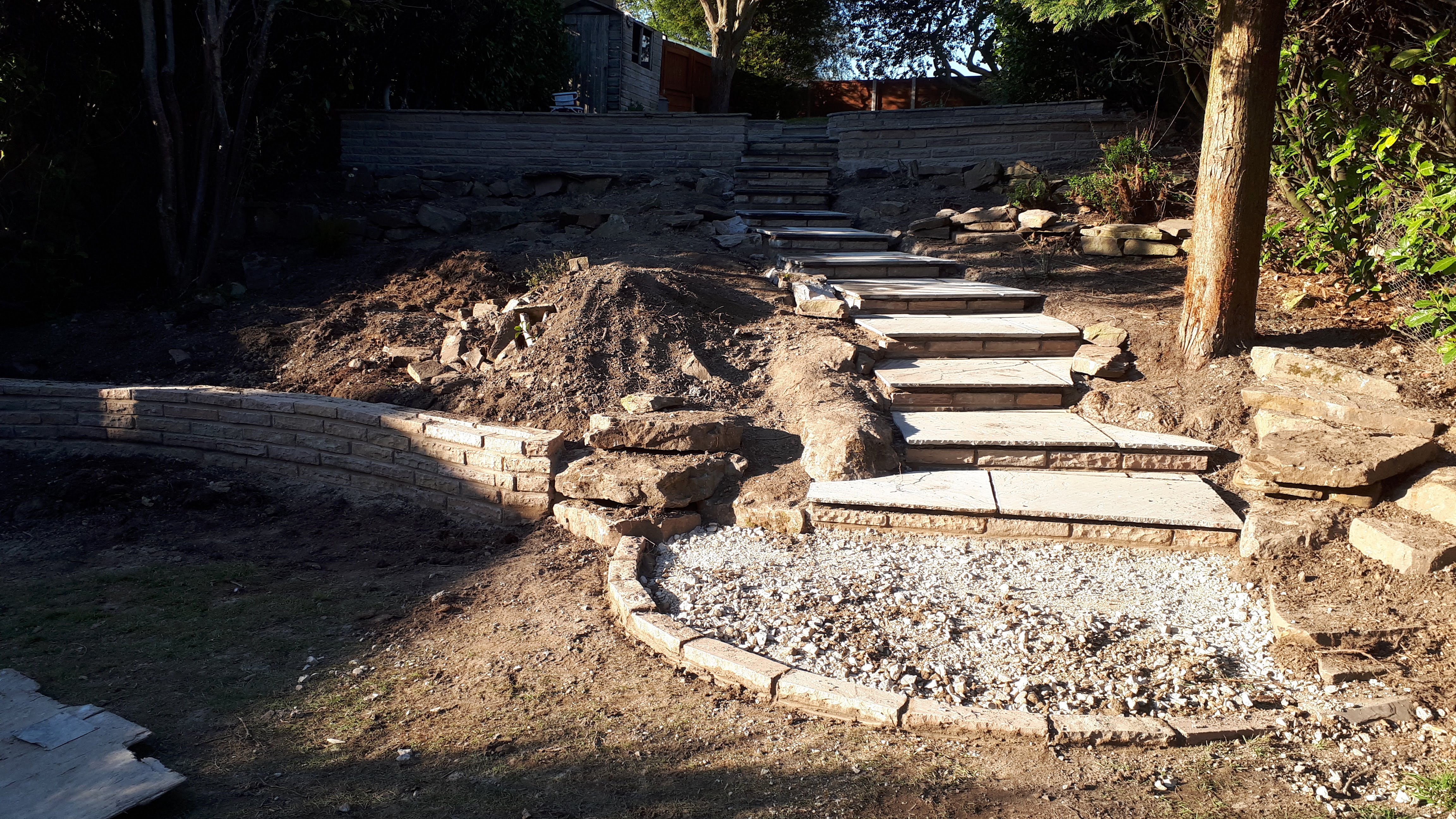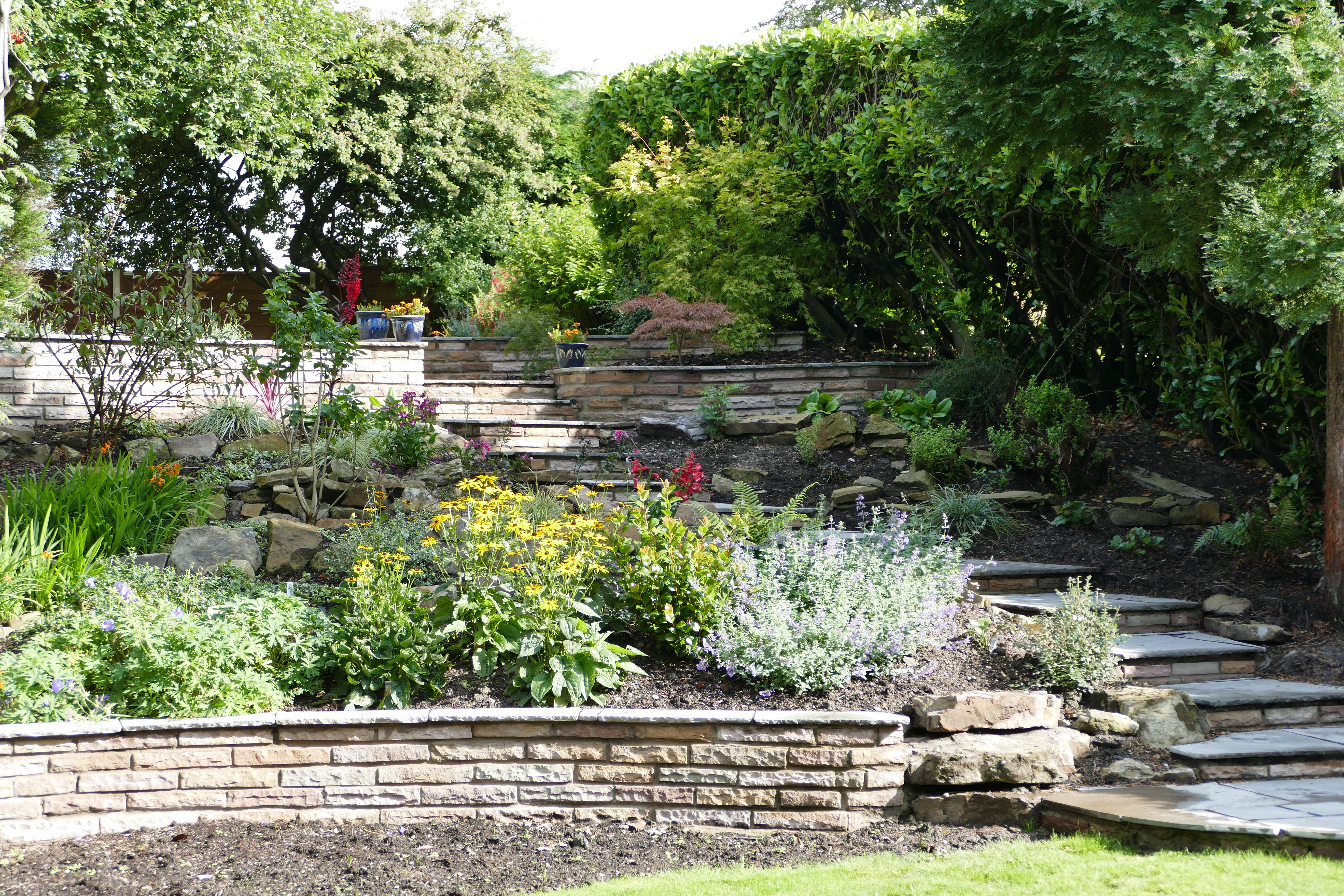 This was an extensive, multilevel garden re-build. Pre-cast concrete and brick patios, steps and walls were replaced with new higher grade sandstone, using curved forms creating interesting level effects. Poorly built steps were replaced with foundations to give long lasting firm footing.