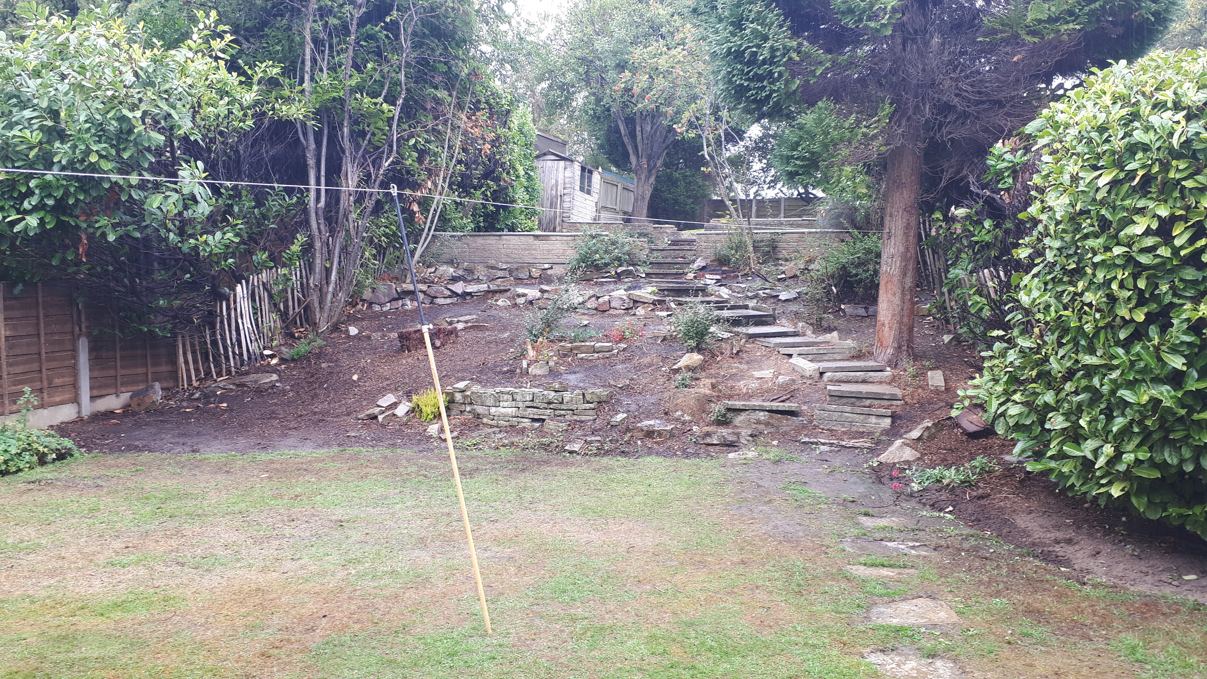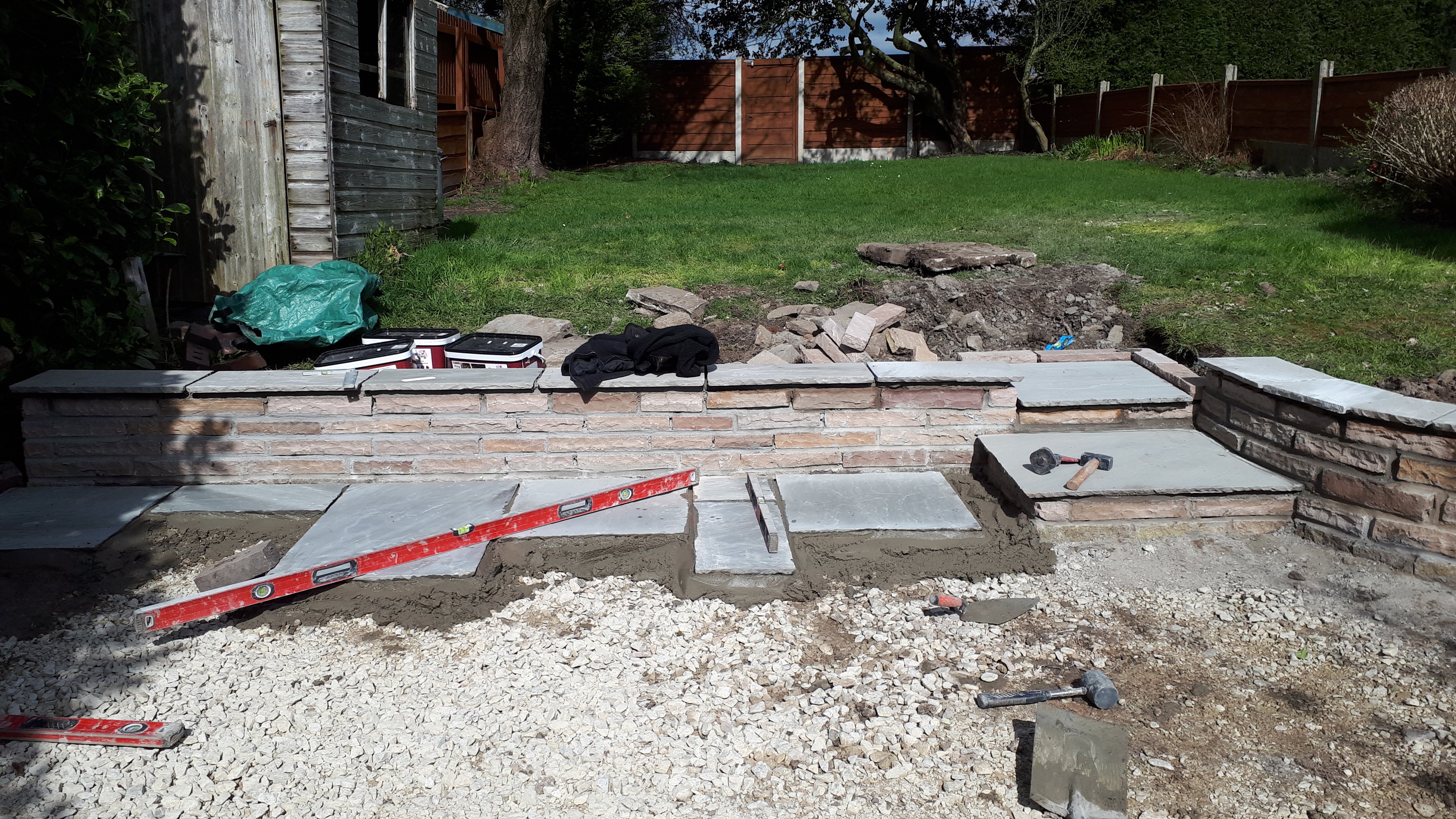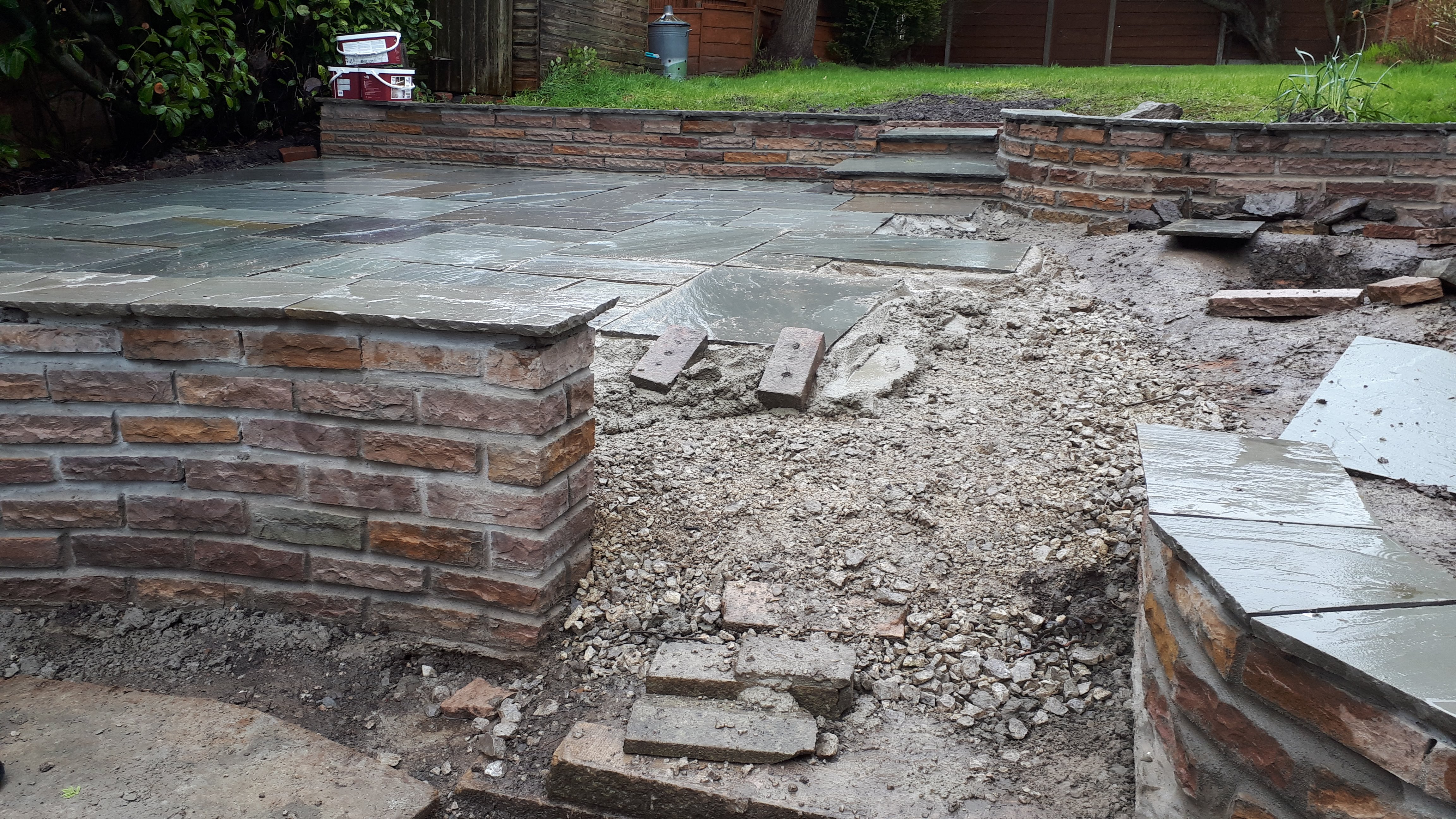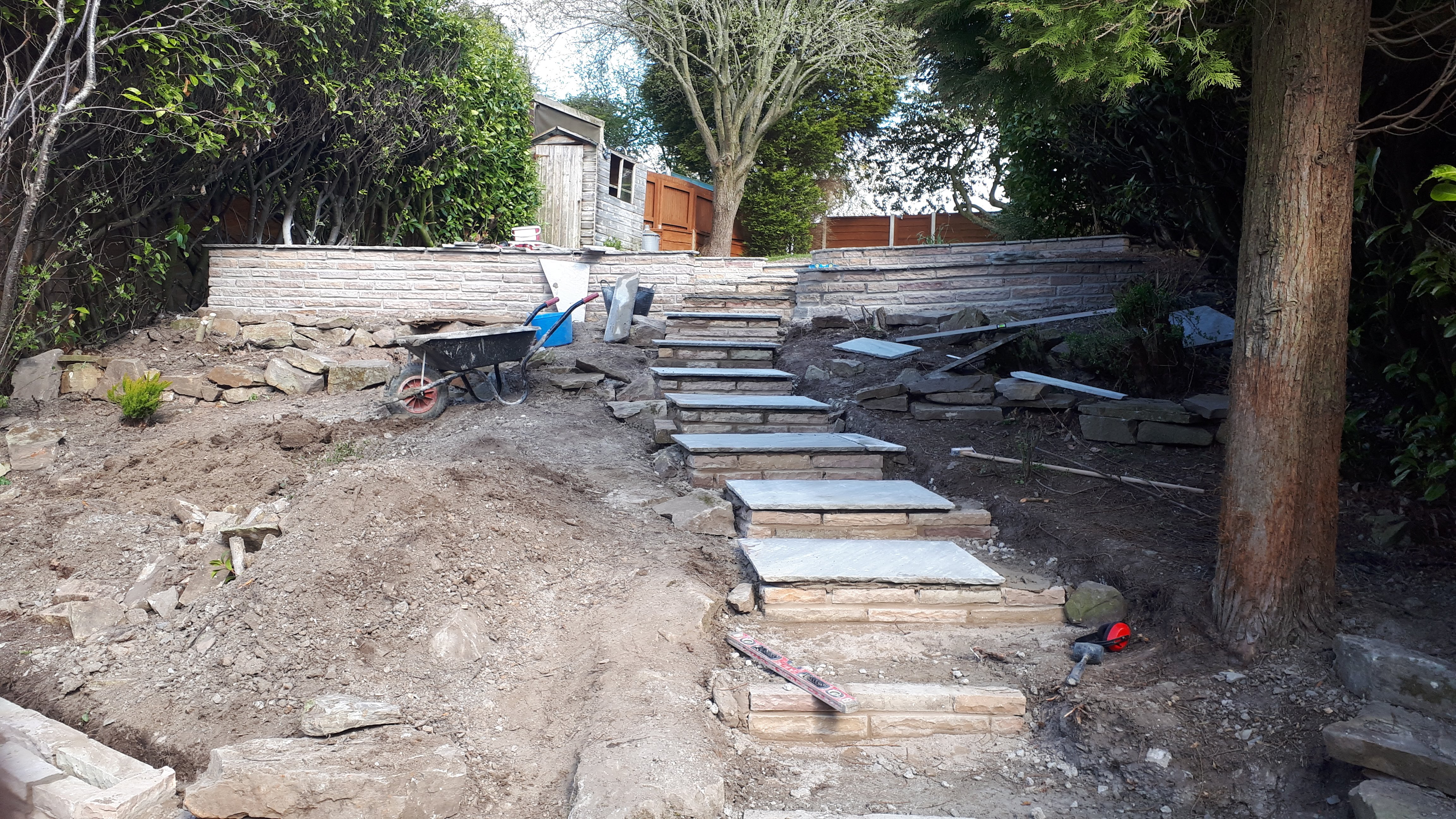 This was an extensive, multilevel garden re-build. Pre-cast concrete and brick patios, steps and walls were replaced with new higher grade sandstone, using curved forms creating interesting level effects. Poorly built steps were replaced with foundations to give long lasting firm footing.
