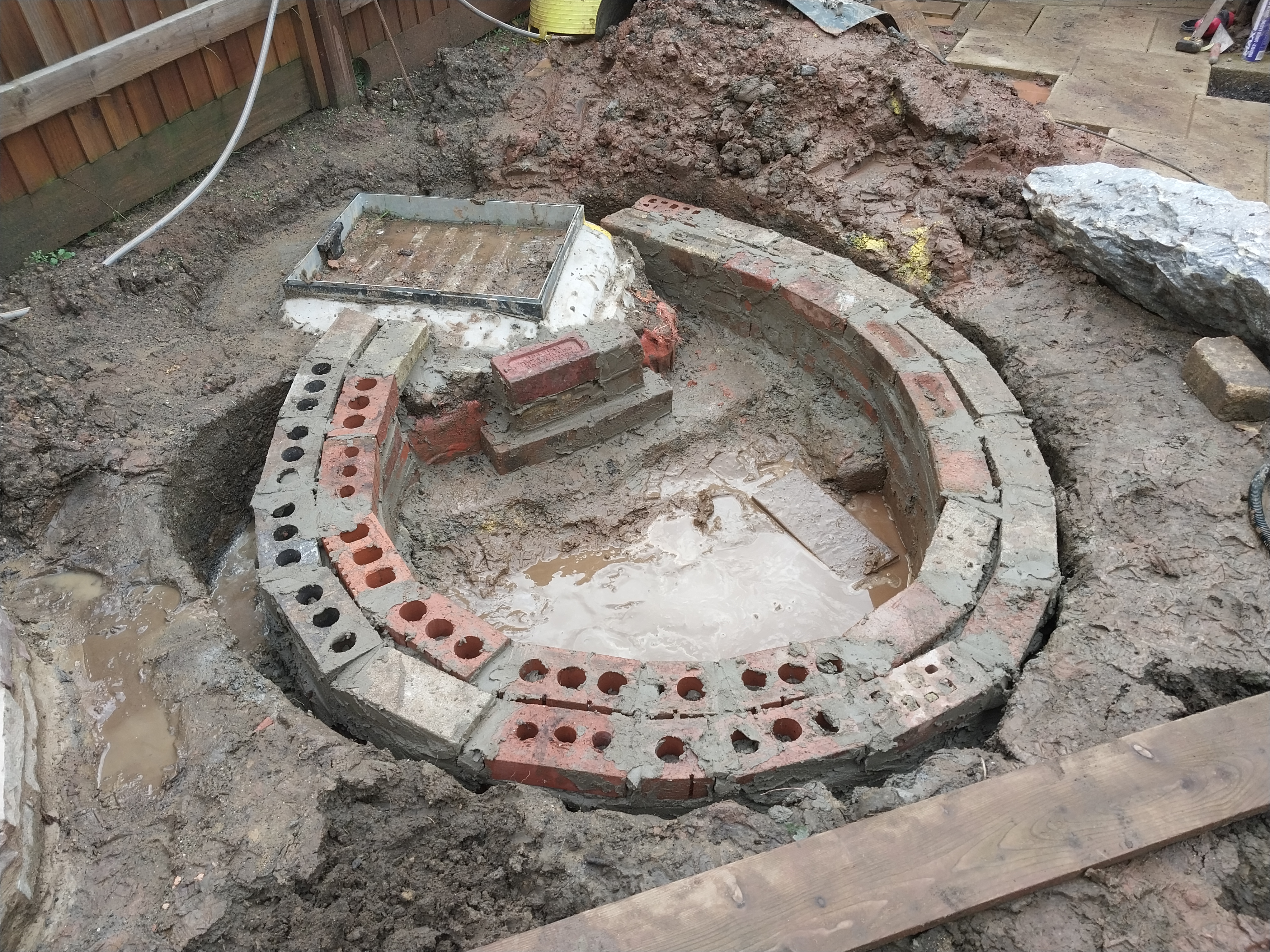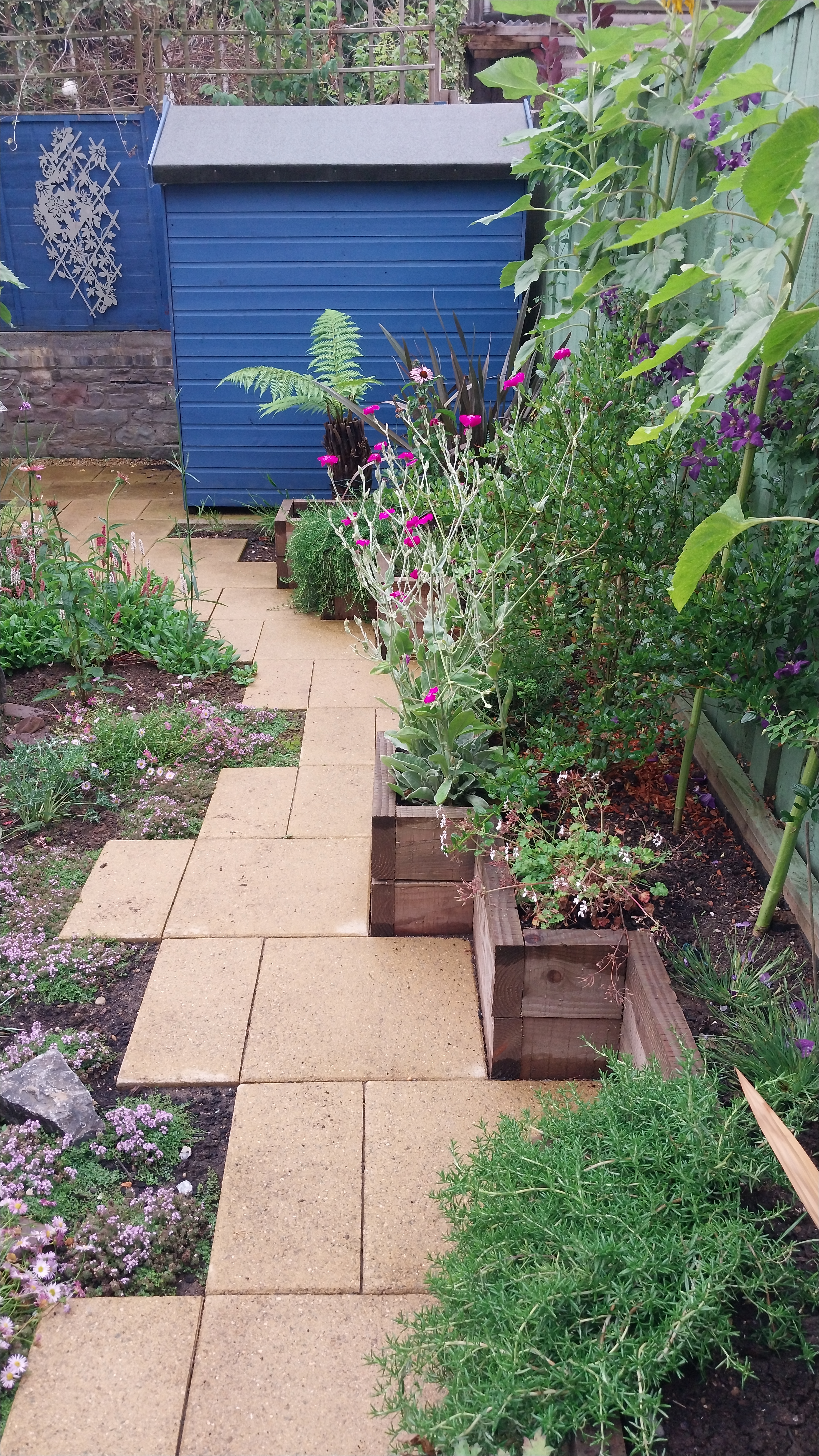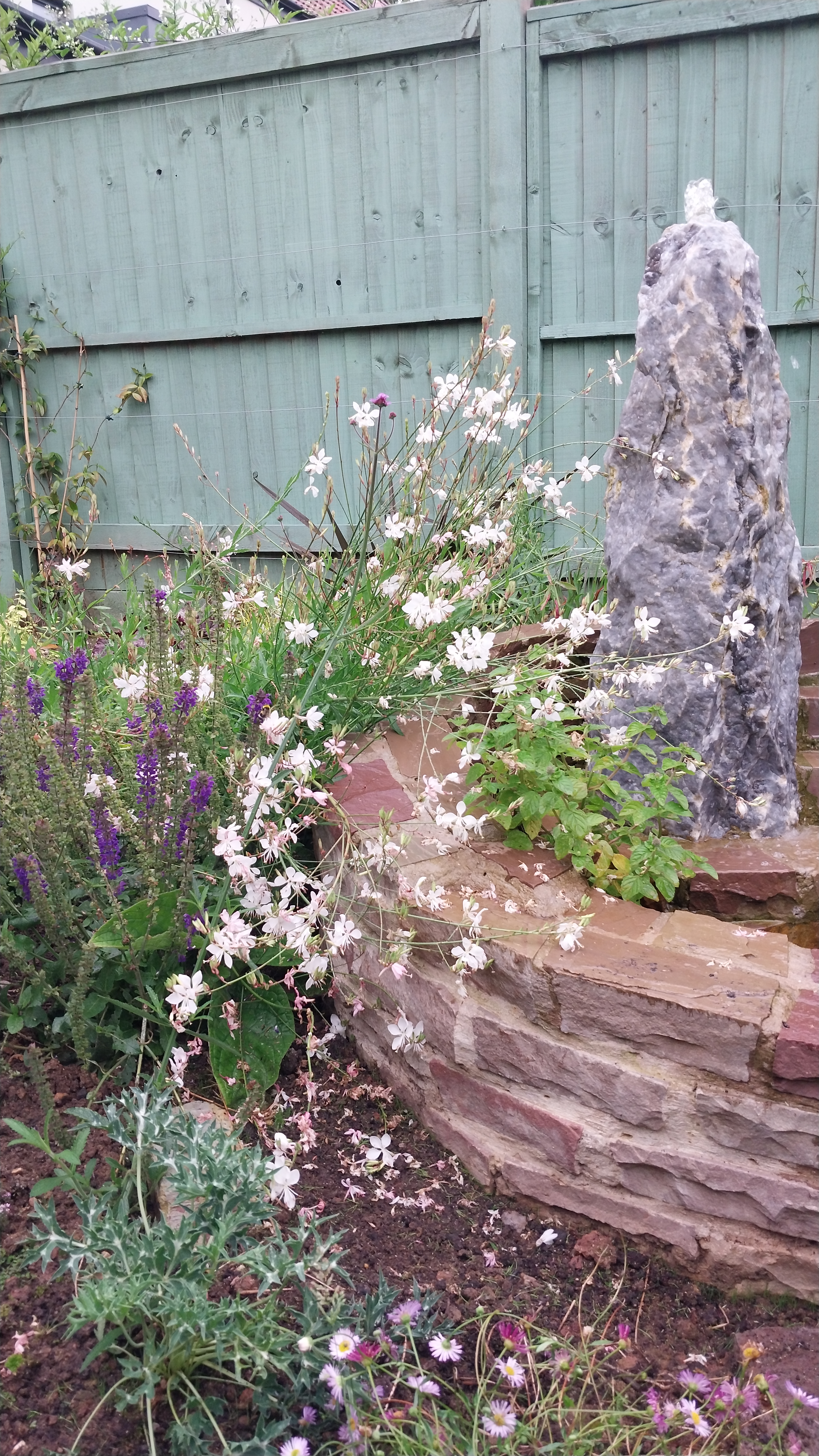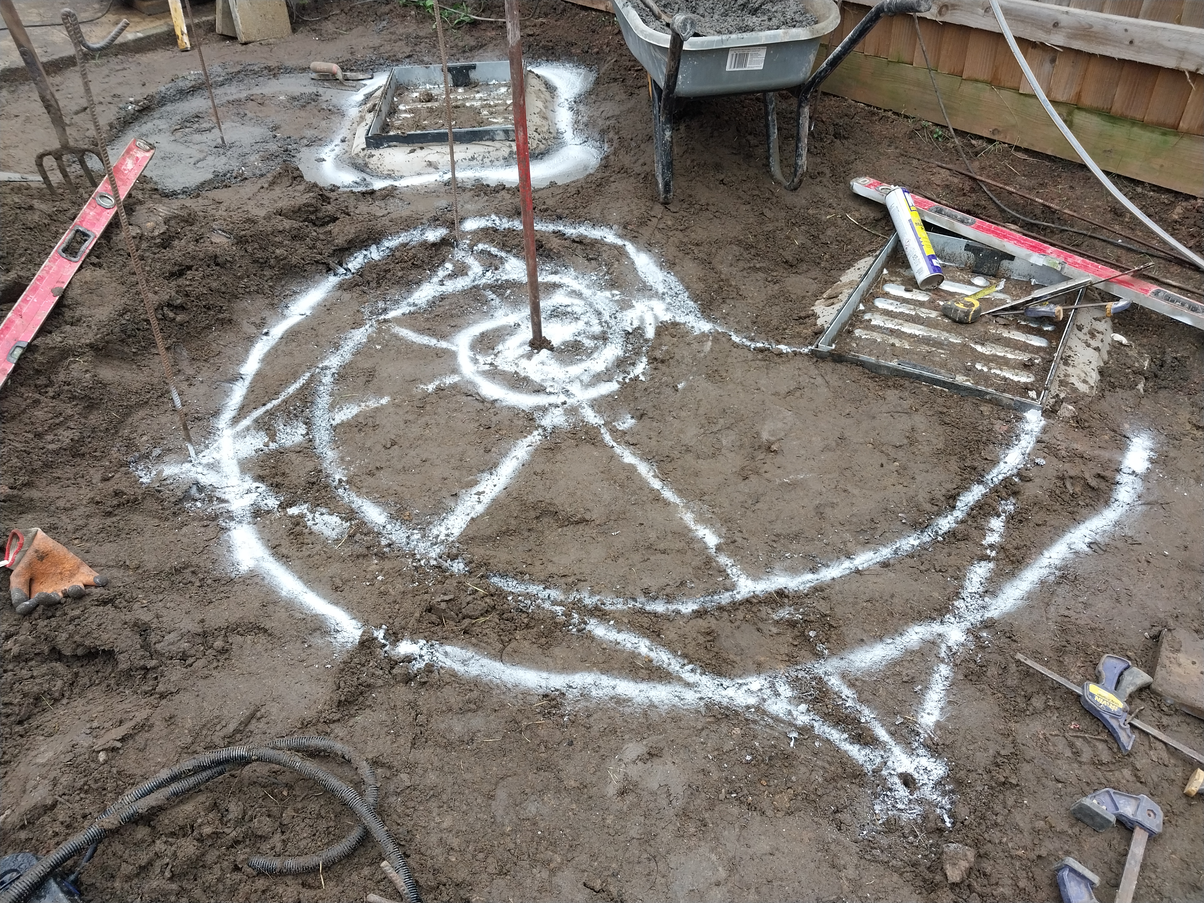 This served as a inspiration for design, with two golden mean spirals emerging from walls surrounding and screening the manhole covers, built from sandstone blocks. The manhole covers were sealed with grease and covered in planting troughs. This featured alongside a remodeling of the flagstone path in an interesting stepped pattern followed by an adjacent douglas fir raised bed.