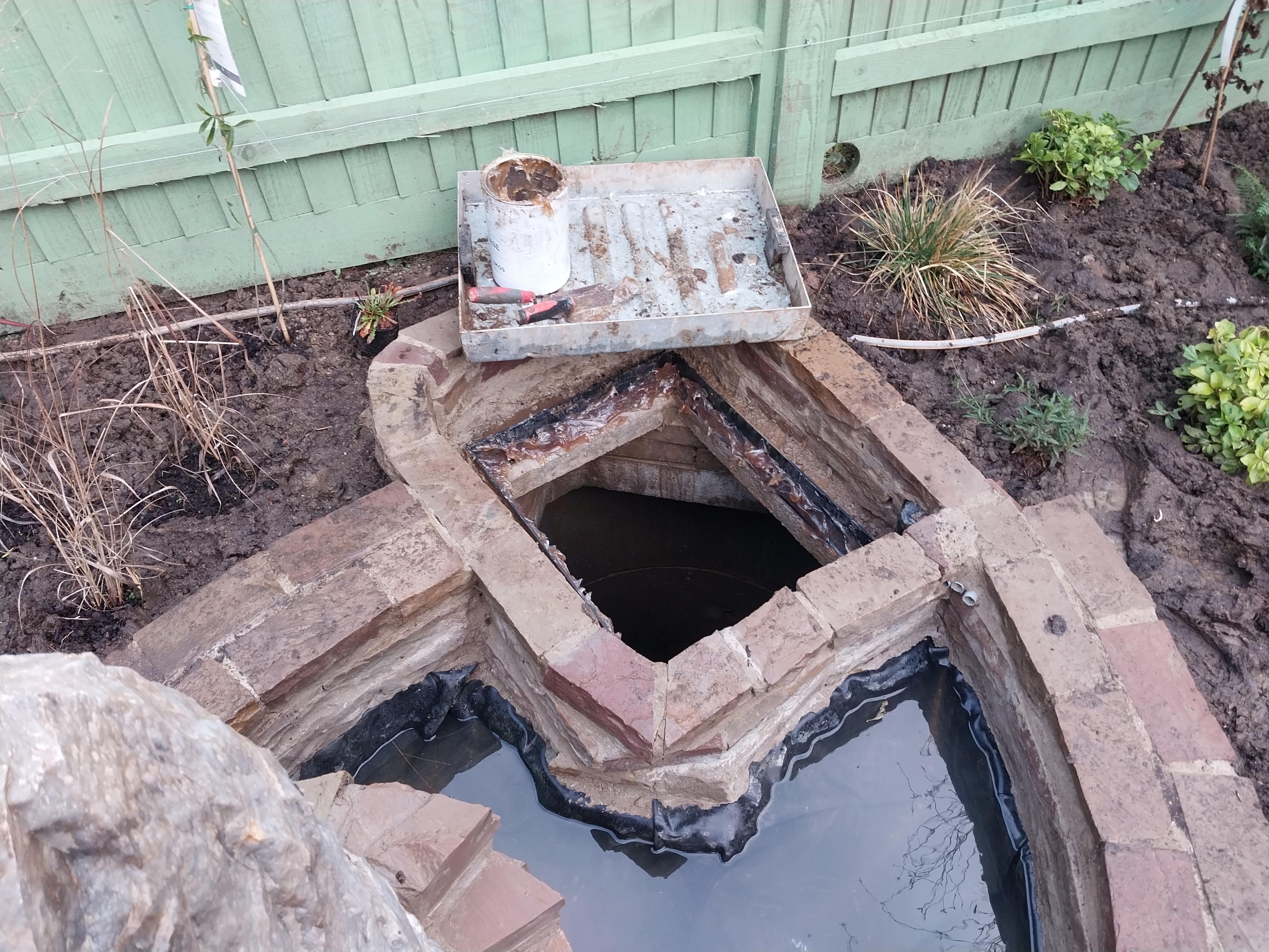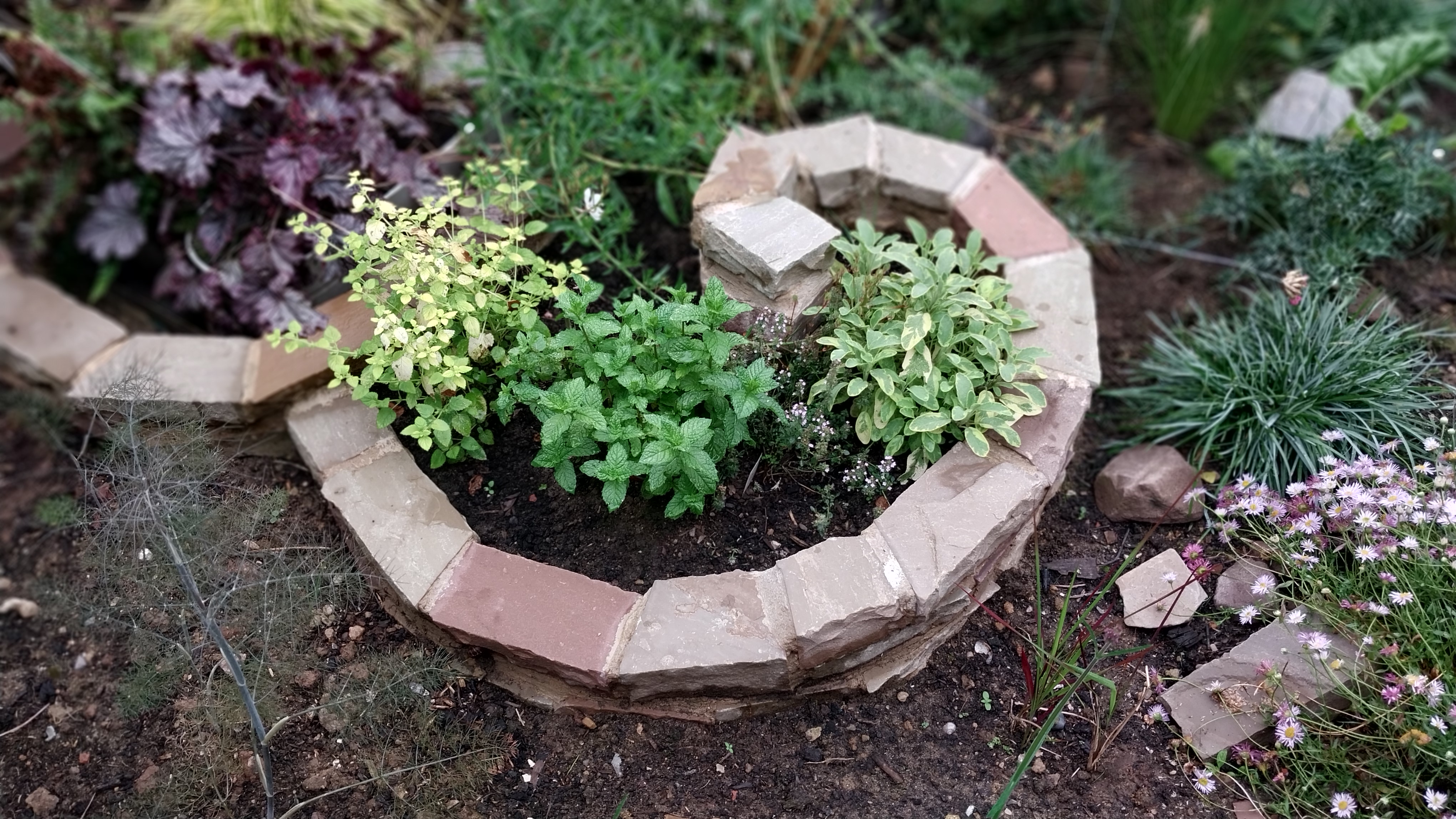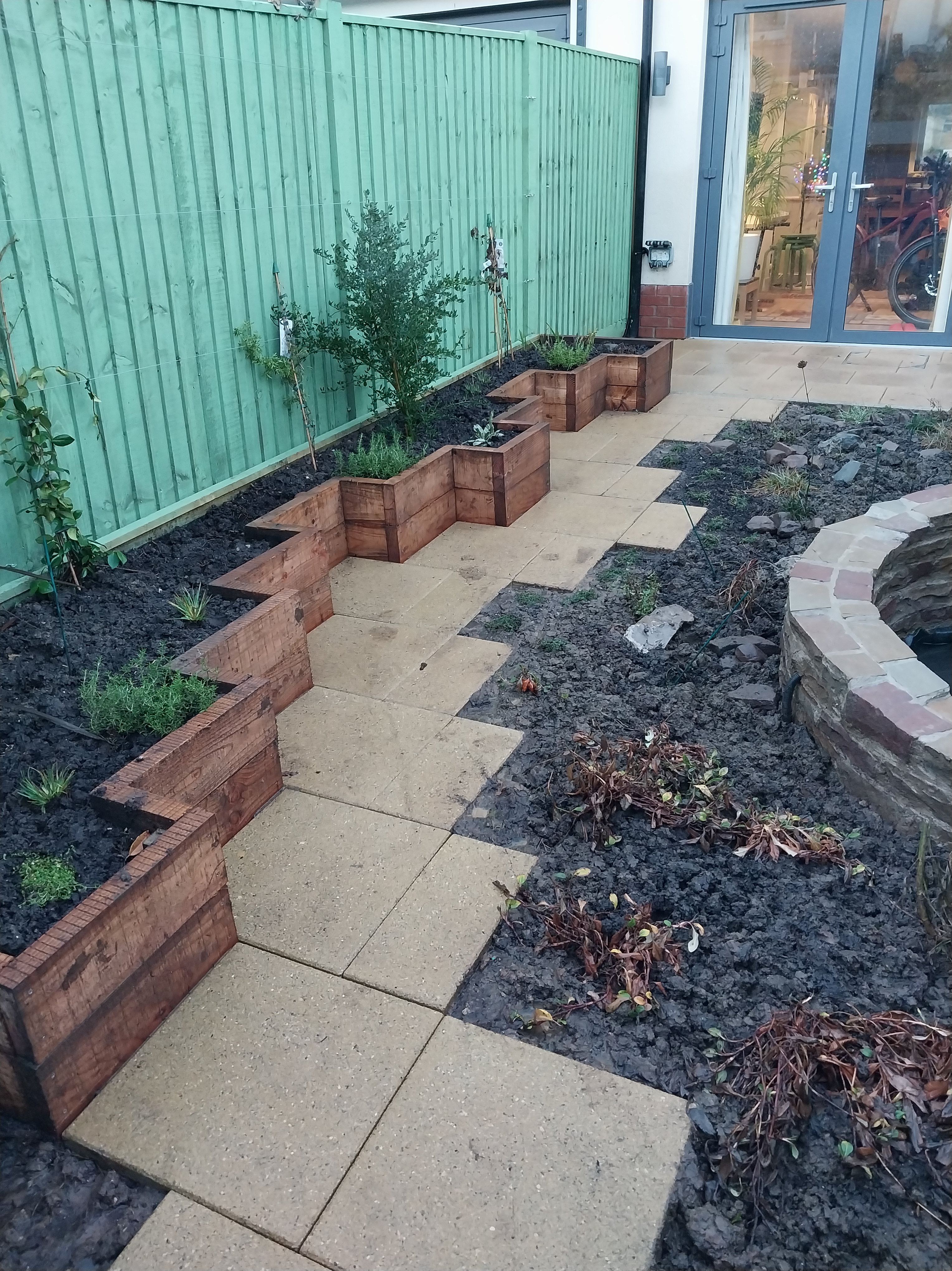 This served as a inspiration for design, with two golden mean spirals emerging from walls surrounding and screening the manhole covers, built from sandstone blocks. The manhole covers were sealed with grease and covered in planting troughs. This featured alongside a remodeling of the flagstone path in an interesting stepped pattern followed by an adjacent douglas fir raised bed.