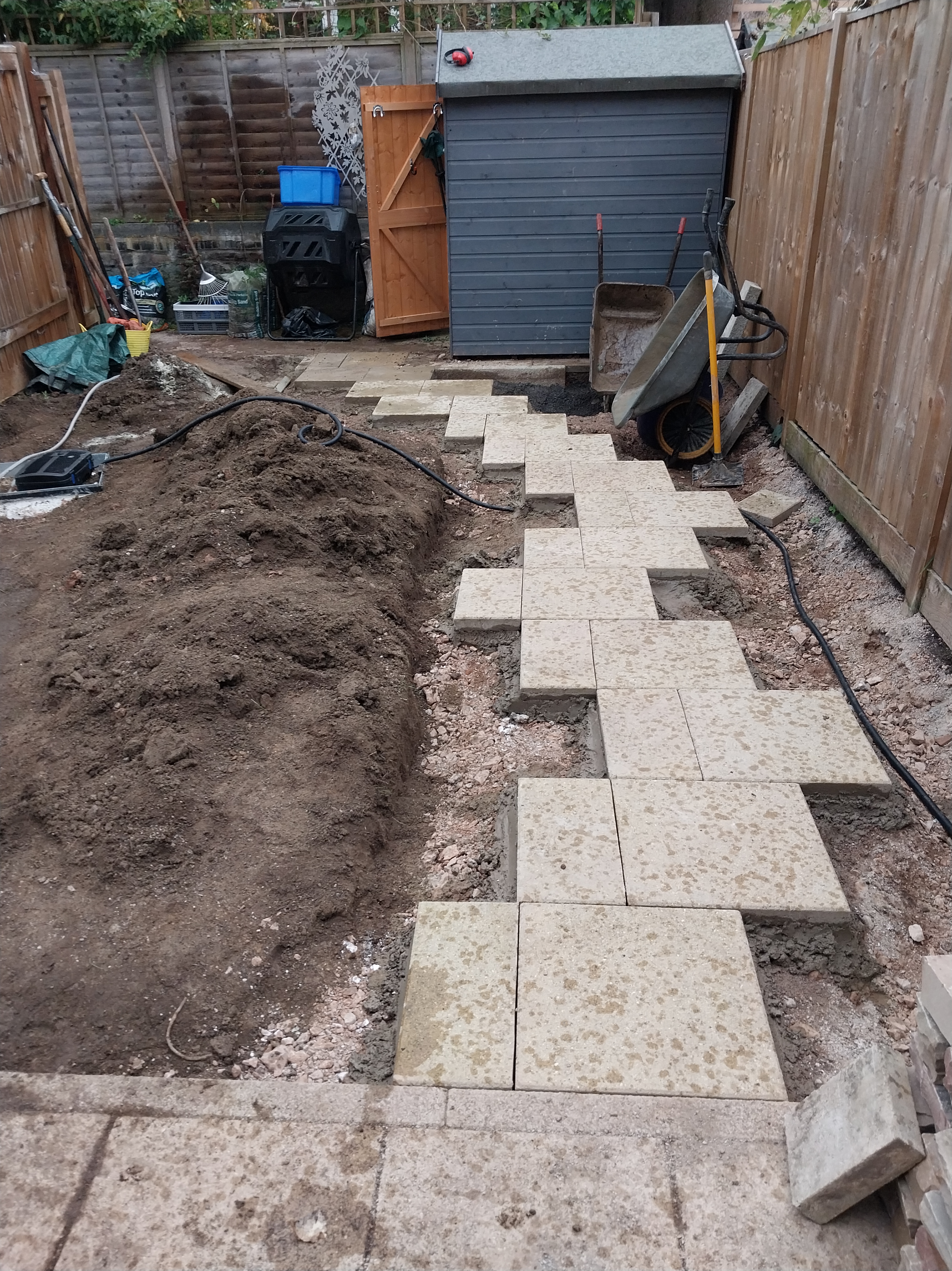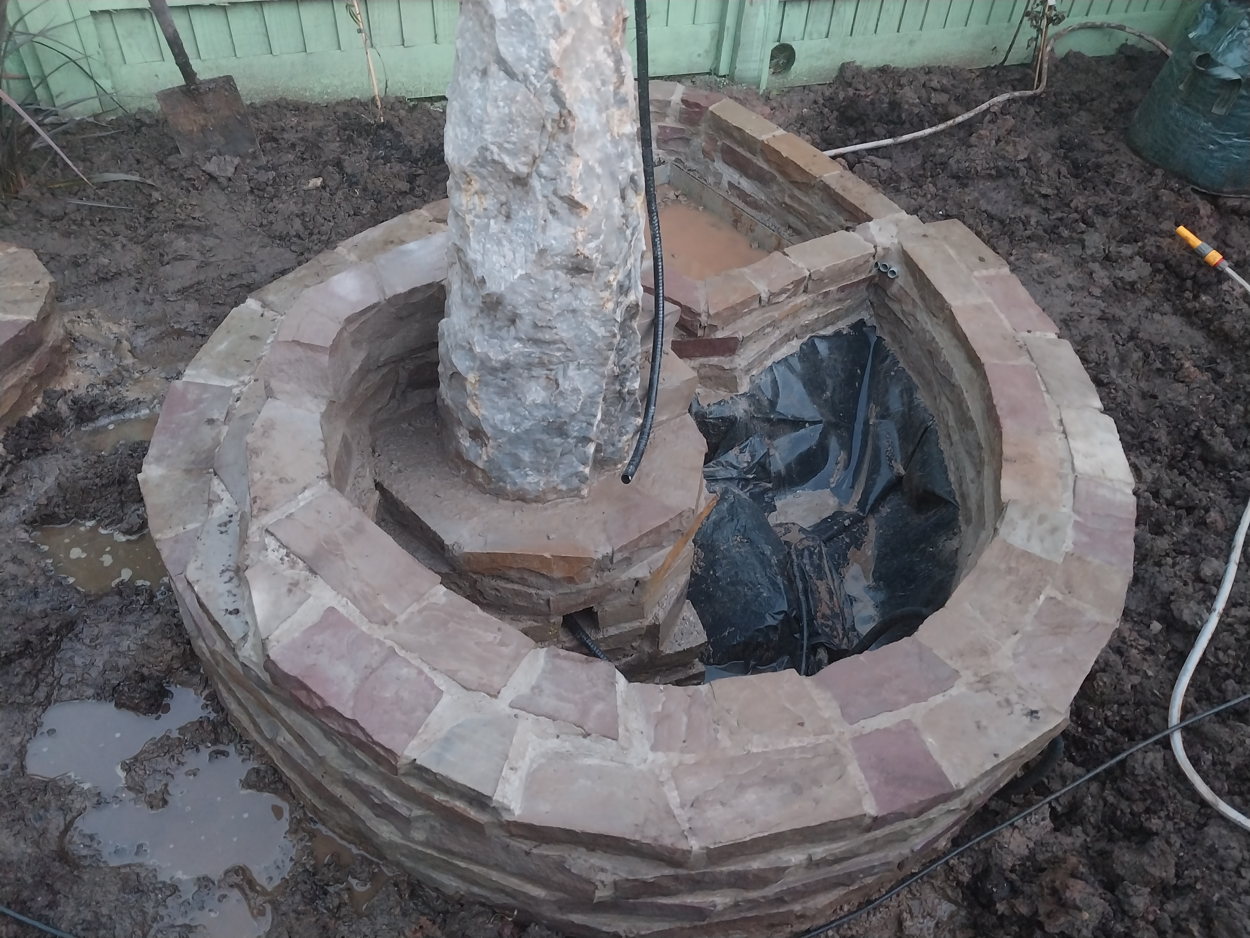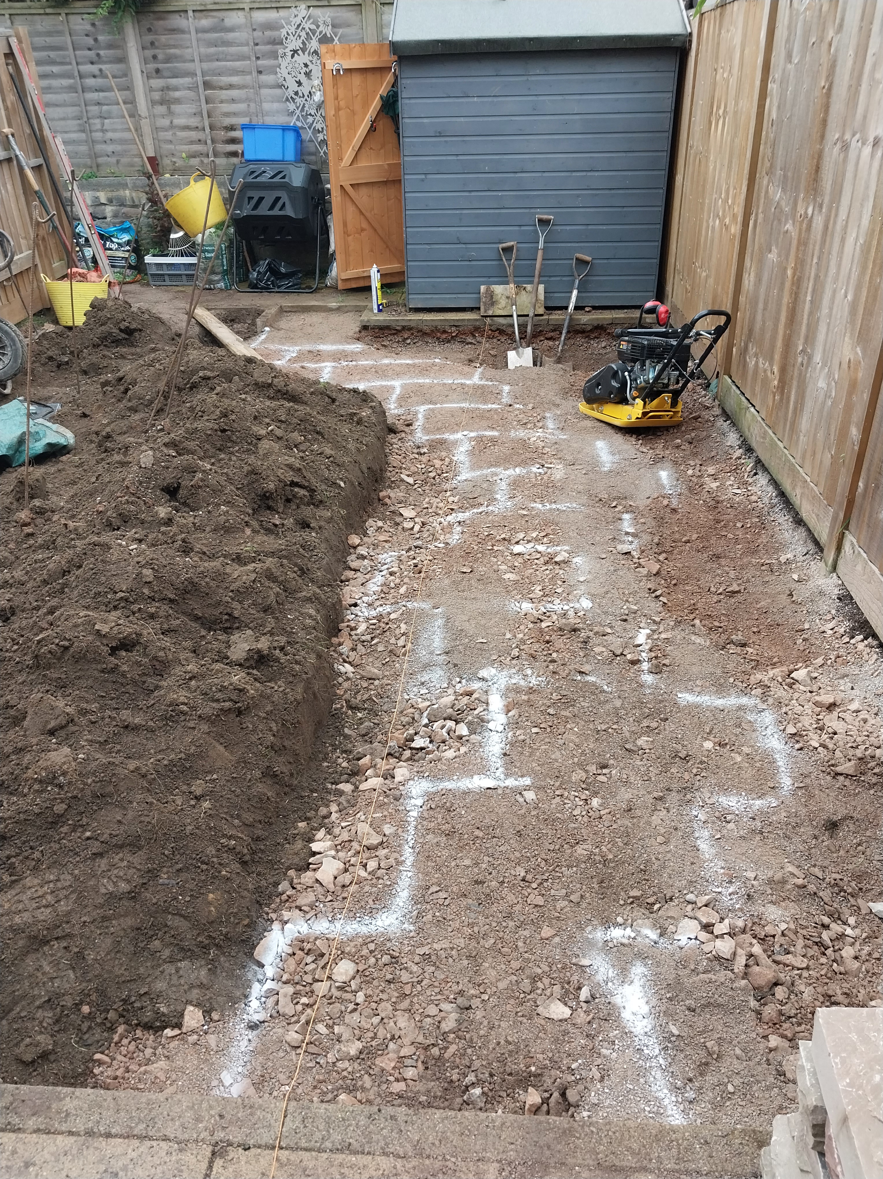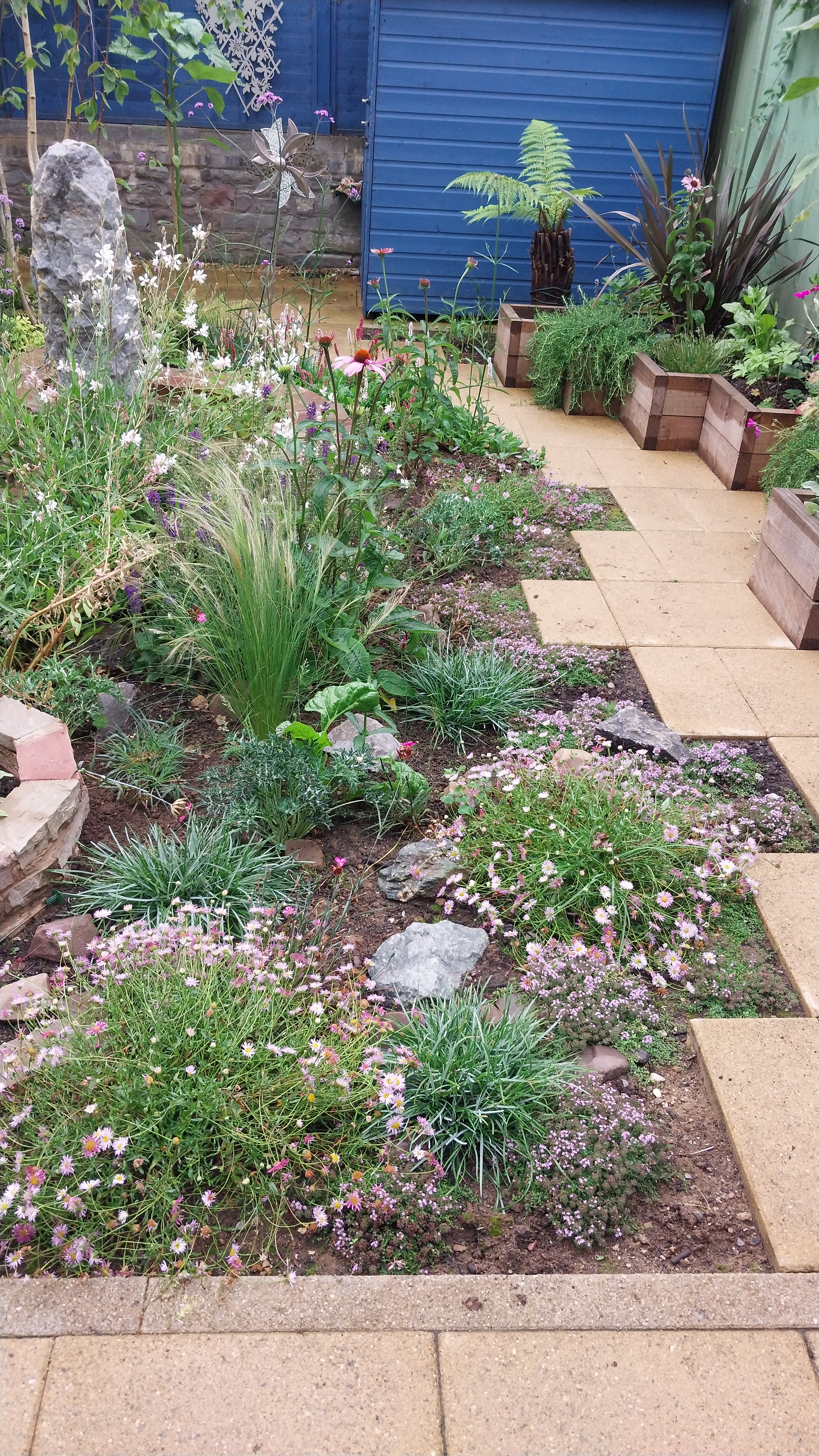This served as a inspiration for design, with two golden mean spirals emerging from walls surrounding and screening the manhole covers, built from sandstone blocks. The manhole covers were sealed with grease and covered in planting troughs. This featured alongside a remodeling of the flagstone path in an interesting stepped pattern followed by an adjacent douglas fir raised bed.