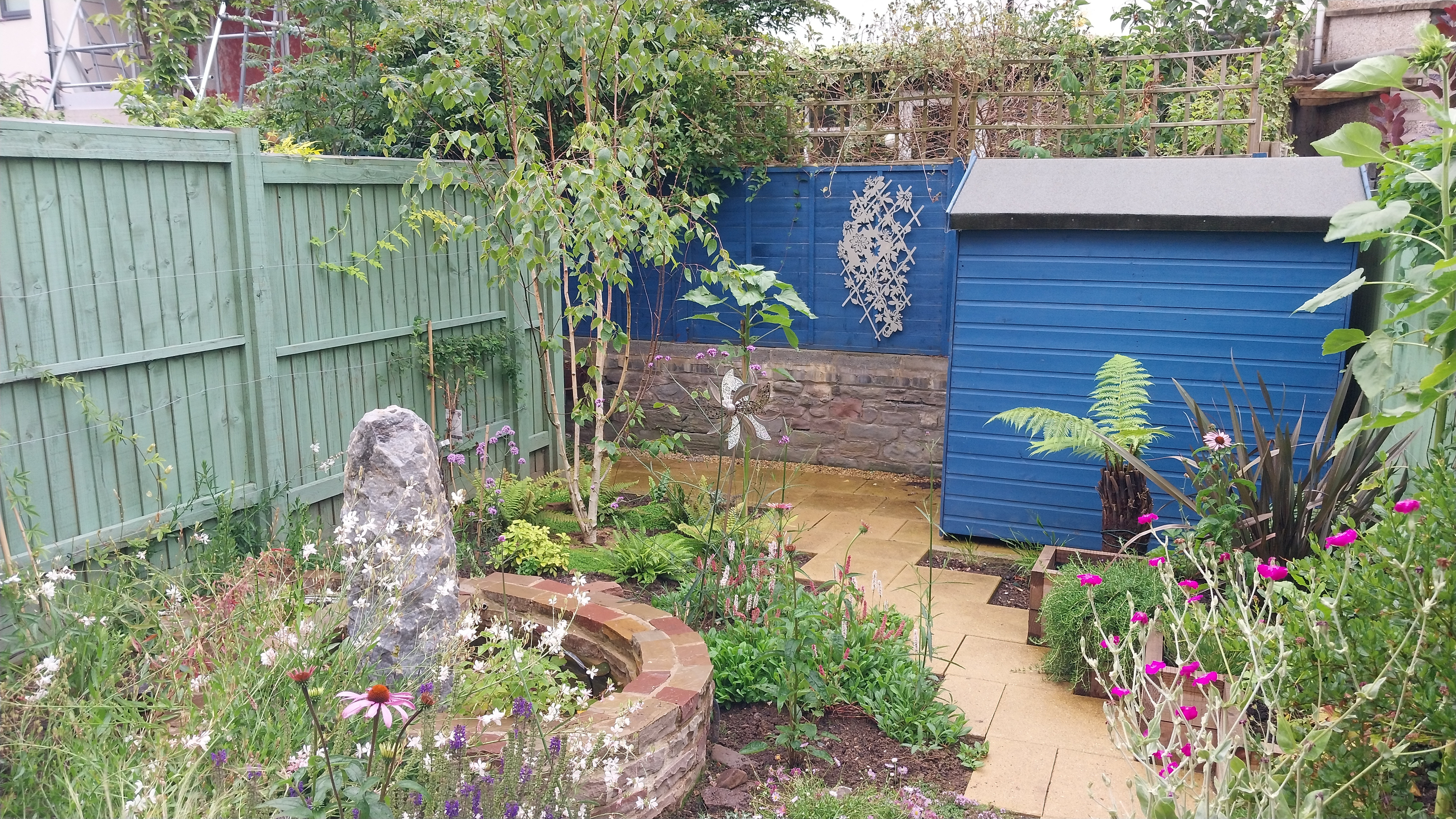 A second focal point of a large Himalayan birch under-planted with ferns, is set in front of blue painted fencing. The tree gives height and screens the neighbors behind. The vertical space enlivened by climbers on the painted walls. Grasses featured strongly in the design, with existing strap like purple Phormiums (flax), lancing Crocosmia ‘Lucifer’ and an existing Ceanothus.