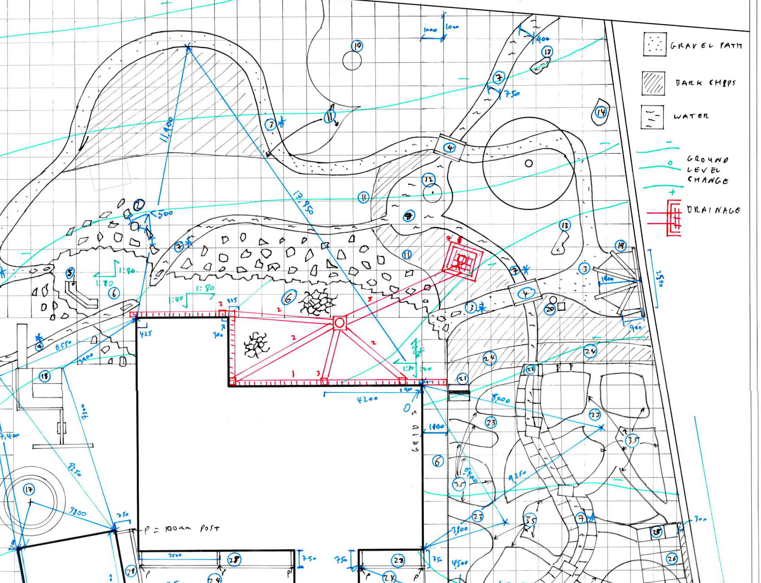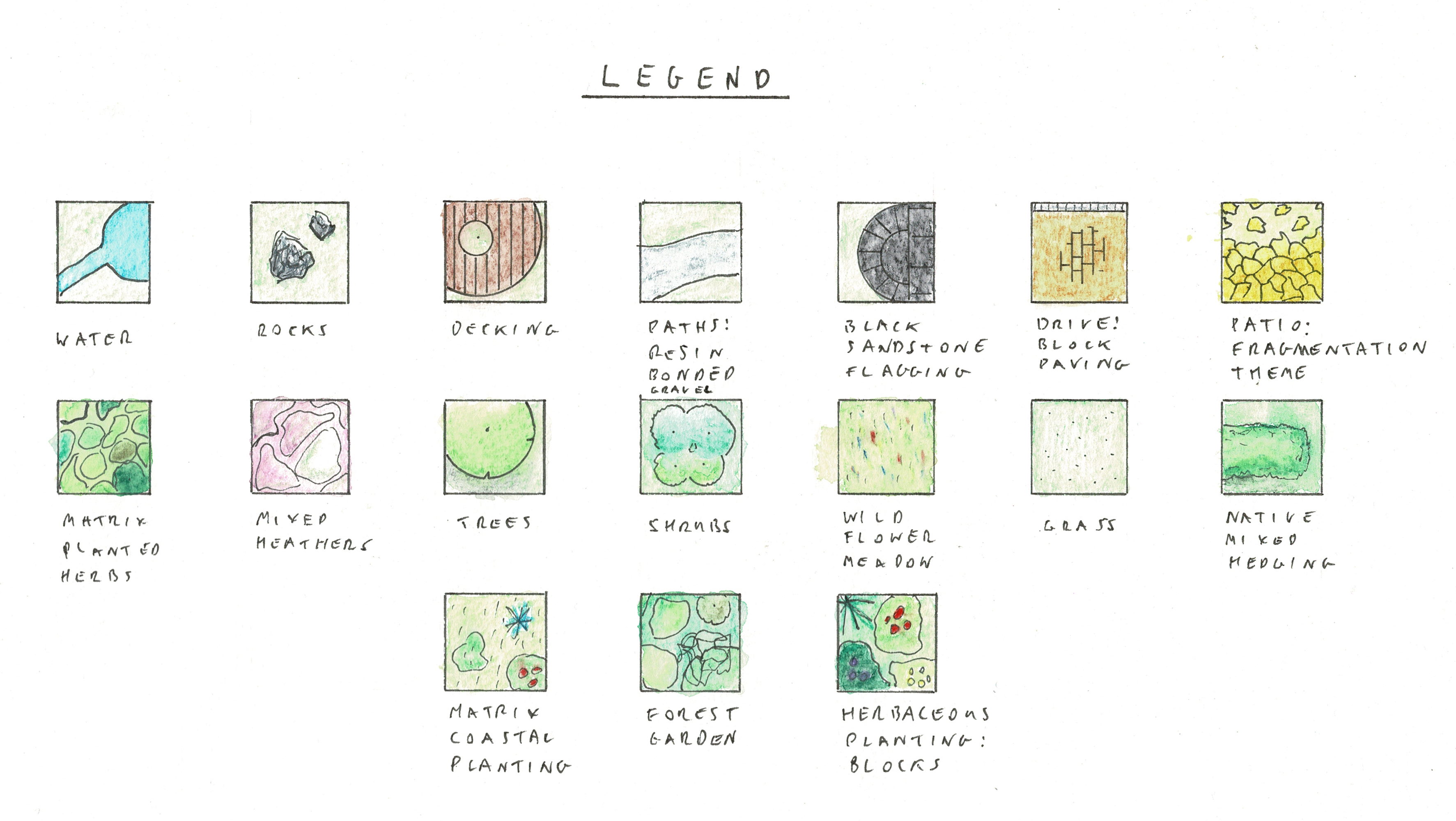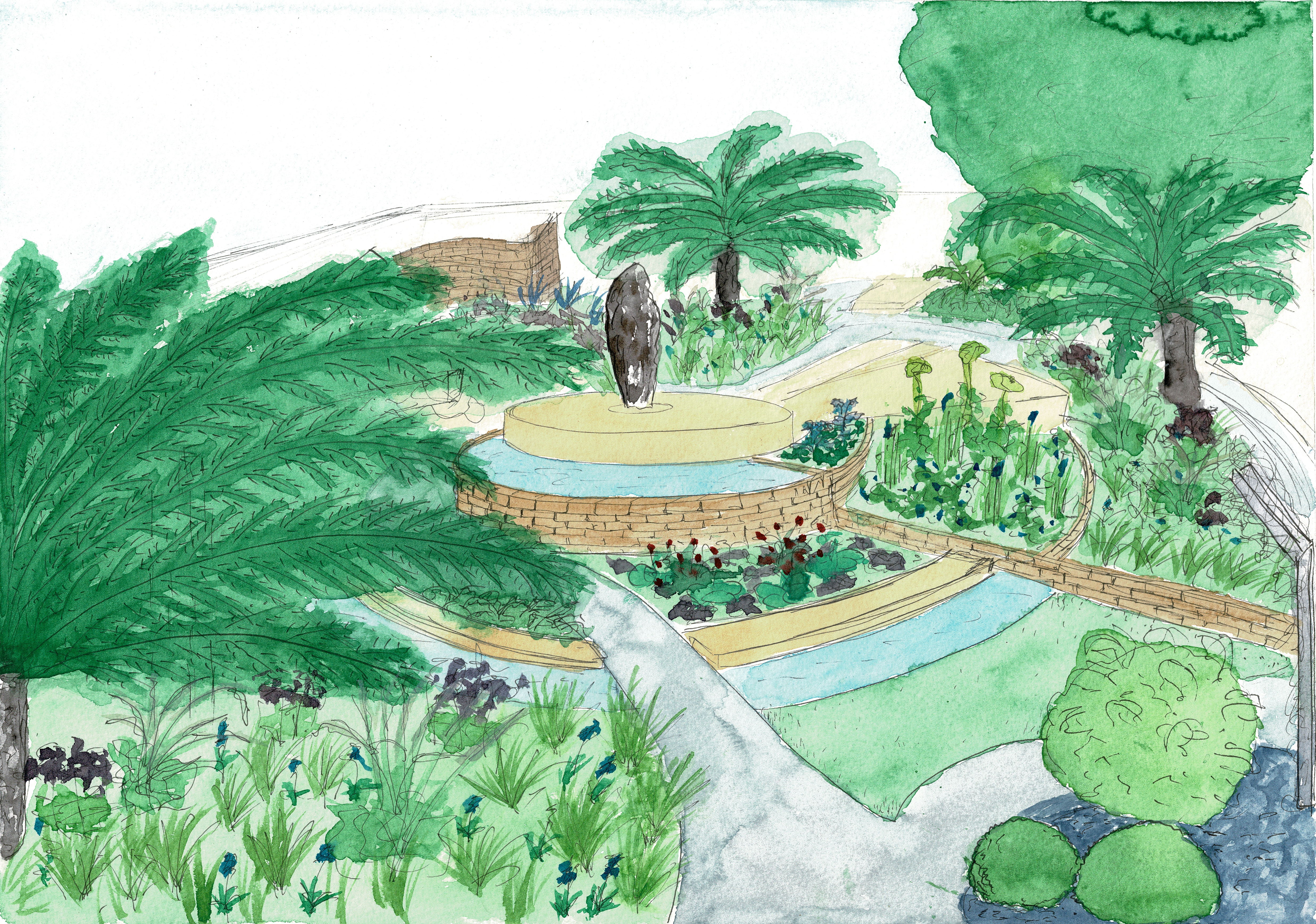 The master plan, consists of a plan view and section elevation drawing(s), and may include visualisations of the garden, which are sketches/drawings of how the garden will look on completion and establishment.