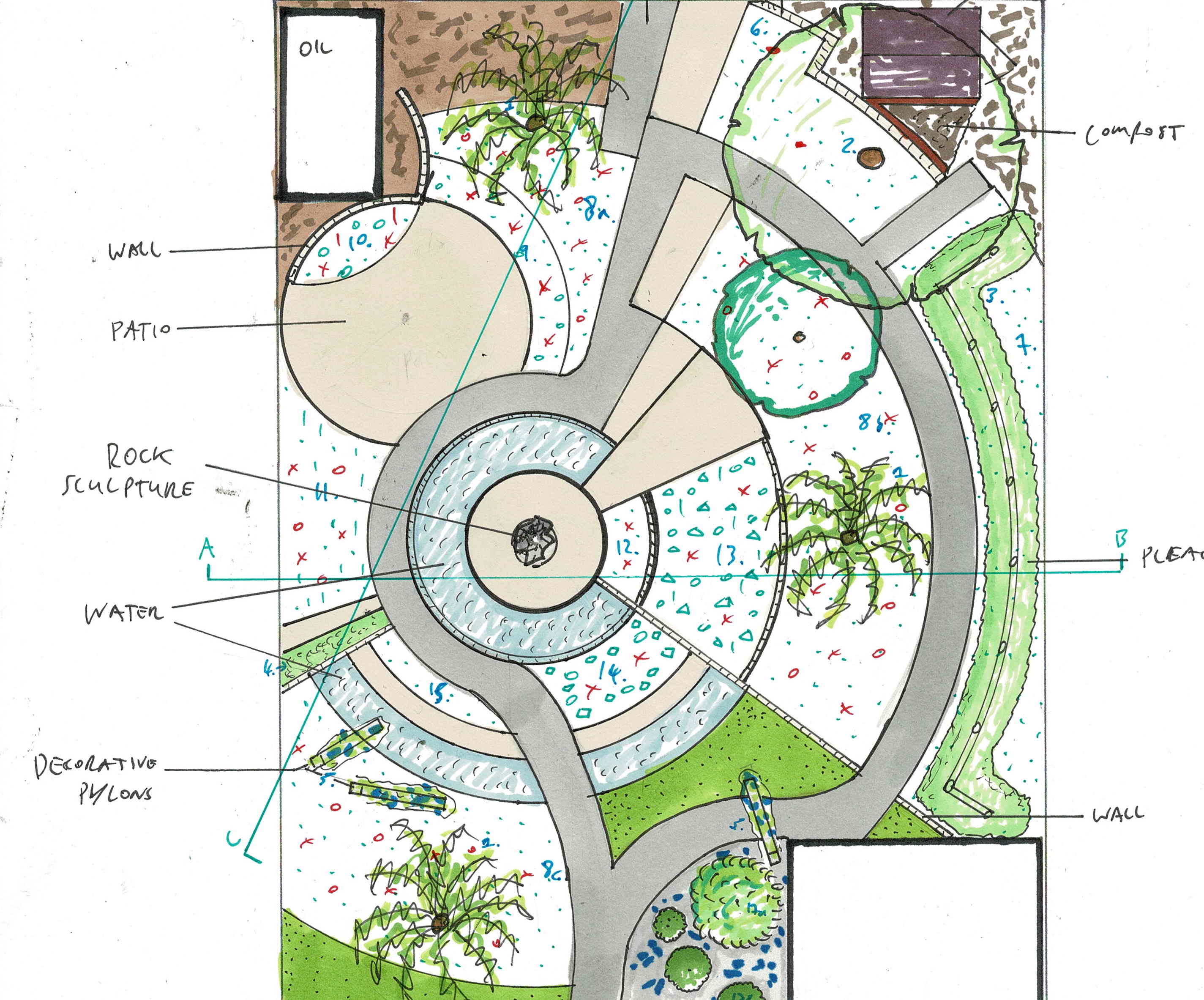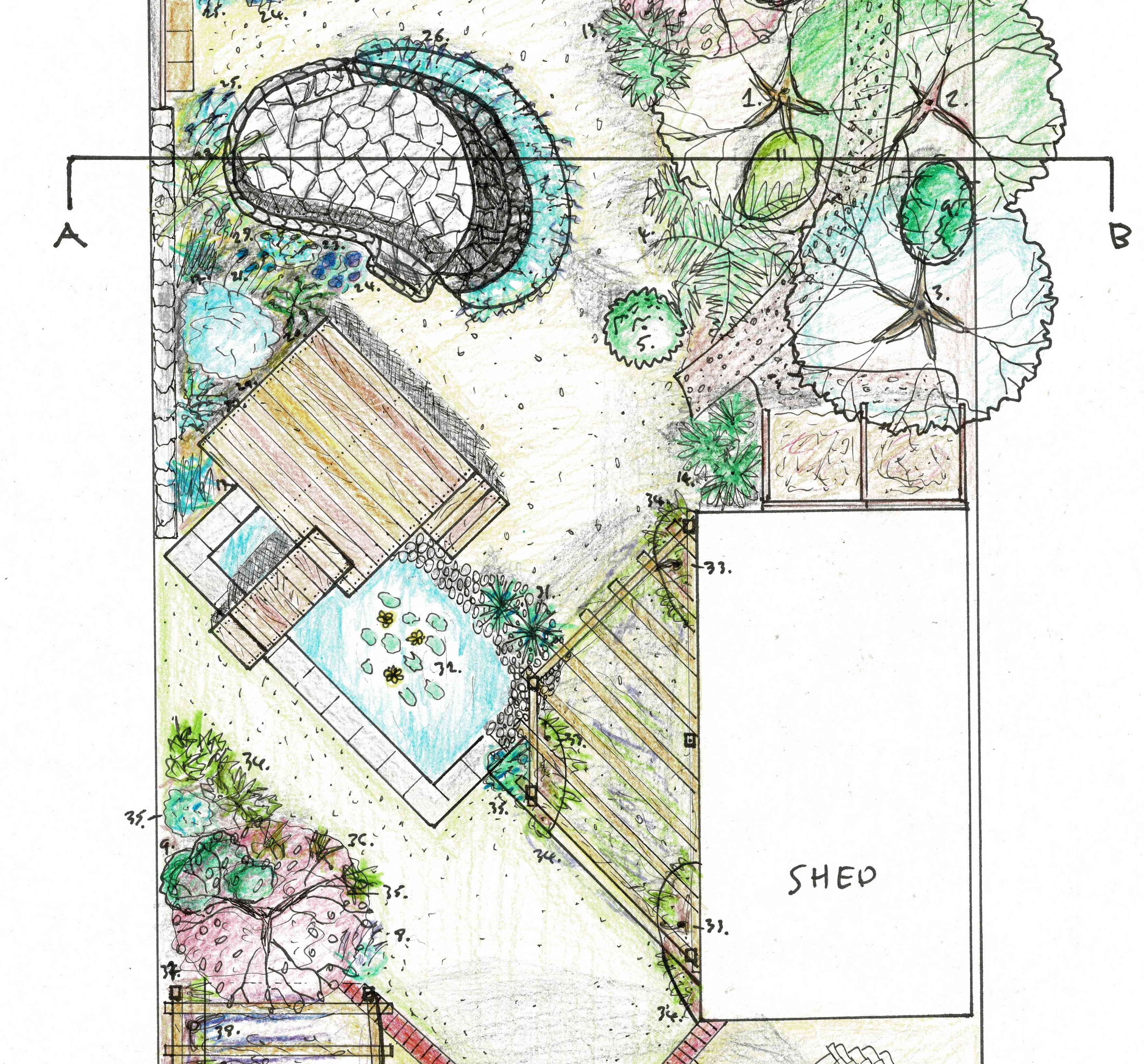 This can range from simple sketches to full colour drawings. Concept plans have less detail than a master plan/final design and show themes/styles and locations of paths, borders, planting and other features. Several concept drawings or sketches can be produced to give different design options. A mood board of photographs can be included in this stage along with plan view (top down) and section elevation drawings (which is a side view cross section with depth information in one direction).