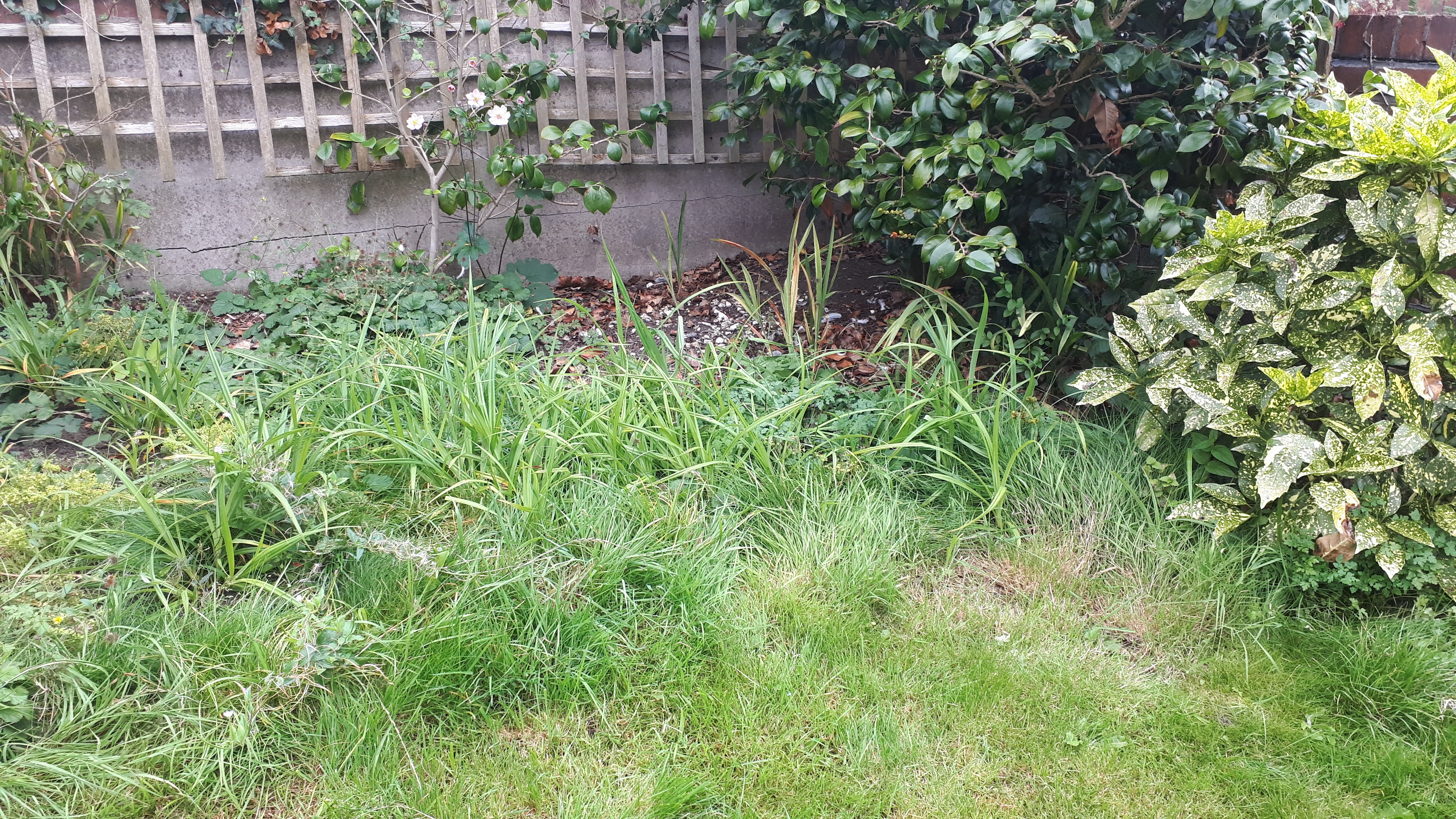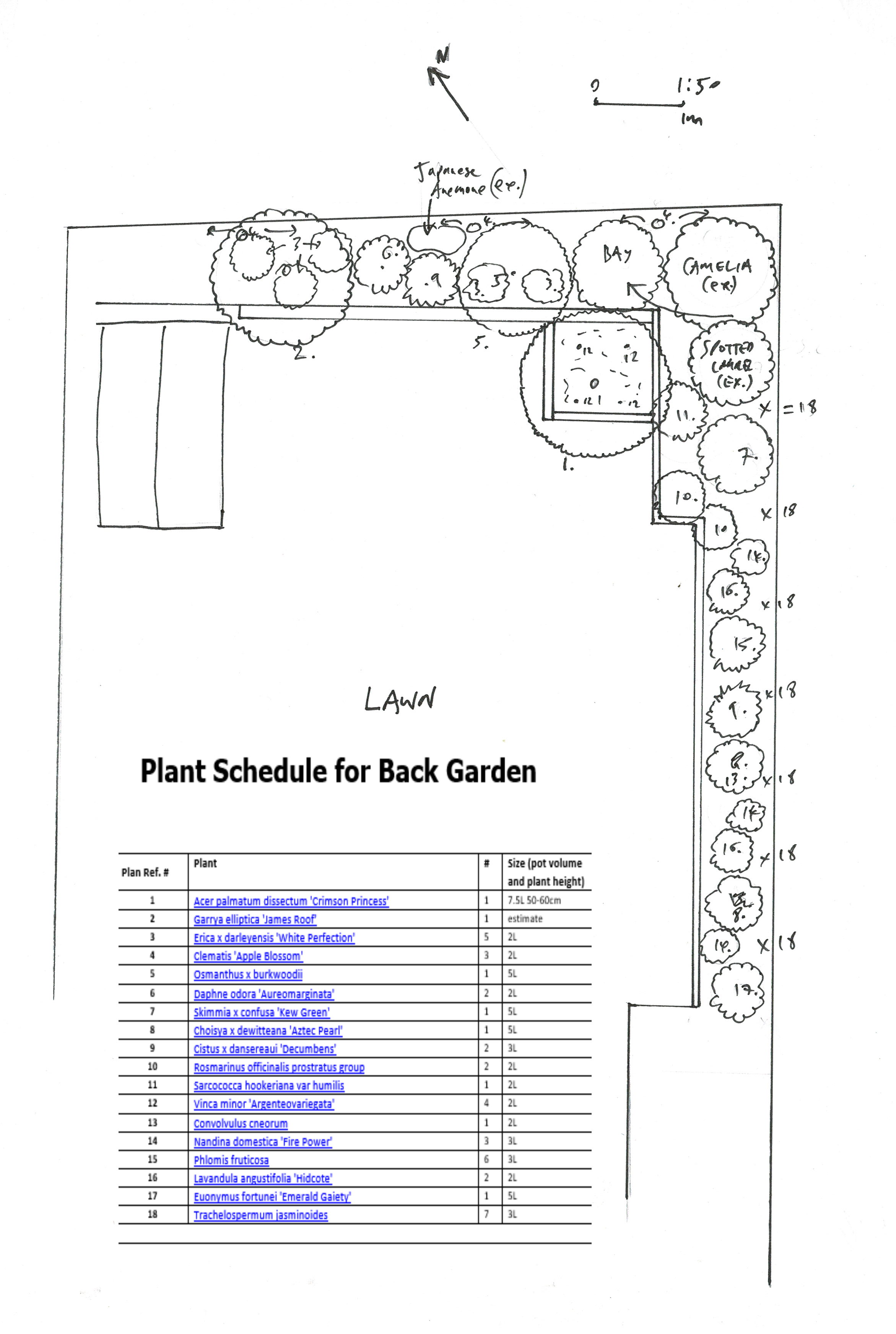 Raised bed retaining walls were created to level the lawn. The rear wall was constructed from reclaimed blocks from the previous garden, and reinforced with concrete blocks to enhance stability. Borders on the right hand side are constructed of sleepers, with a square border in the back corner hosting a purple Acer palmatum dissectum ‘Crimson Princess’ to soften the corner.