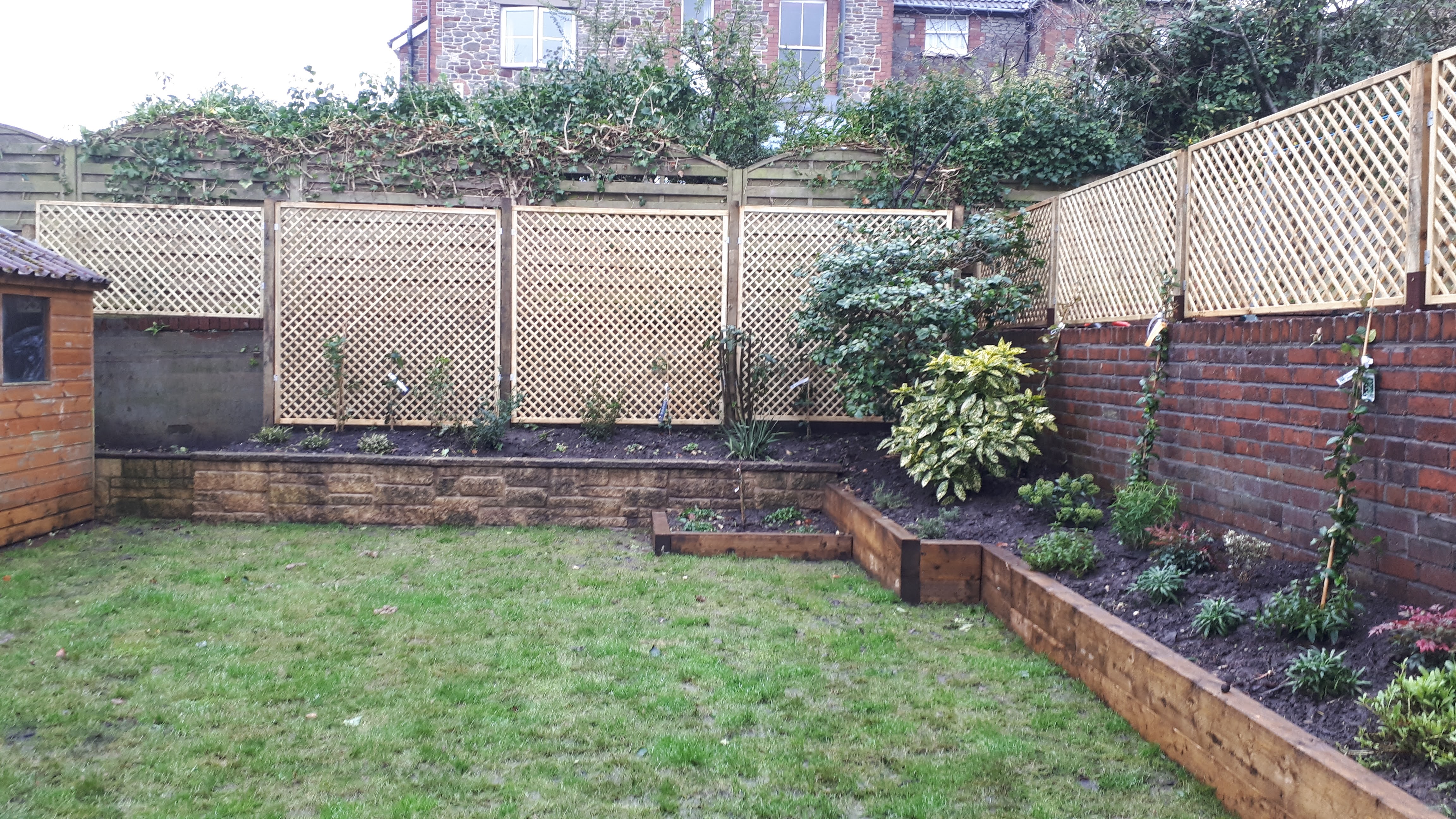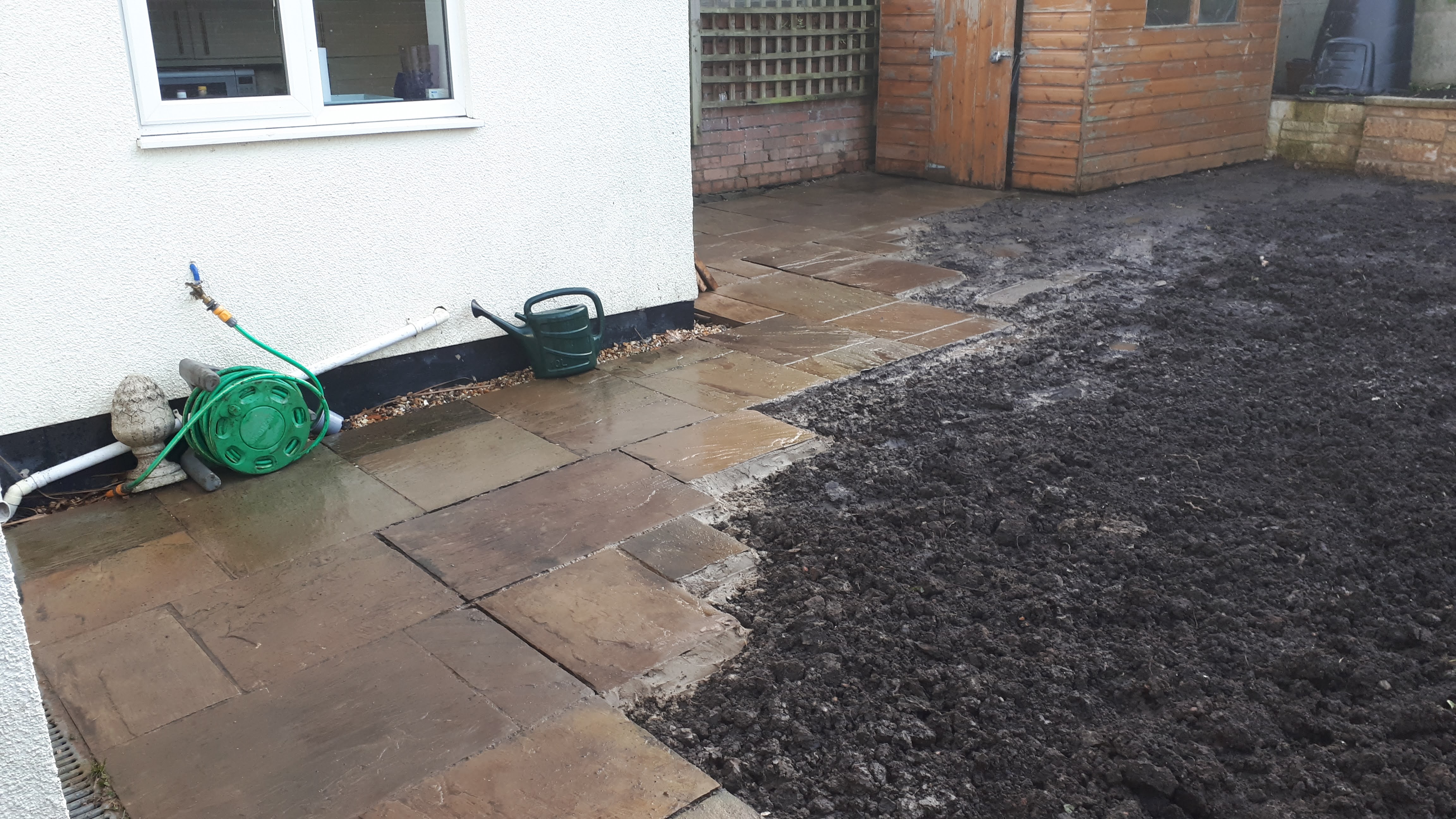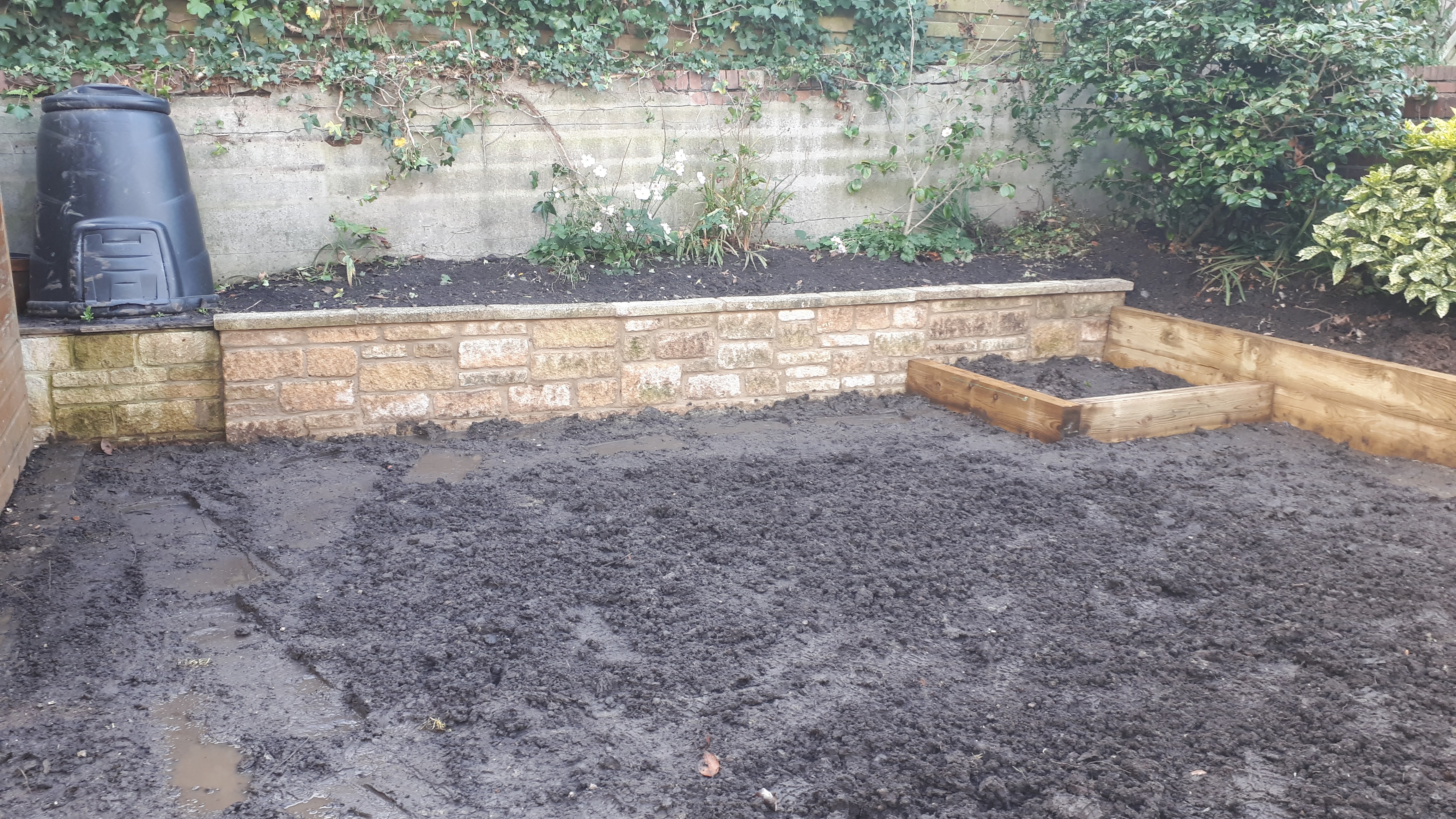 The former garden was heavily sloped, and the client wished to maximize play room for her son. A large volume of soil was removed using a digger and power barrow.