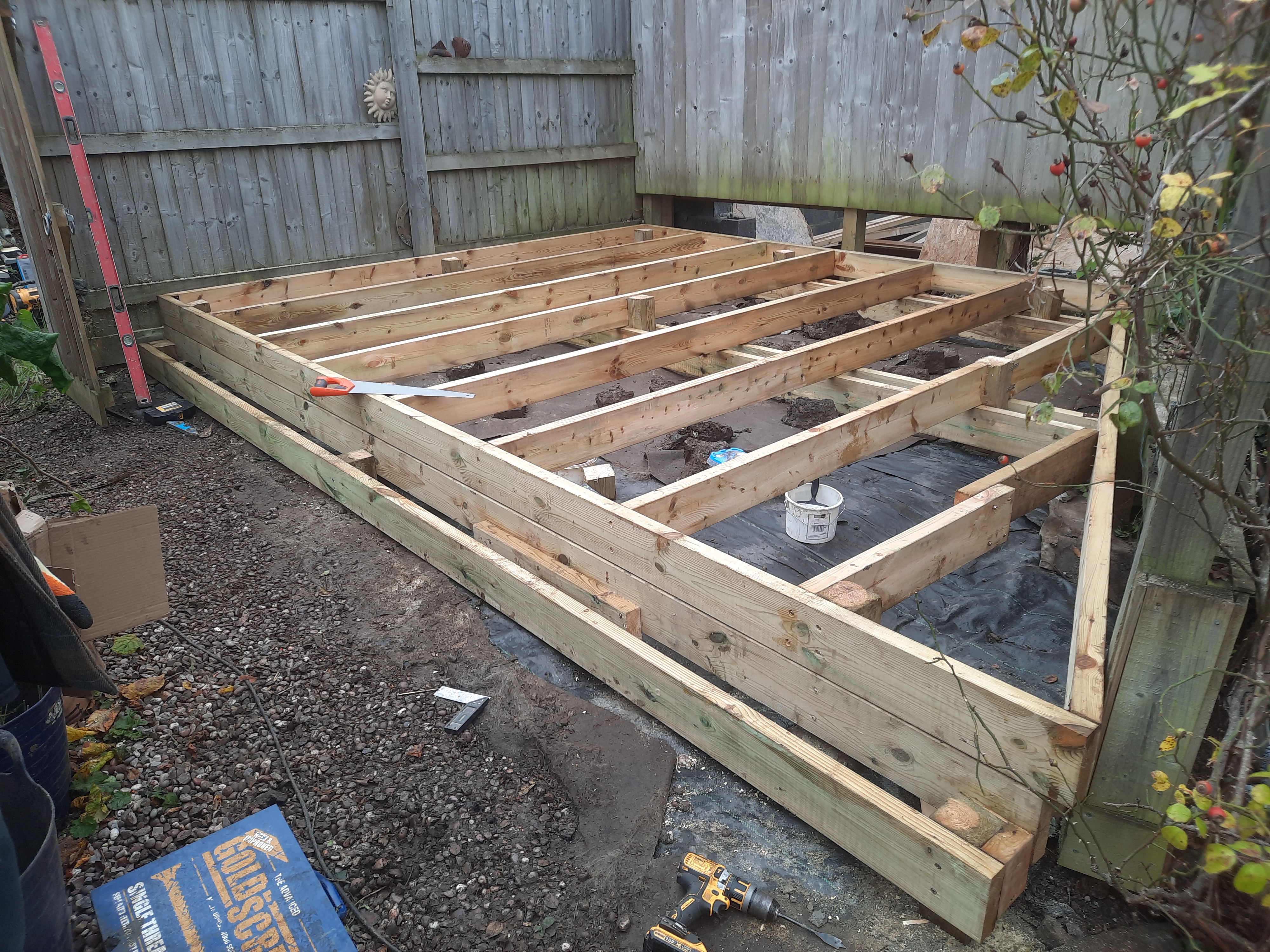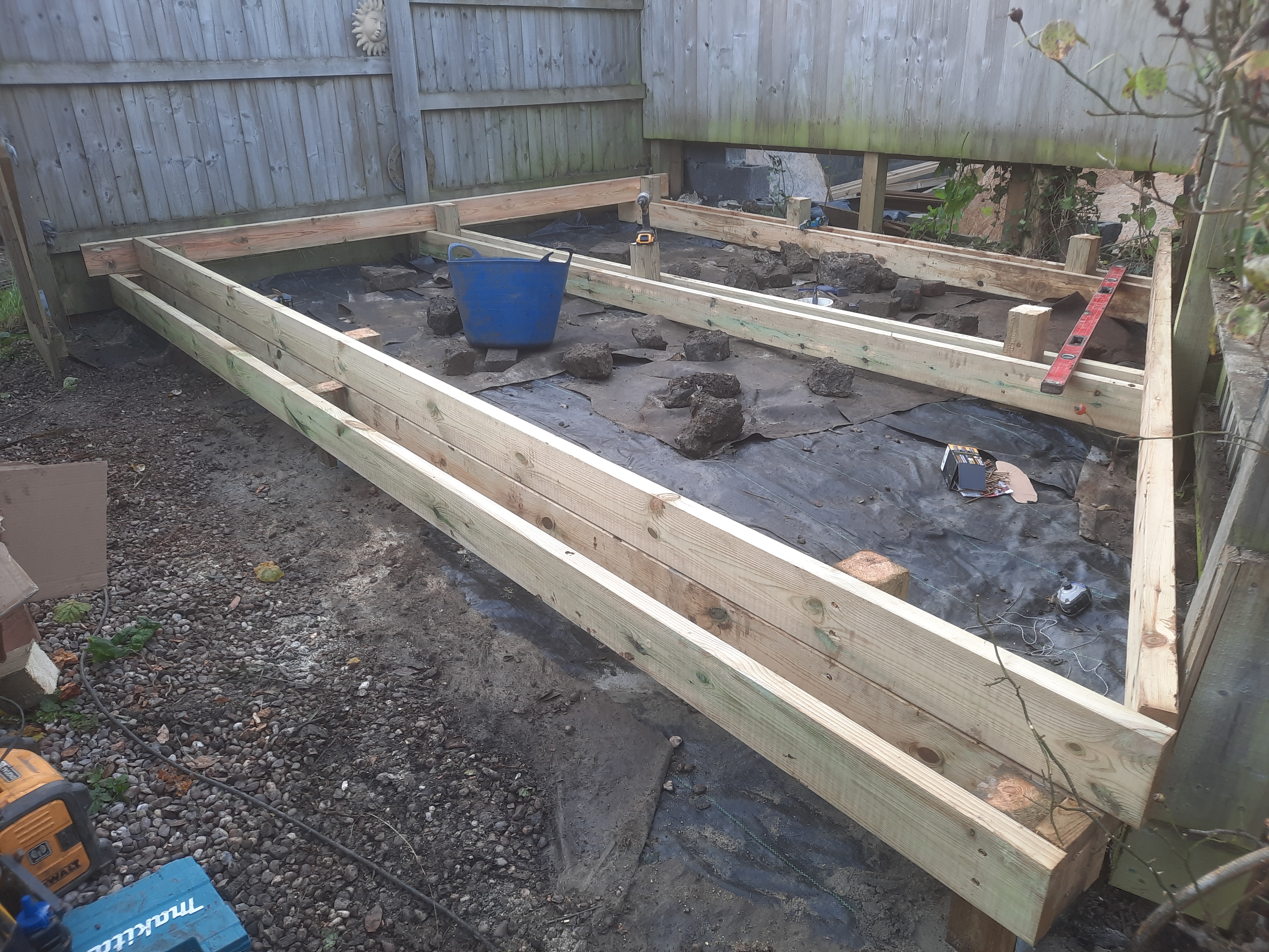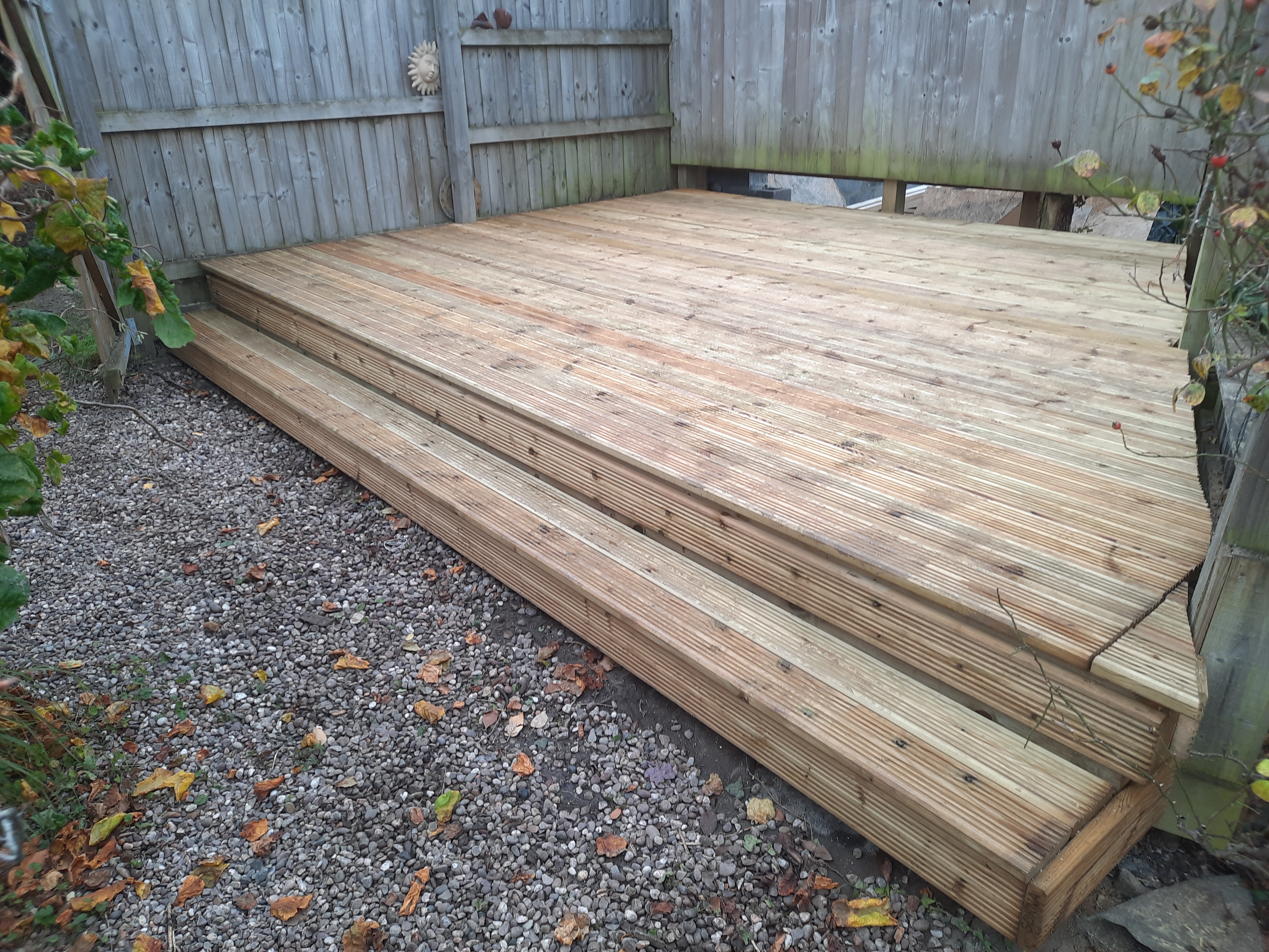 Hardwood decking was investigated, but decided against due to concerns with sustainability and high cost. We opted for high grade tanalised softwood, which was treated with an additional preservative before installation. Additionally, brackets were used to keep all timber parts above ground to minimse rot.