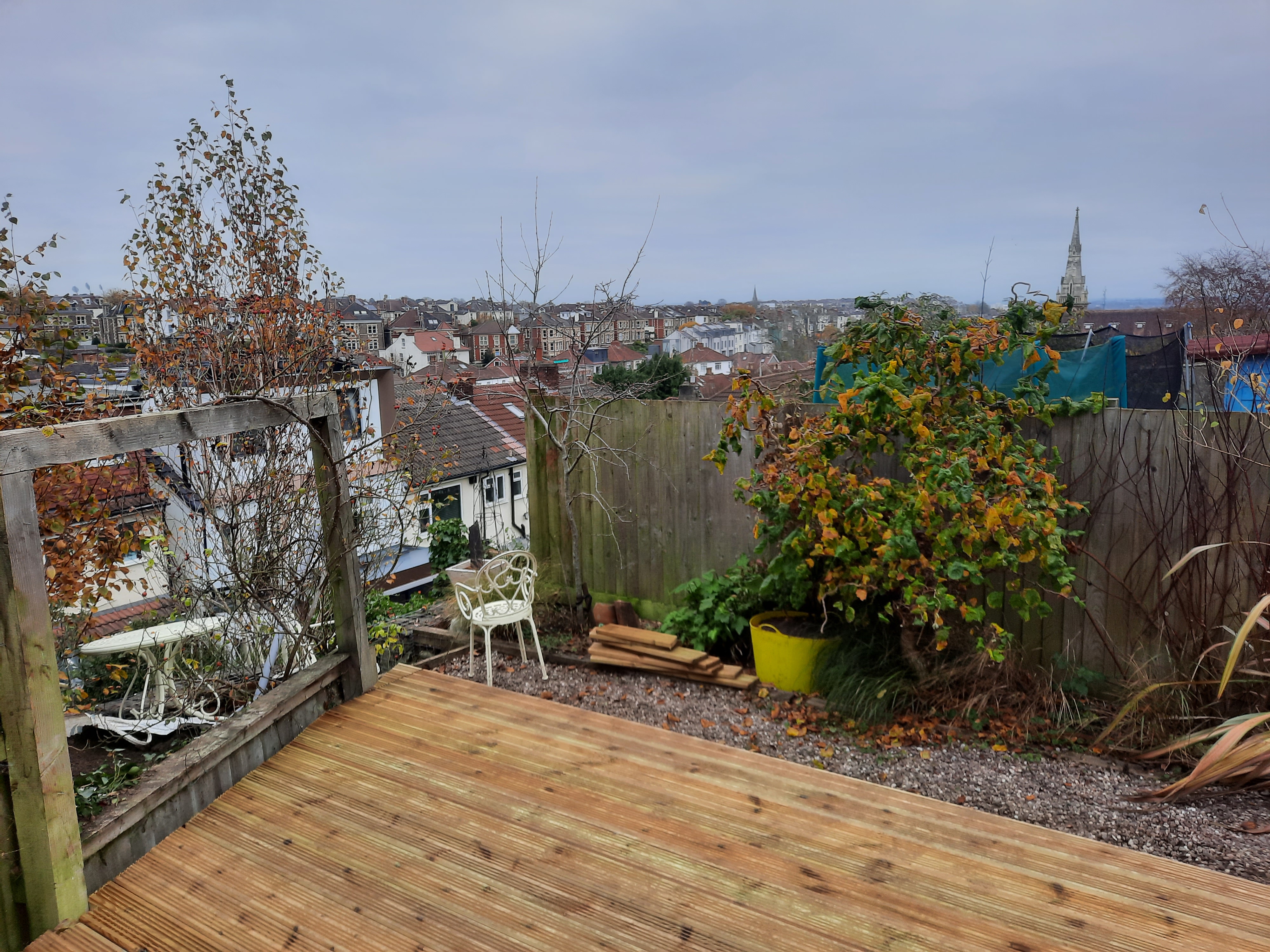 The previous decking and sleeper raised beds had rotted in only 7 years, this was mainly due to contact with the soil contained in the raised sleeper beds which the old deck was nestled within. The client was keen for a more durable solution to enjoy the fabulous view over Bristol.