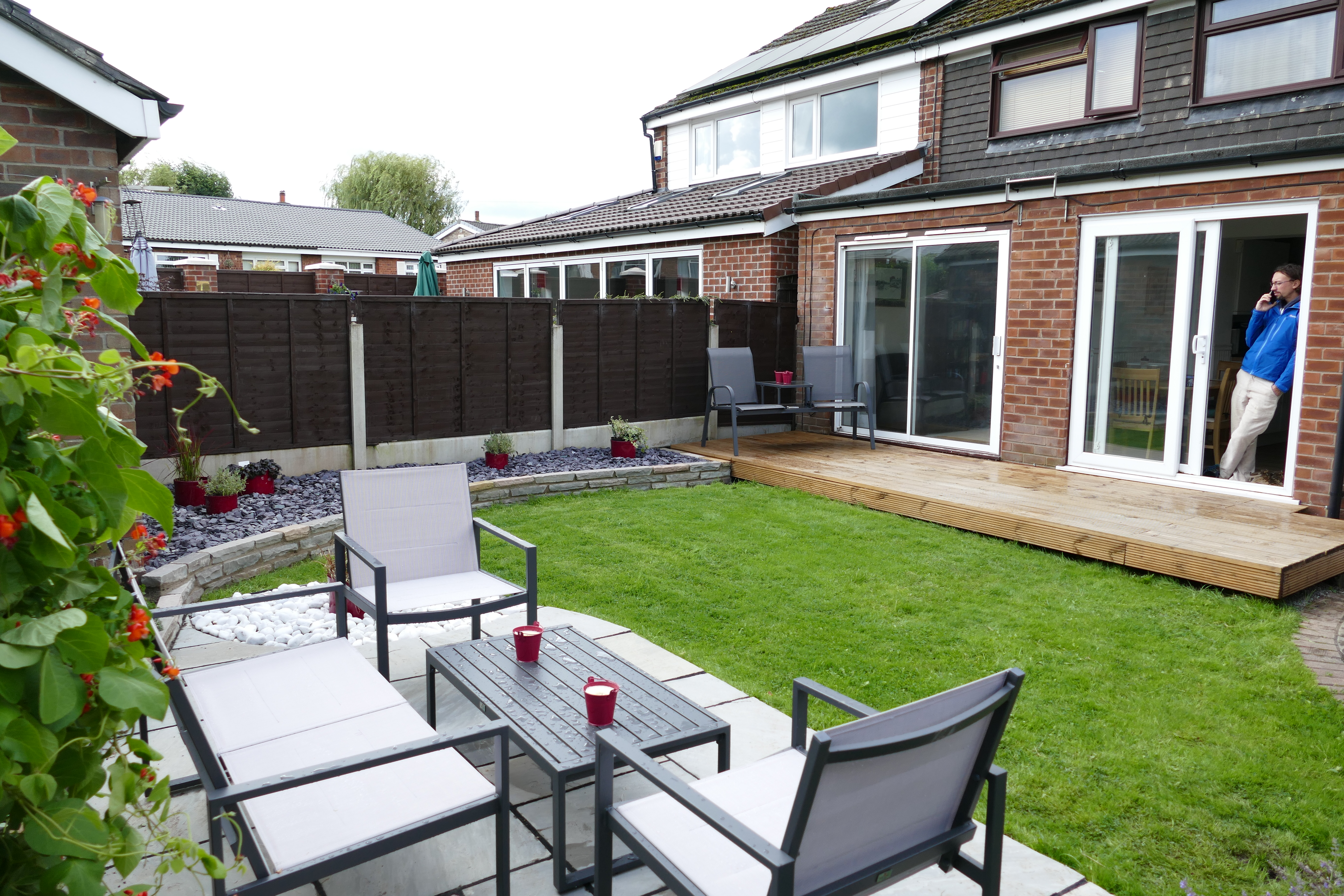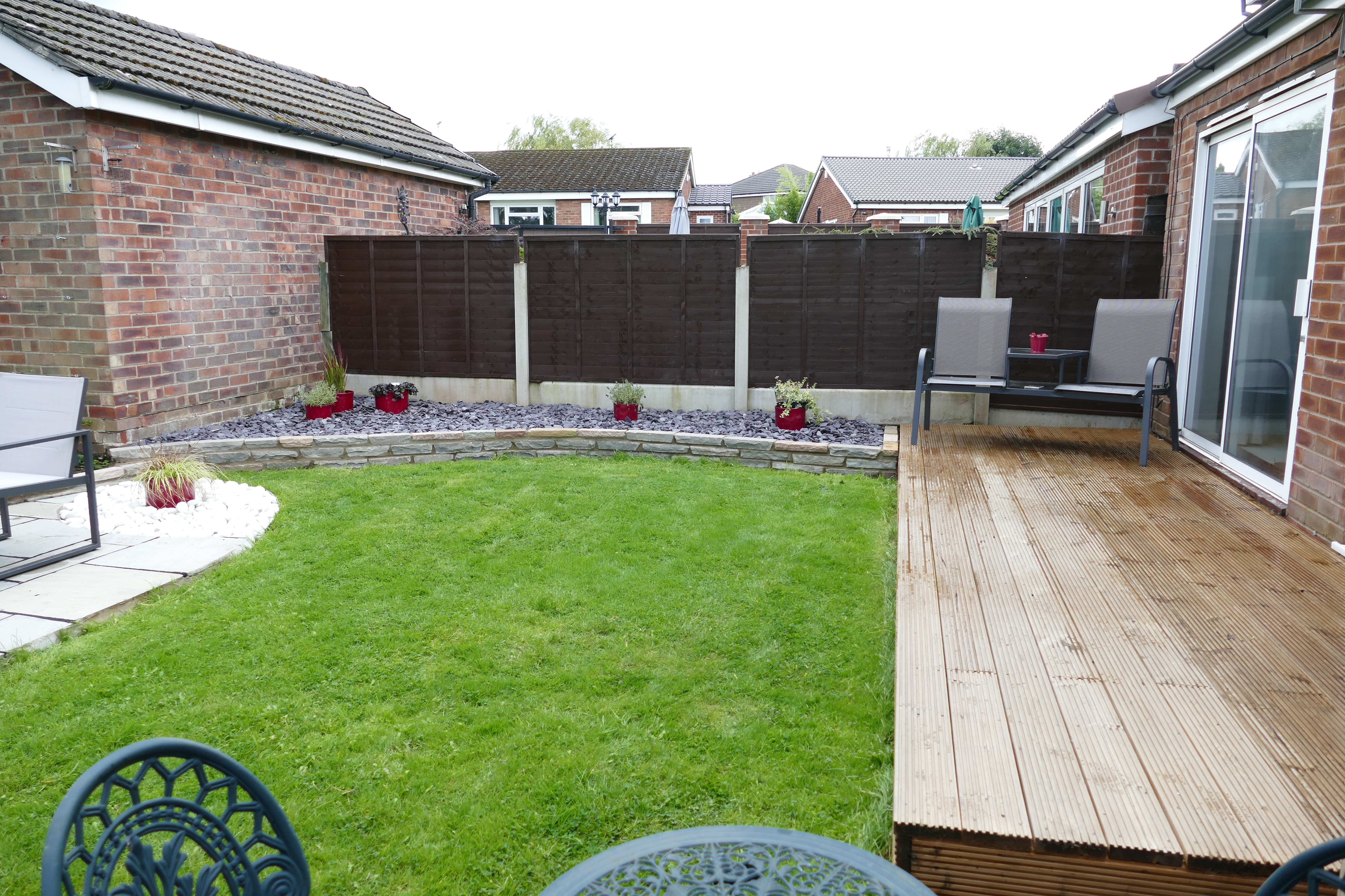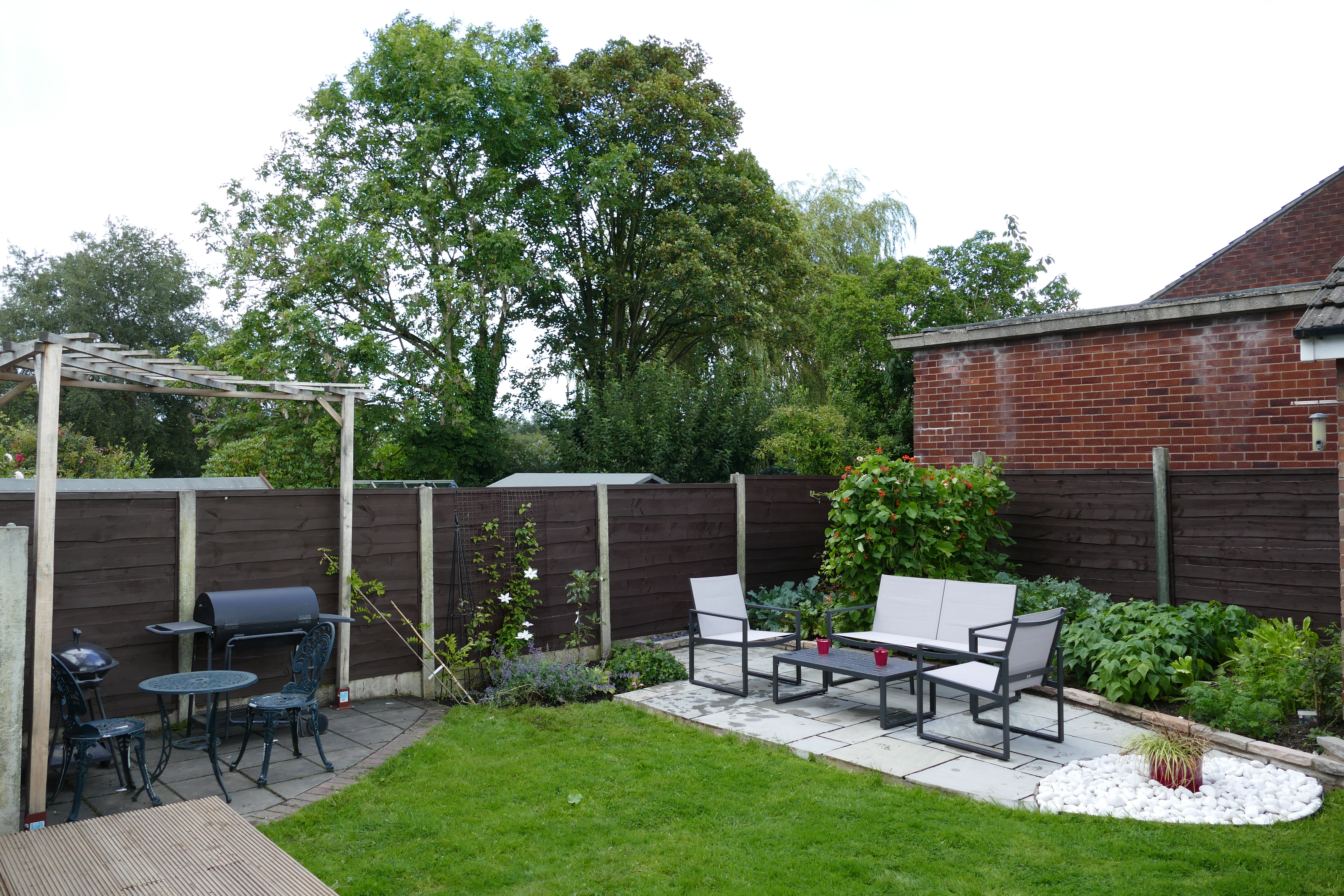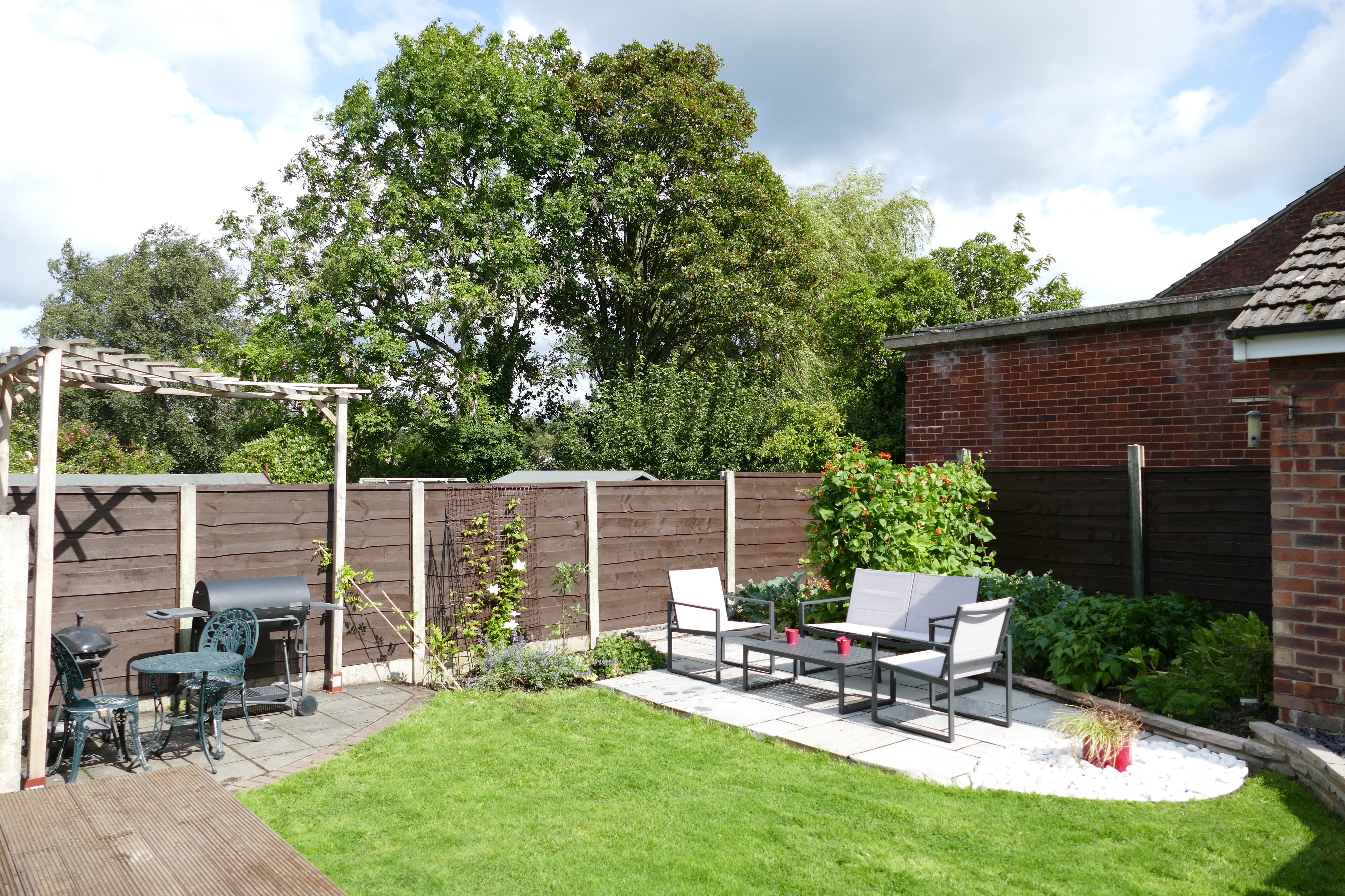 Adjacent to the house, a deck was constructed, to sit on top of, and extend a narrow patio. A custom built small oak pergola was erected in the corner to provide support for a wisteria. A small border was planted including an apple tree.