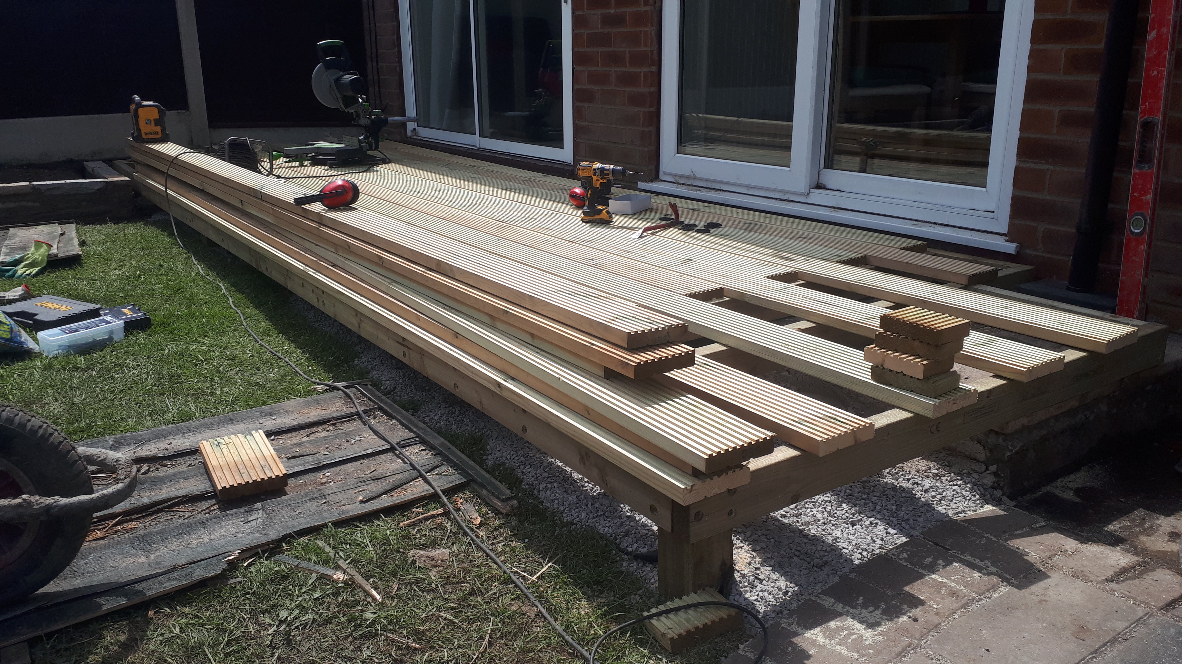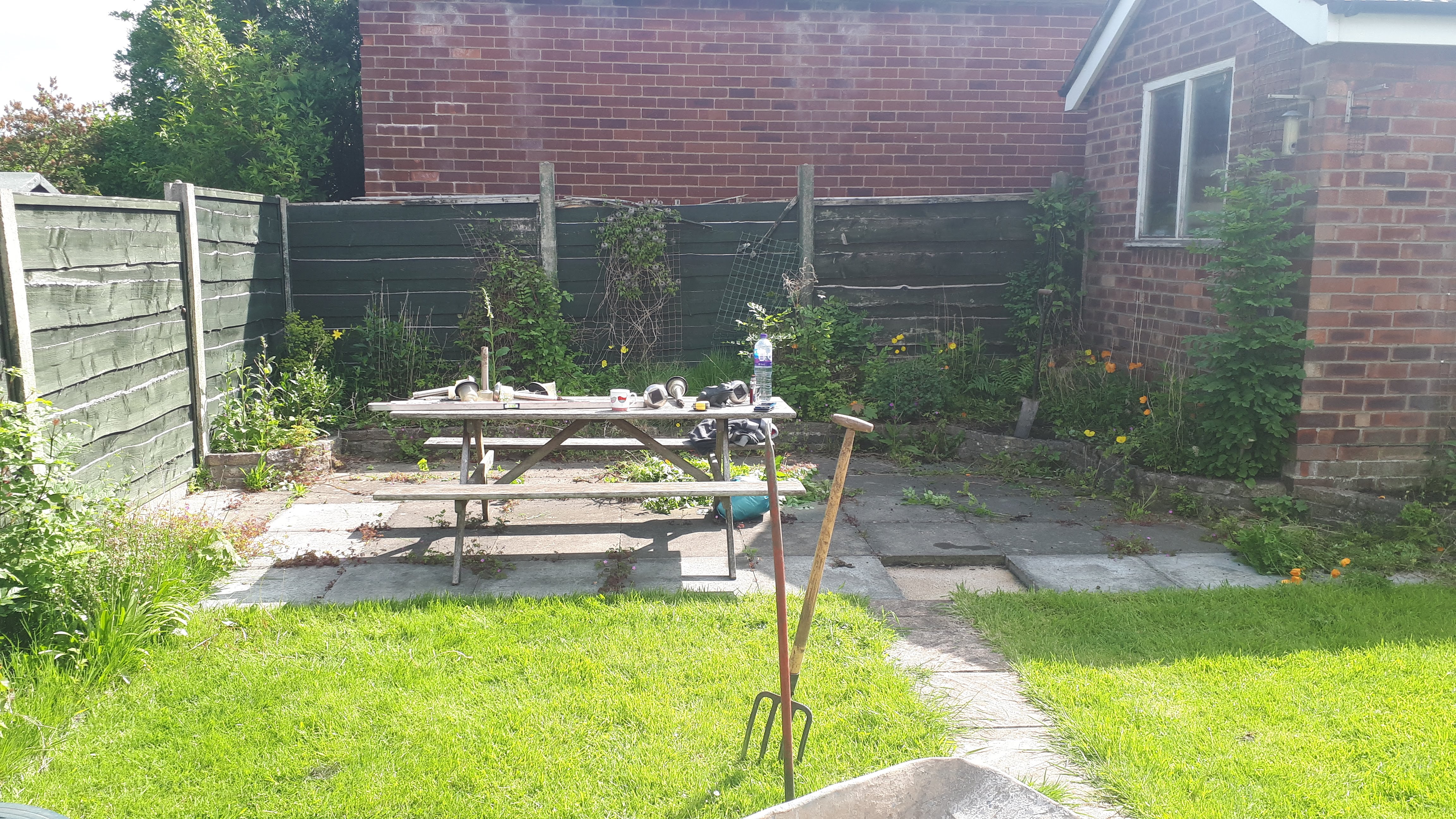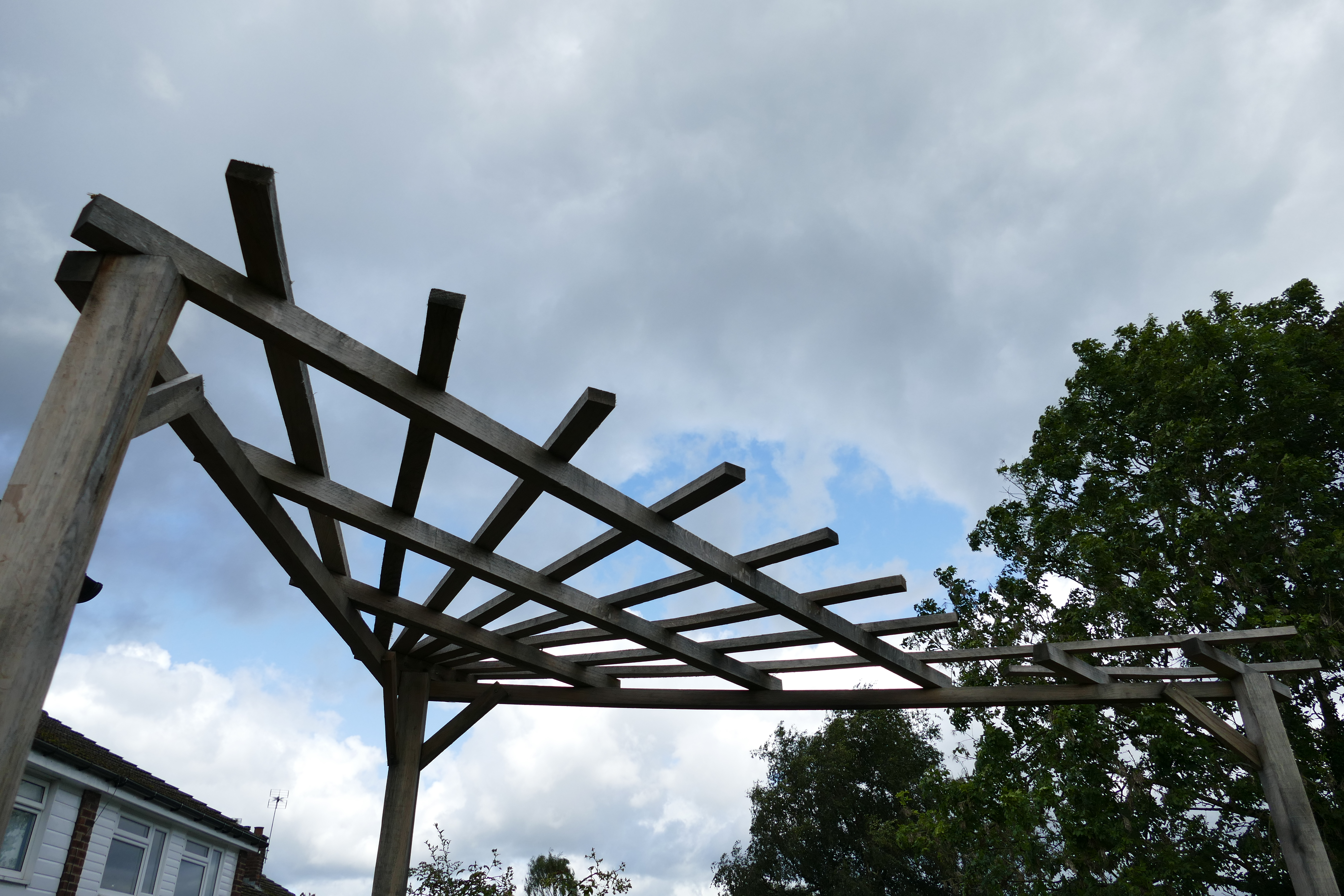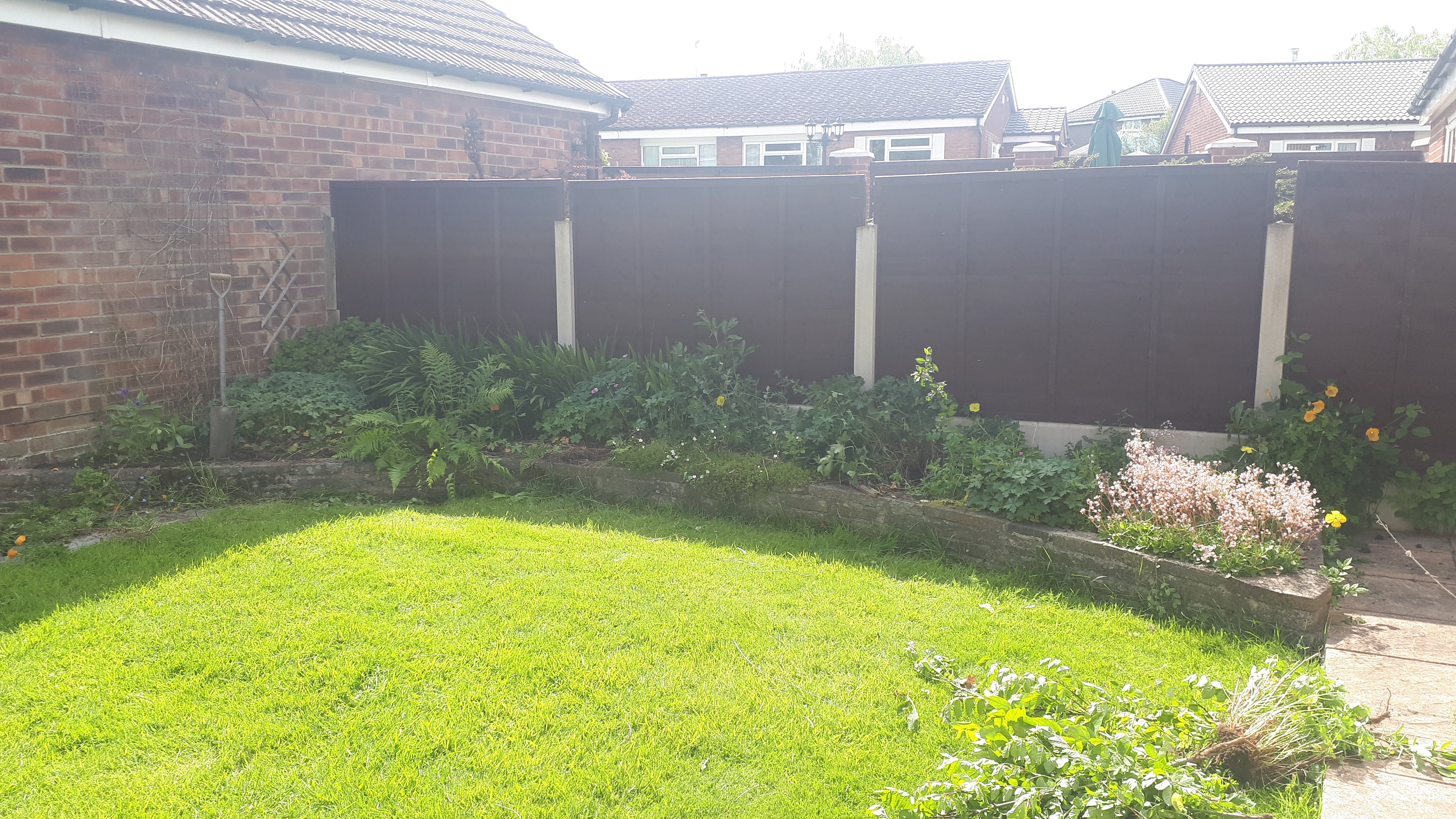 Adjacent to the house, a deck was constructed, to sit on top of, and extend a narrow patio. A custom built small oak pergola was erected in the corner to provide support for a wisteria. A small border was planted including an apple tree.