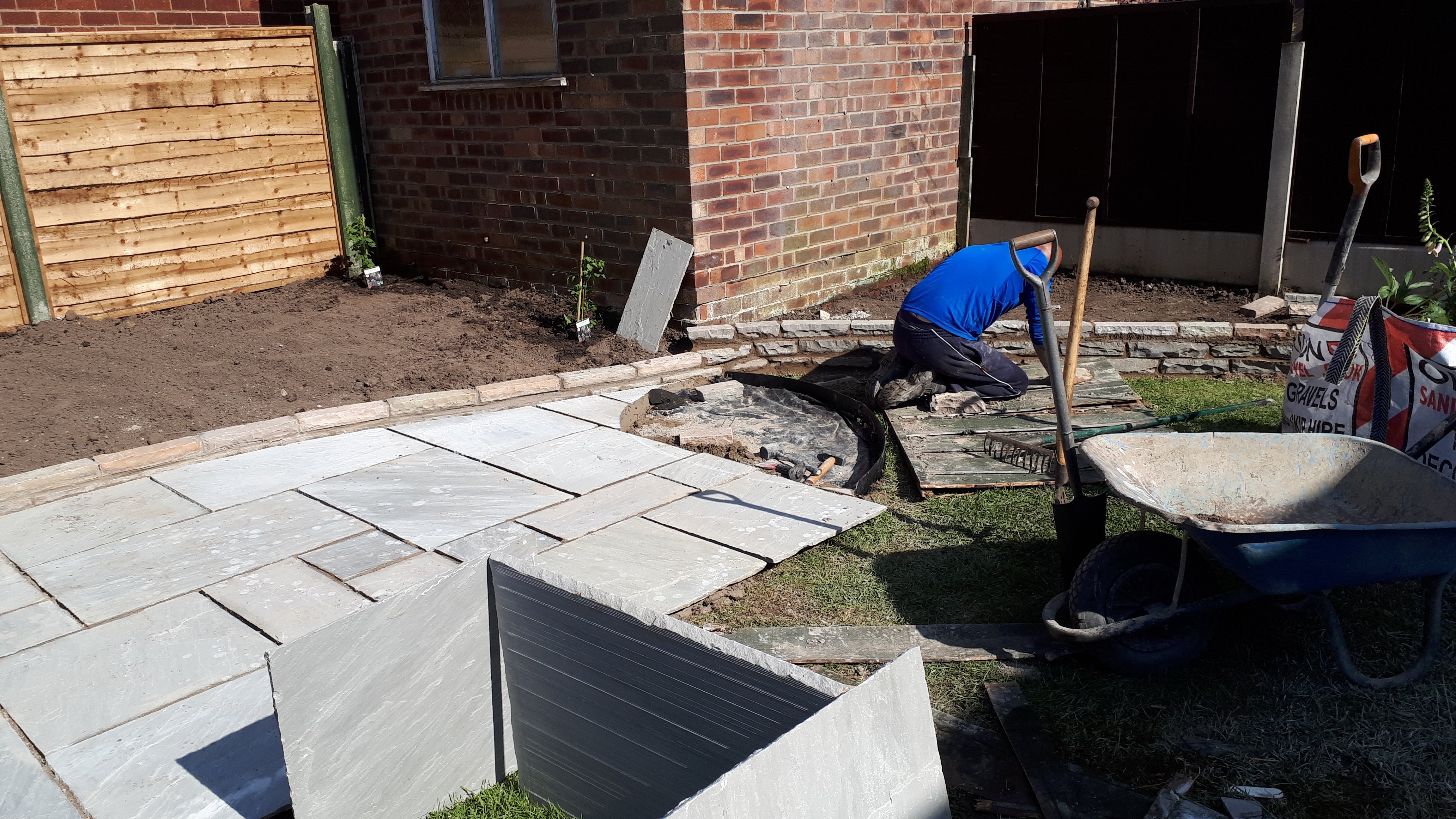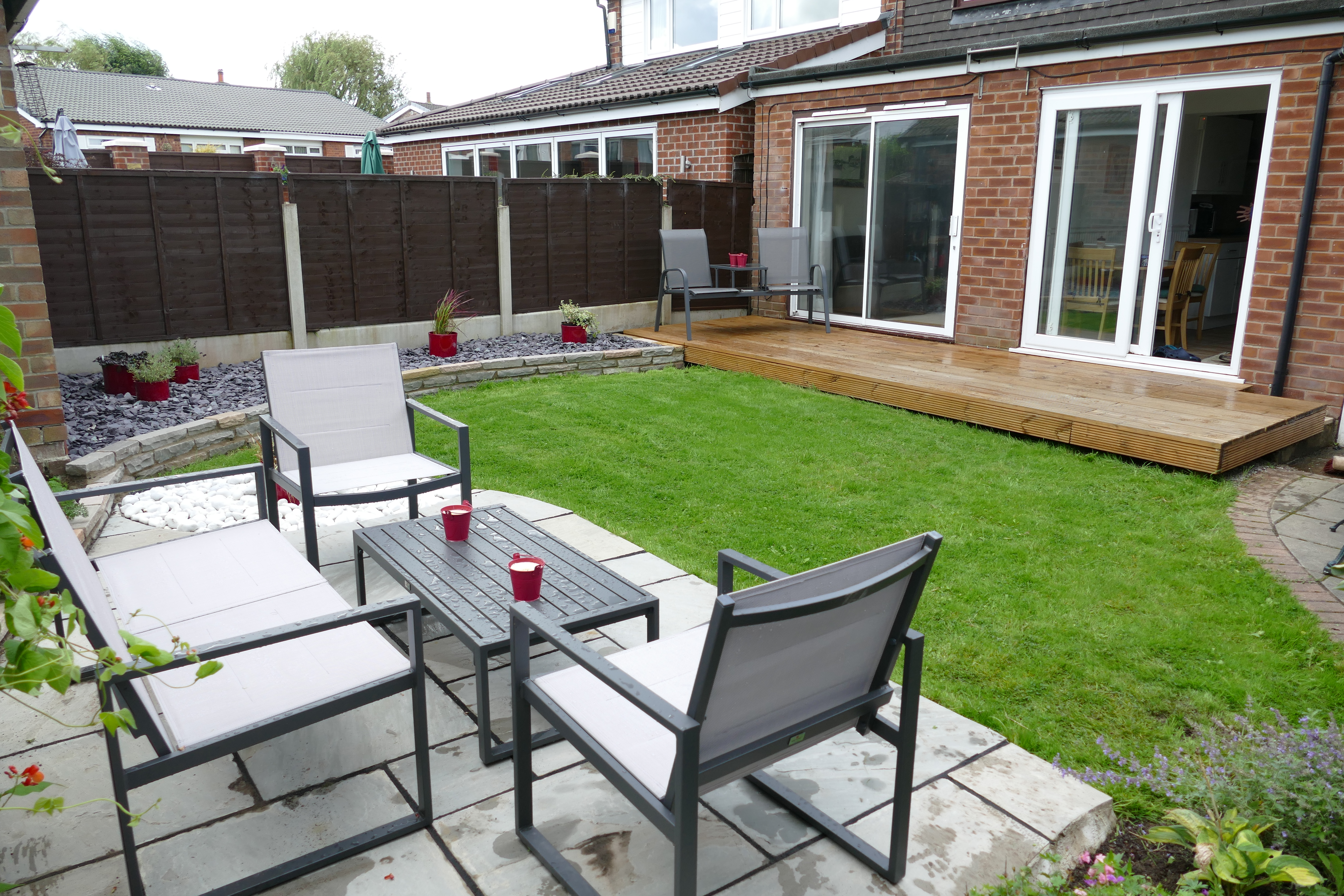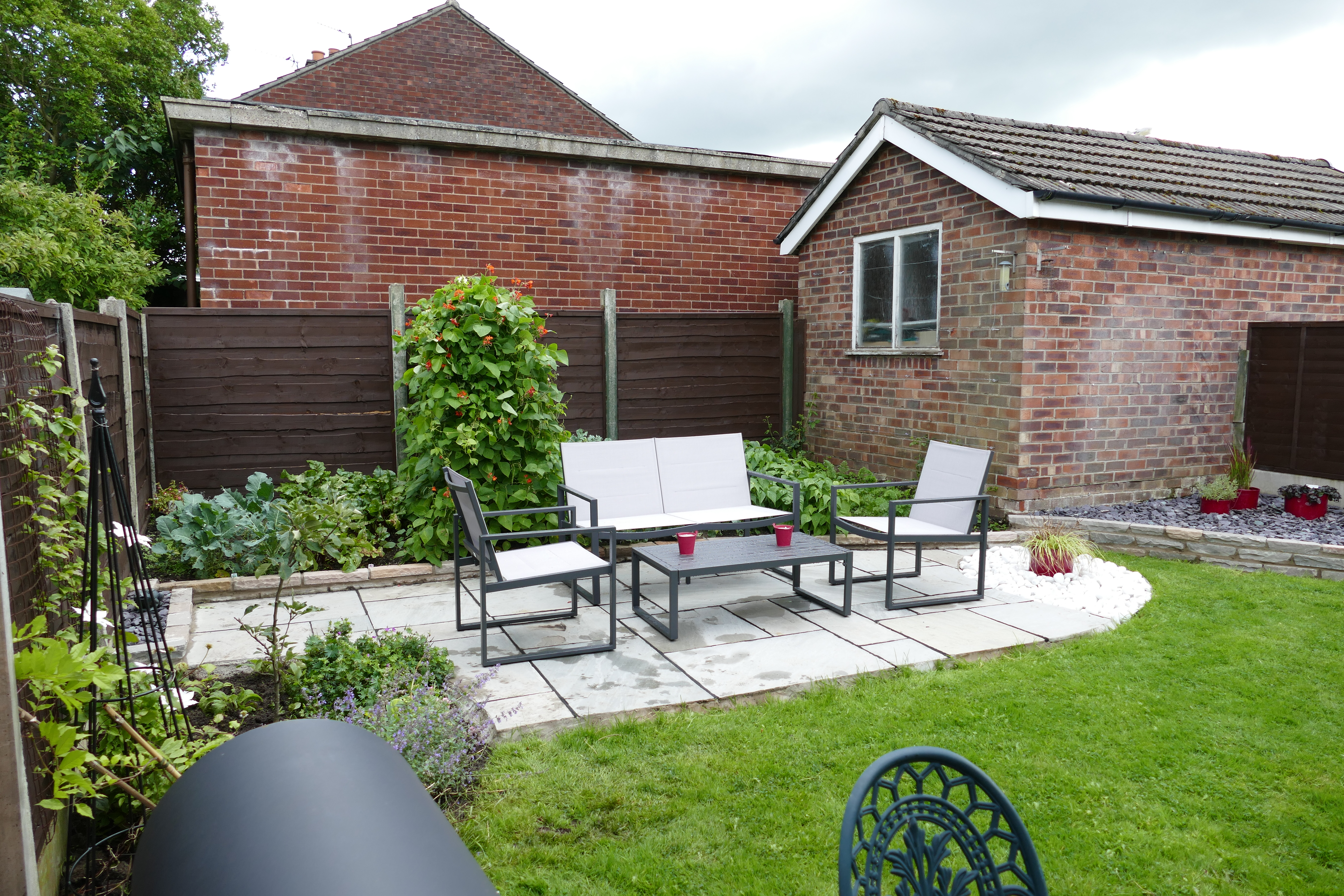 Designed in situ at the first client consultation, and built by our team of three in a week. this was a rewarding job. The client wanted a tidy and unfussy low maintenance garden. A precast concrete flagstone pavement and path was lifted, to be replaced by grey Indian sandstone with an artistic white cobble segment transitioning the patio to the lawn.