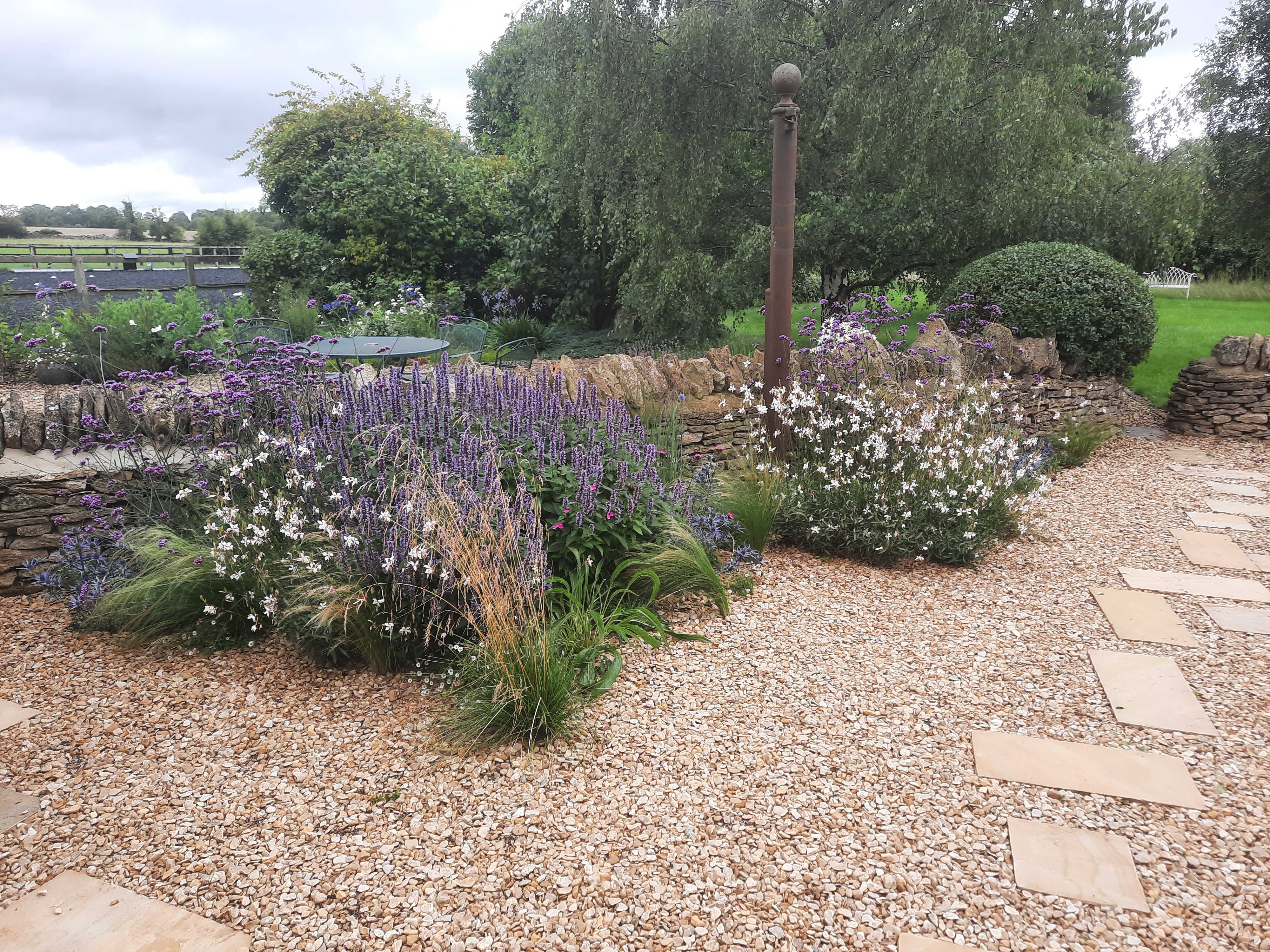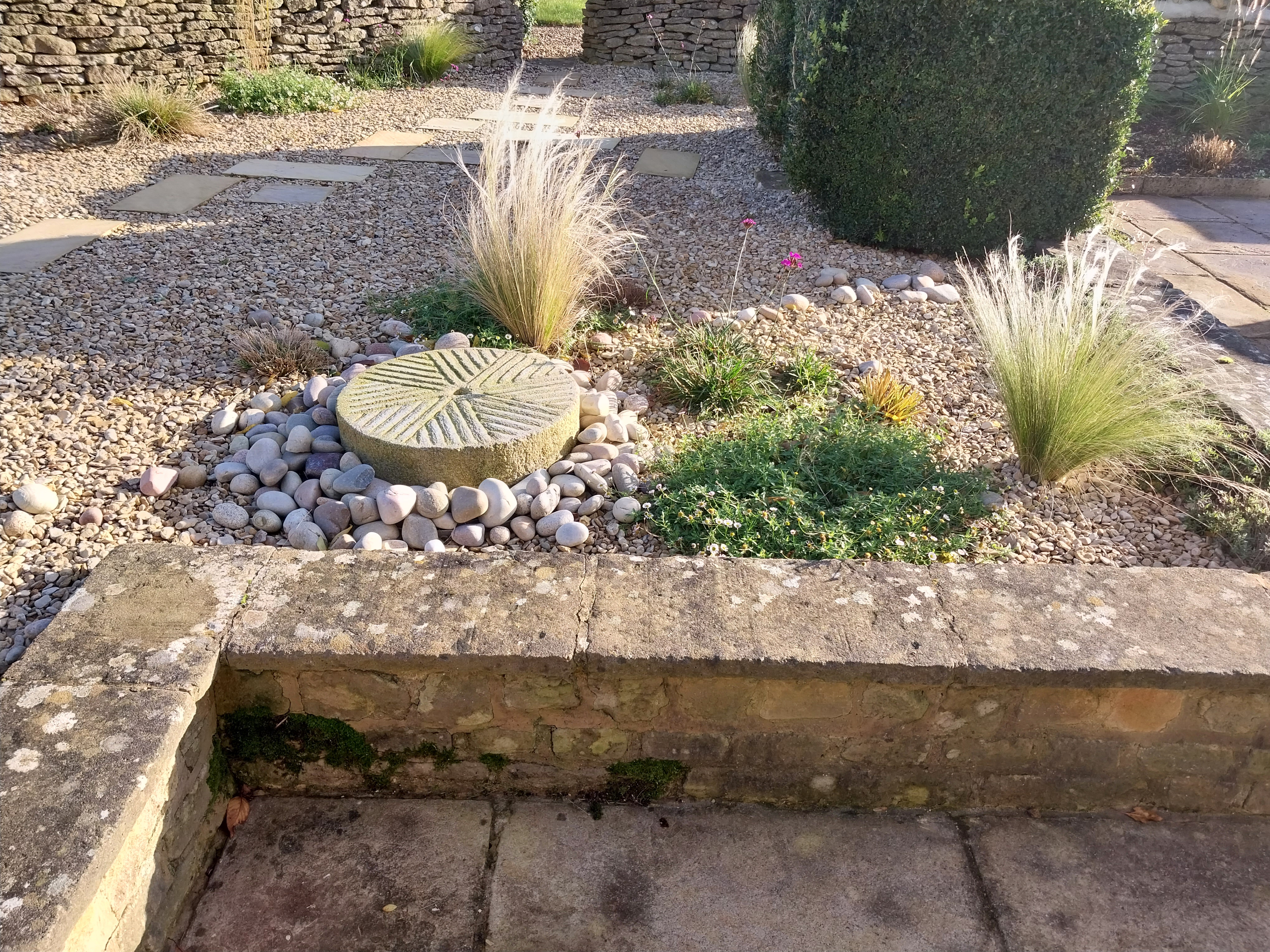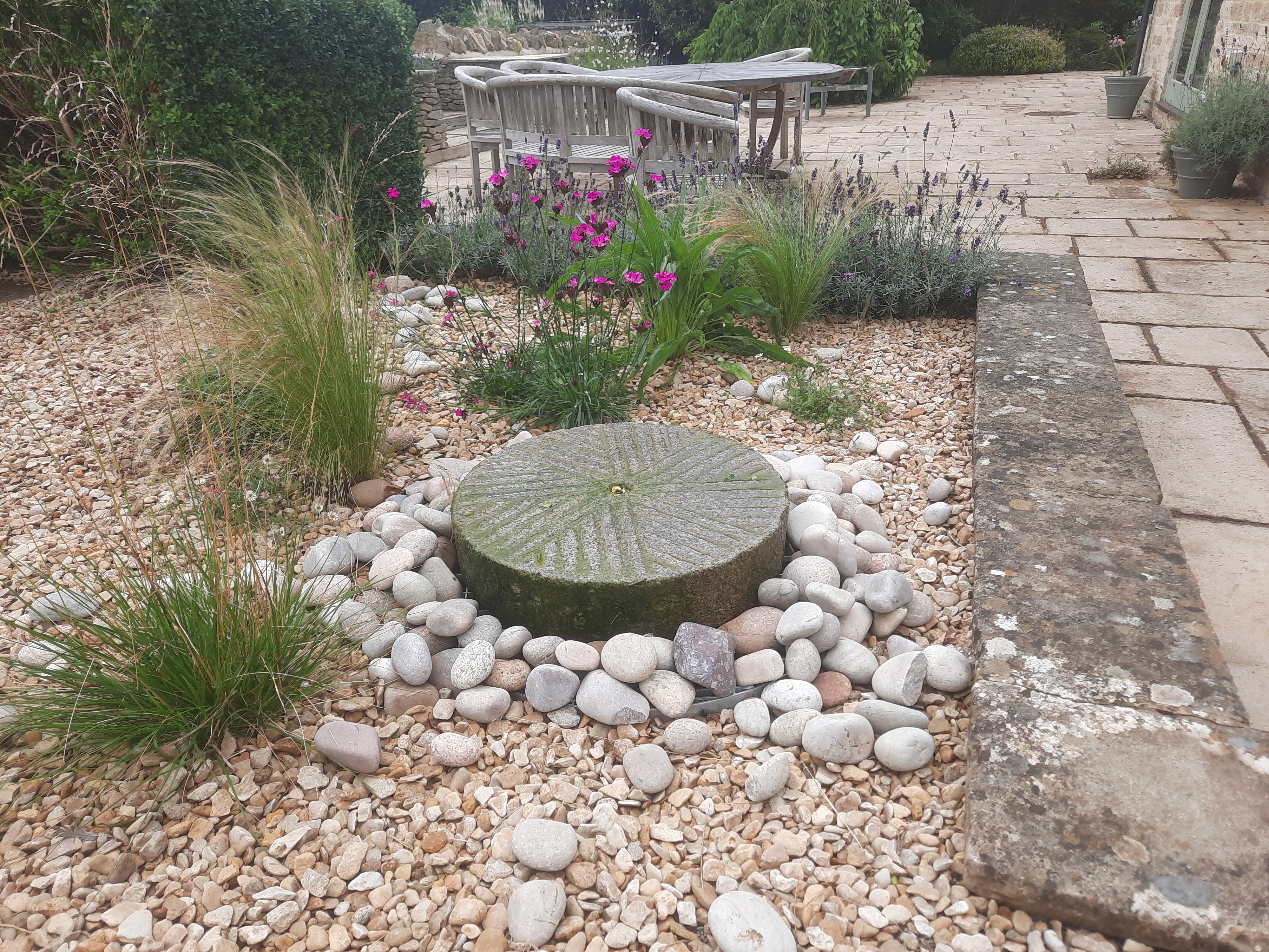 Here a problem transitional area of lawn and shrubs, was transformed into a beautiful gravel garden. Paths were created of flagstones bedded in local cotswold gravel, with weed proof membrane placed under the non-border areas. Water bubbles up over a mill-stone like water feature placed in a viewing spot, surrounded by cobbles. Border areas were created in the gravel, with enriched soil, due to the poor and rocky ground in this site, and with mulching not being an option in a gravel garden. Planting for the dry sunny site, included plants such as Erigeron, Echnopsis, Salvia, Echinacea, Eryngium, and Stipa.