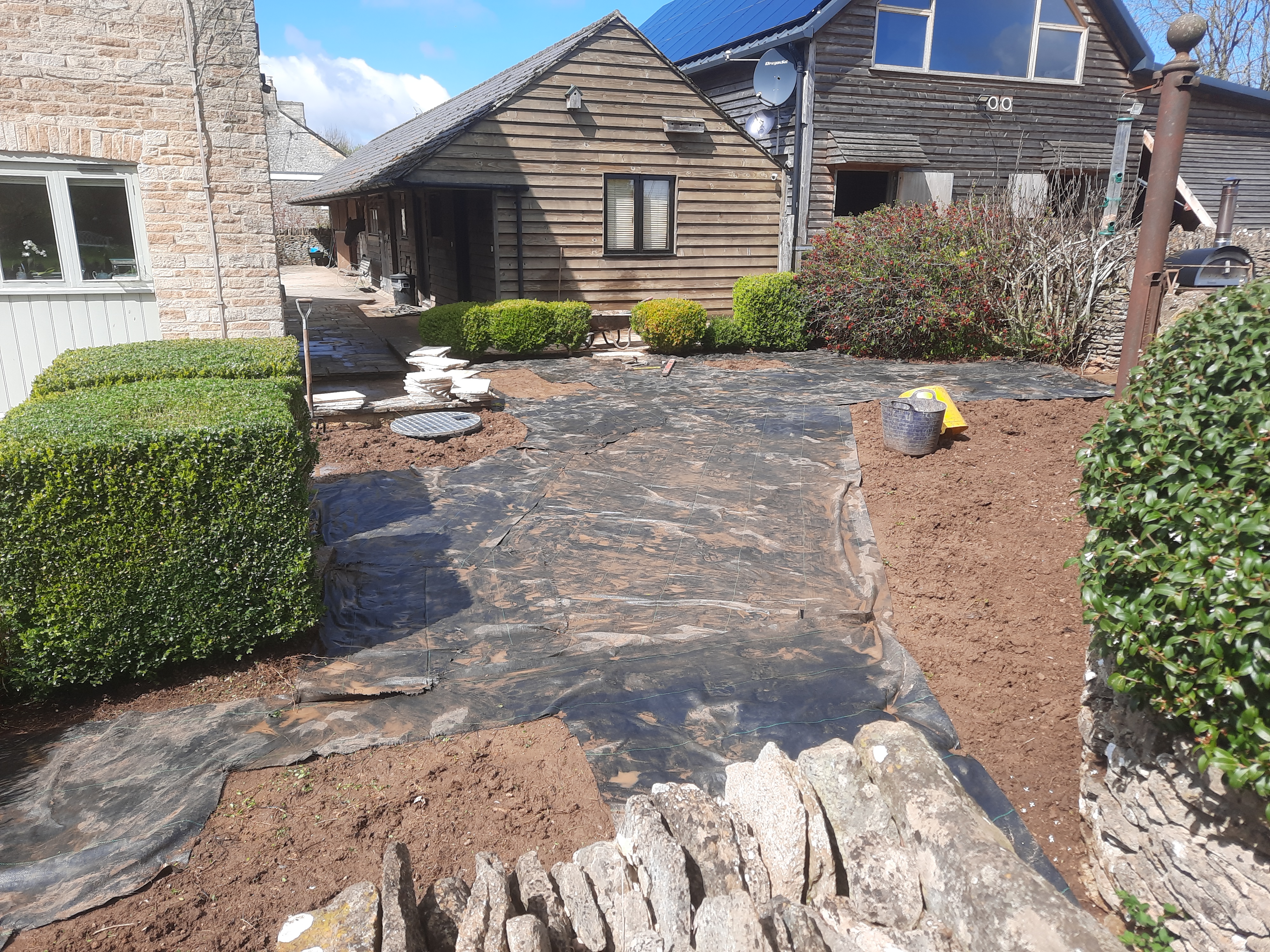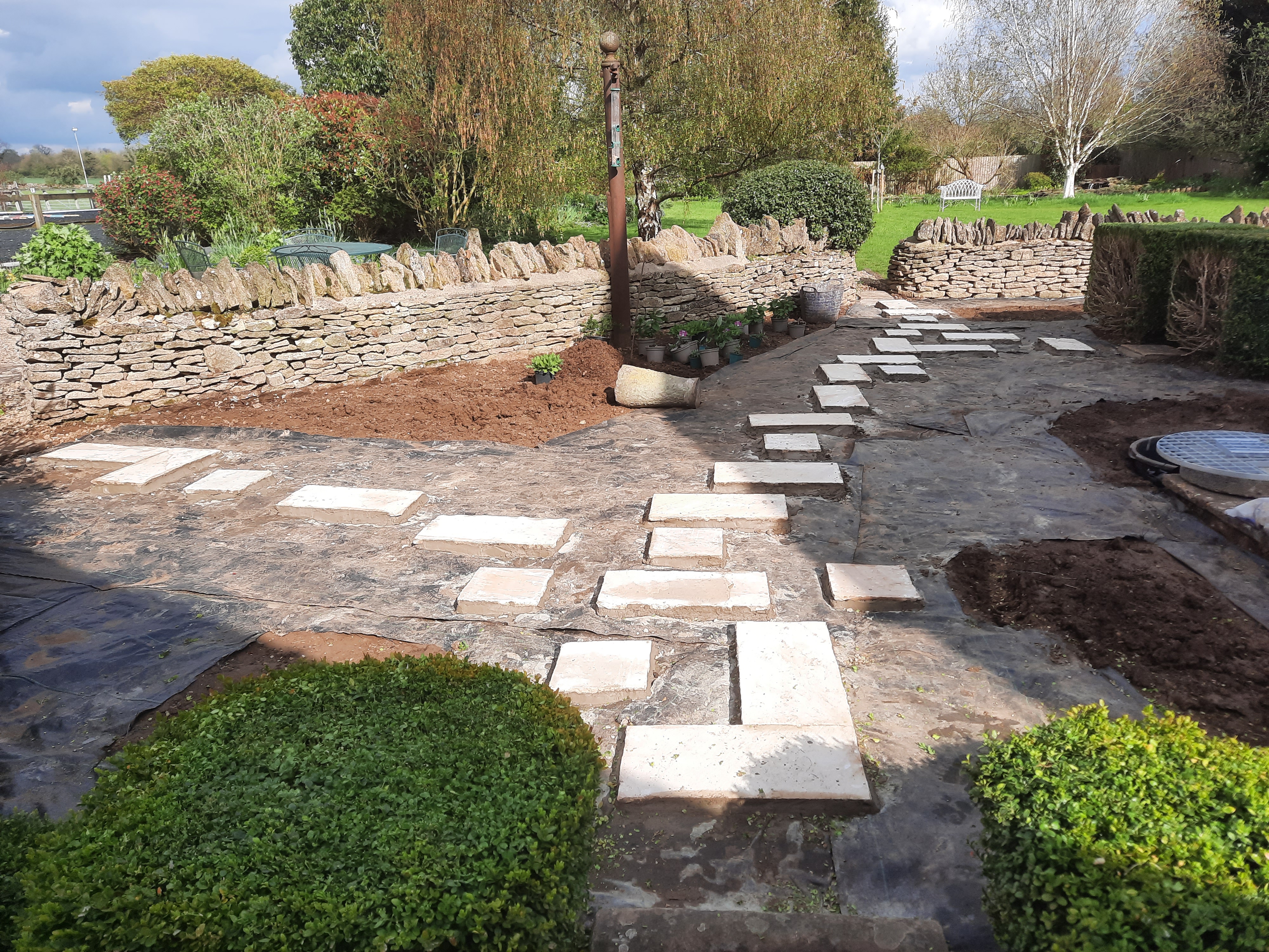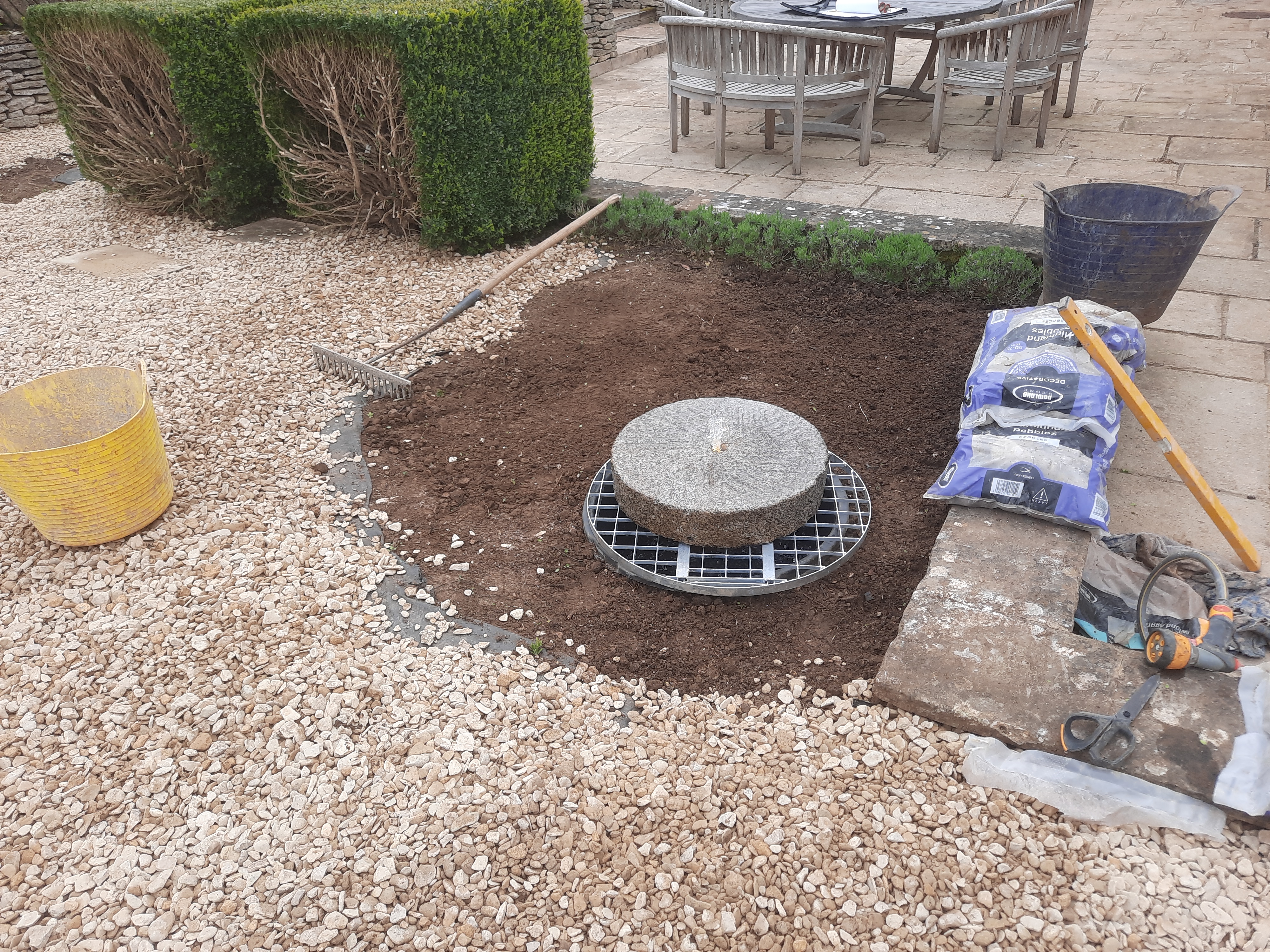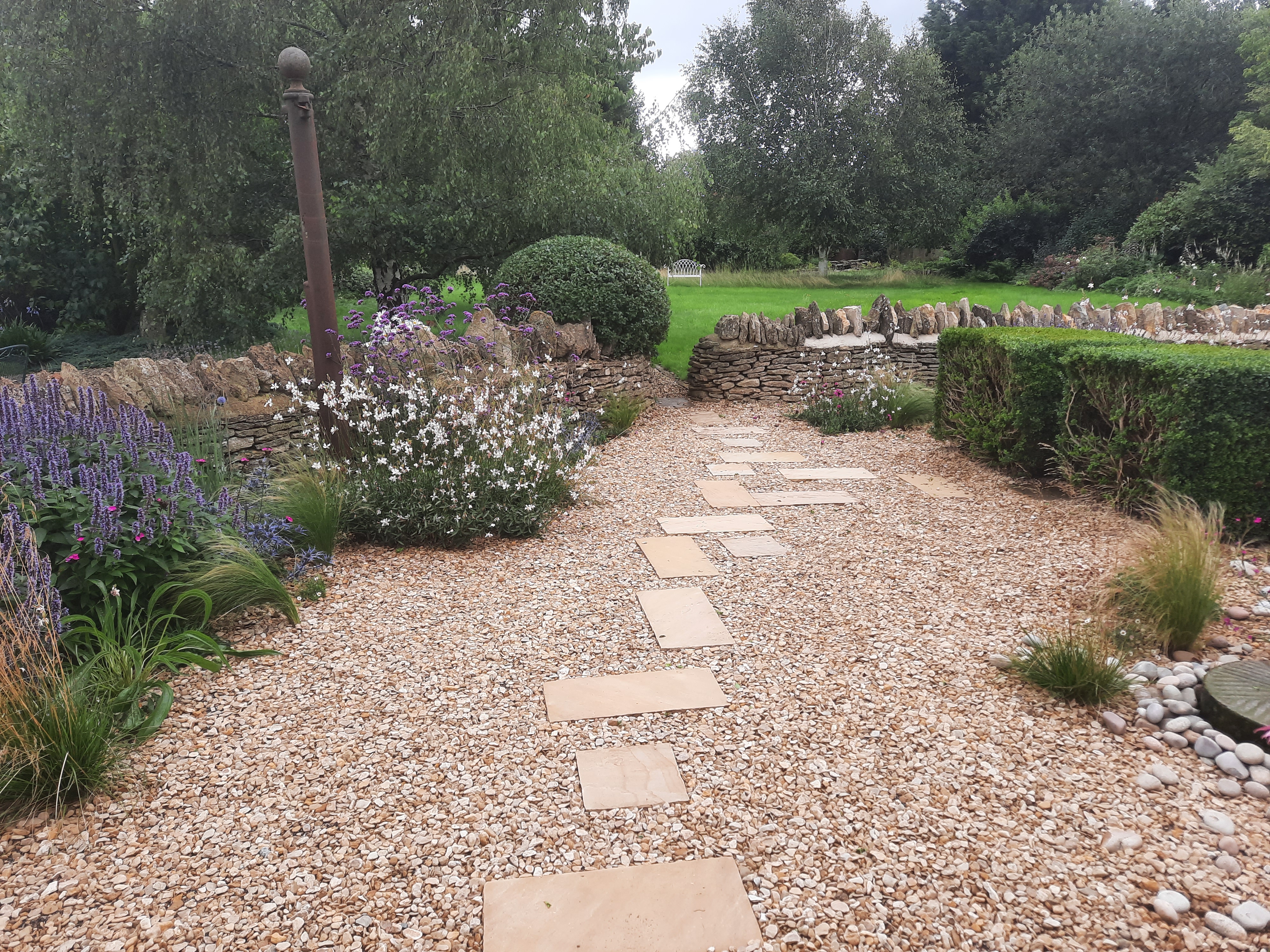 Here a problem transitional area of lawn and shrubs, was transformed into a beautiful gravel garden. Paths were created of flagstones bedded in local cotswold gravel, with weed proof membrane placed under the non-border areas. Water bubbles up over a mill-stone like water feature placed in a viewing spot, surrounded by cobbles. Border areas were created in the gravel, with enriched soil, due to the poor and rocky ground in this site, and with mulching not being an option in a gravel garden. Planting for the dry sunny site, included plants such as Erigeron, Echnopsis, Salvia, Echinacea, Eryngium, and Stipa.